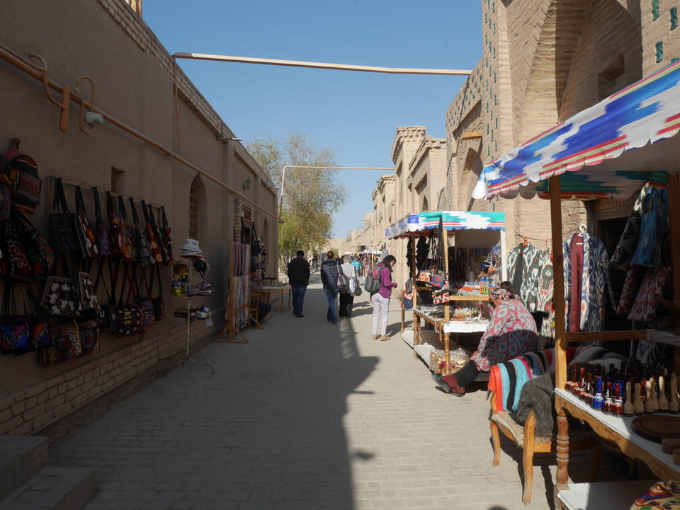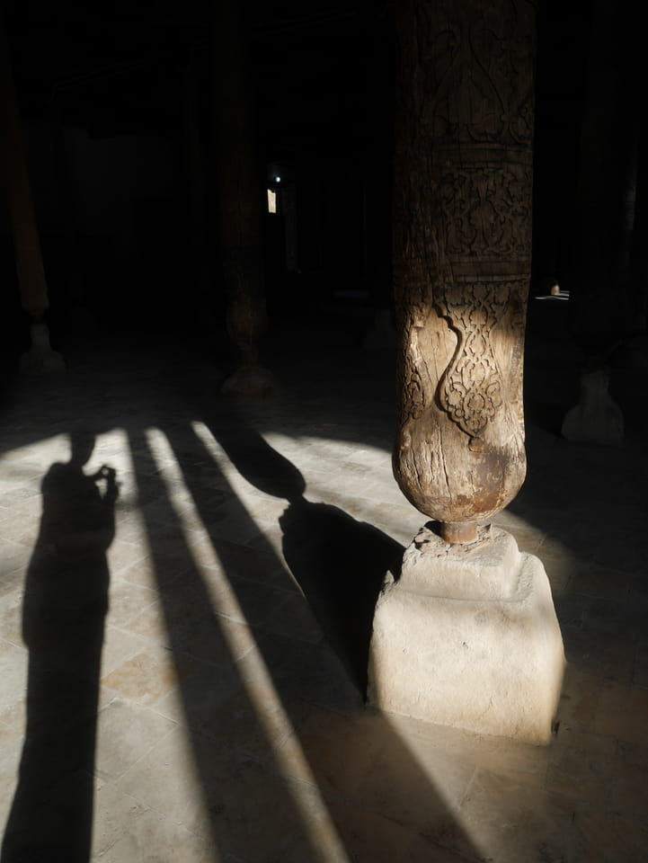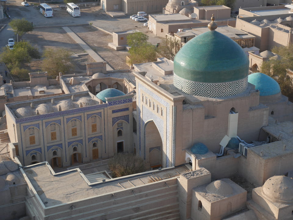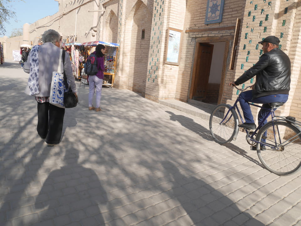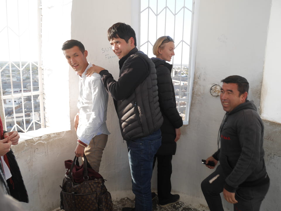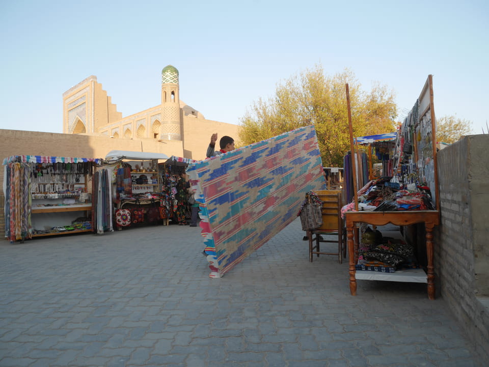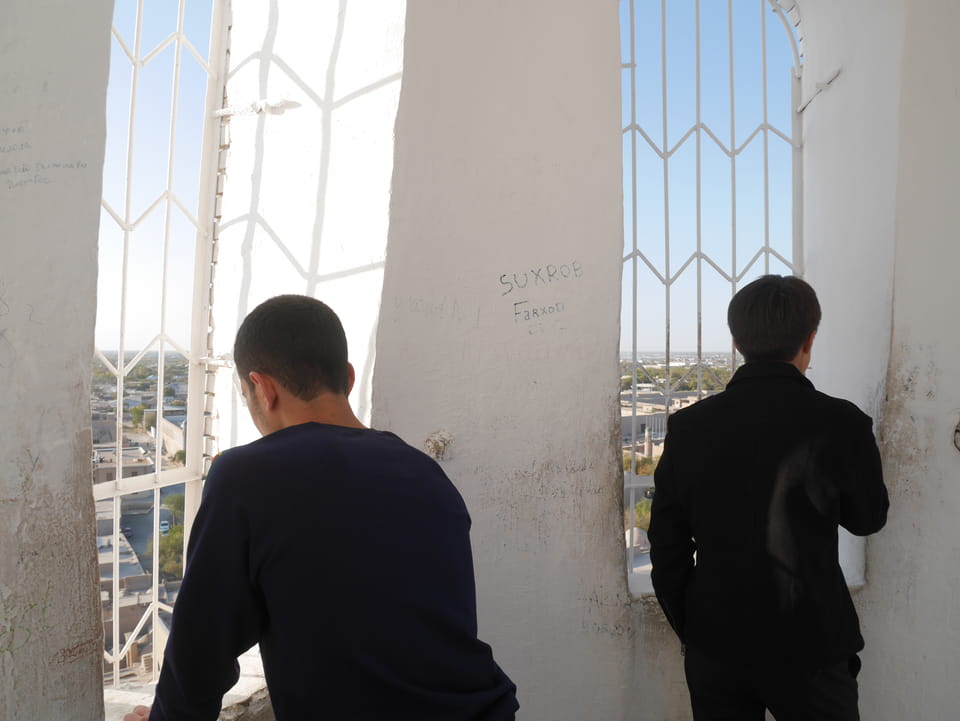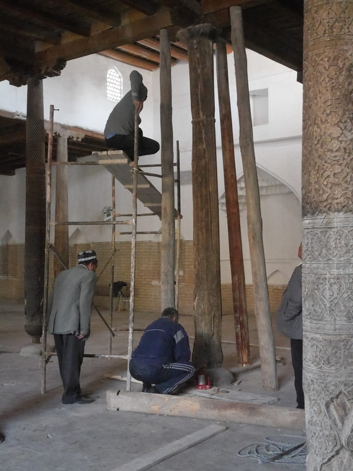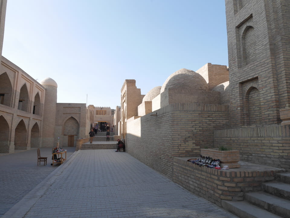 Ich guckte bissel planlos herum, wollte Eintrittsgelder vermeiden. Die vielen hölzernen Träger in der Djuma Moschee waren teils aufwändig verziert. Das Islam Khoja Minaret dann aber war das Highlight heute, denn man konnte da hoch klettern. Eine Frau kassierte 100 Som ab (€1,10) wobei ich klar machte, da bis zu zwei Mal hochzukraxeln. Ich wollte später gegen Sonnenuntergang nochmal hoch.
