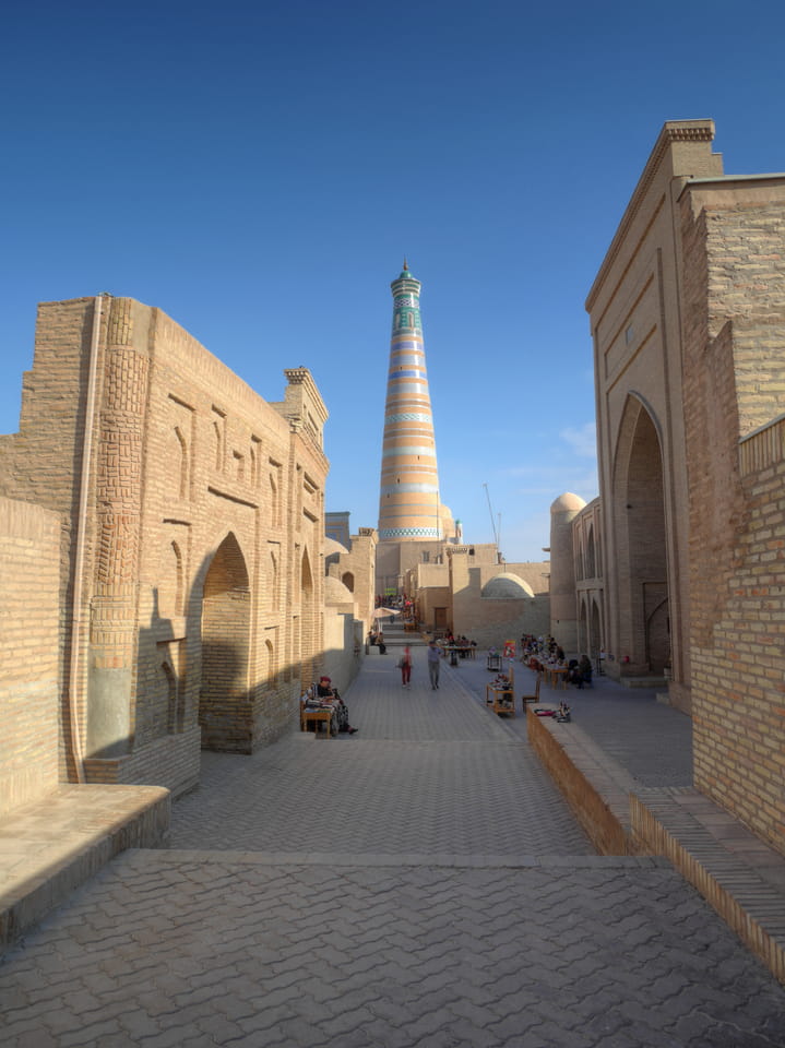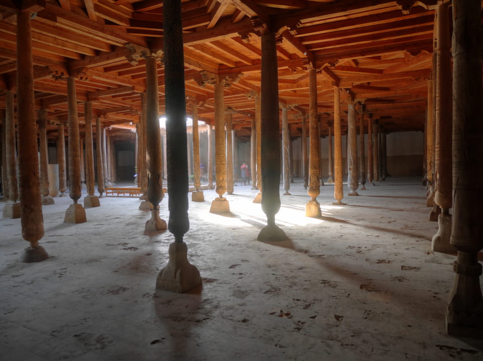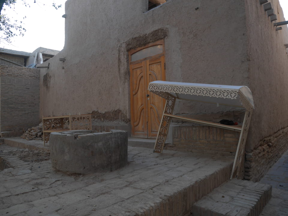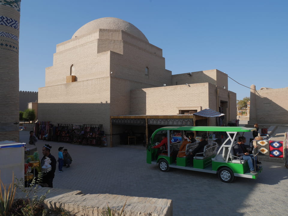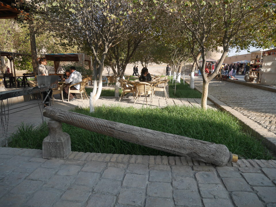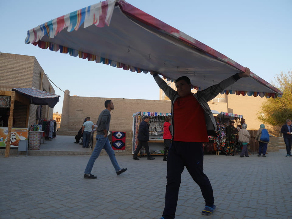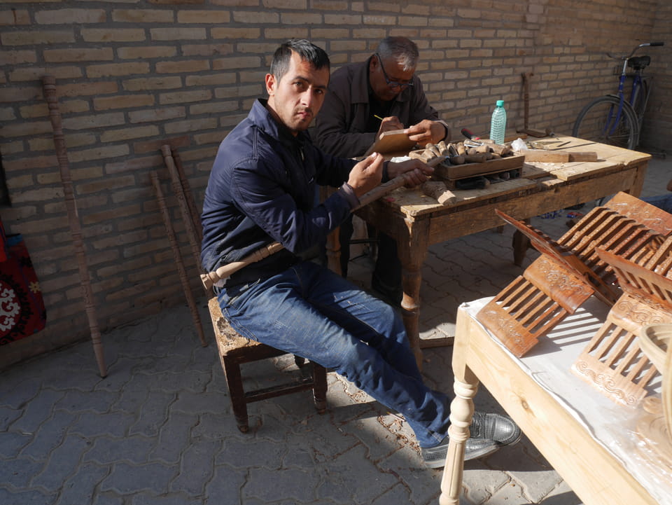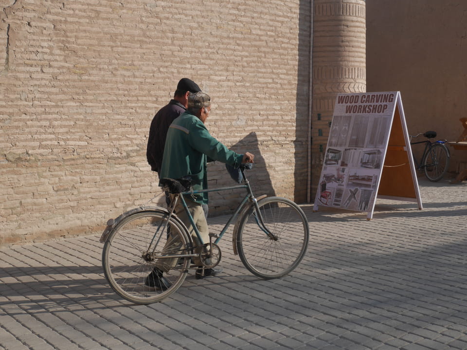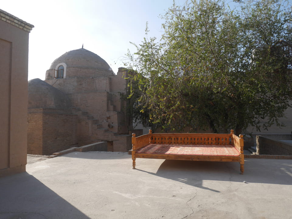 Ich guckte bissel planlos herum, wollte Eintrittsgelder vermeiden. Die vielen hölzernen Träger in der Djuma Moschee waren teils aufwändig verziert. Das Islam Khoja Minaret dann aber war das Highlight heute, denn man konnte da hoch klettern. Eine Frau kassierte 100 Som ab (€1,10) wobei ich klar machte, da bis zu zwei Mal hochzukraxeln. Ich wollte später gegen Sonnenuntergang nochmal hoch.