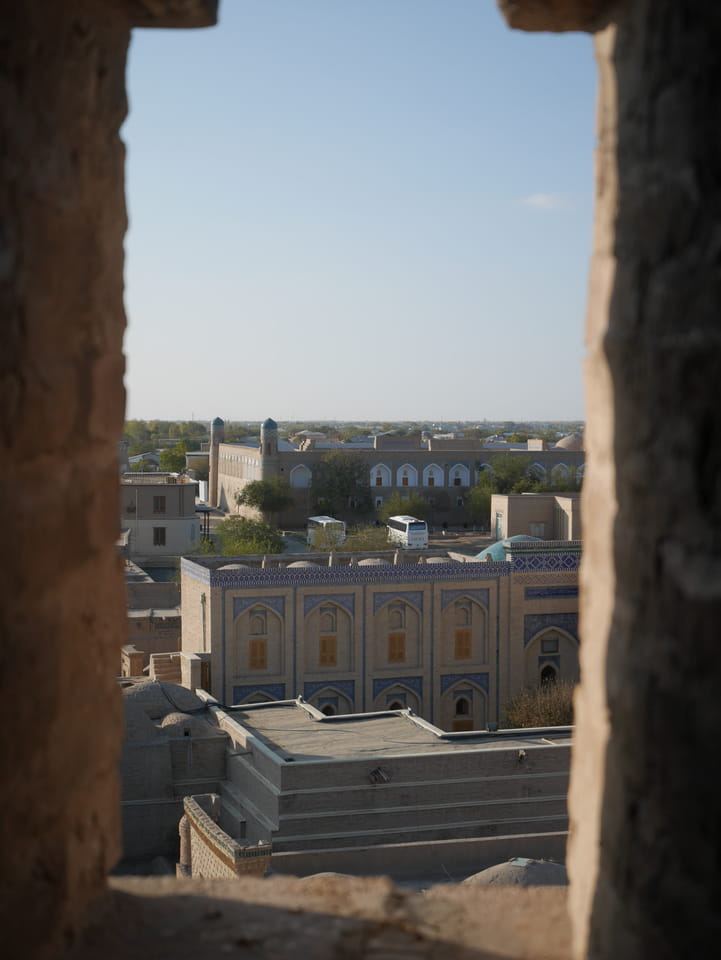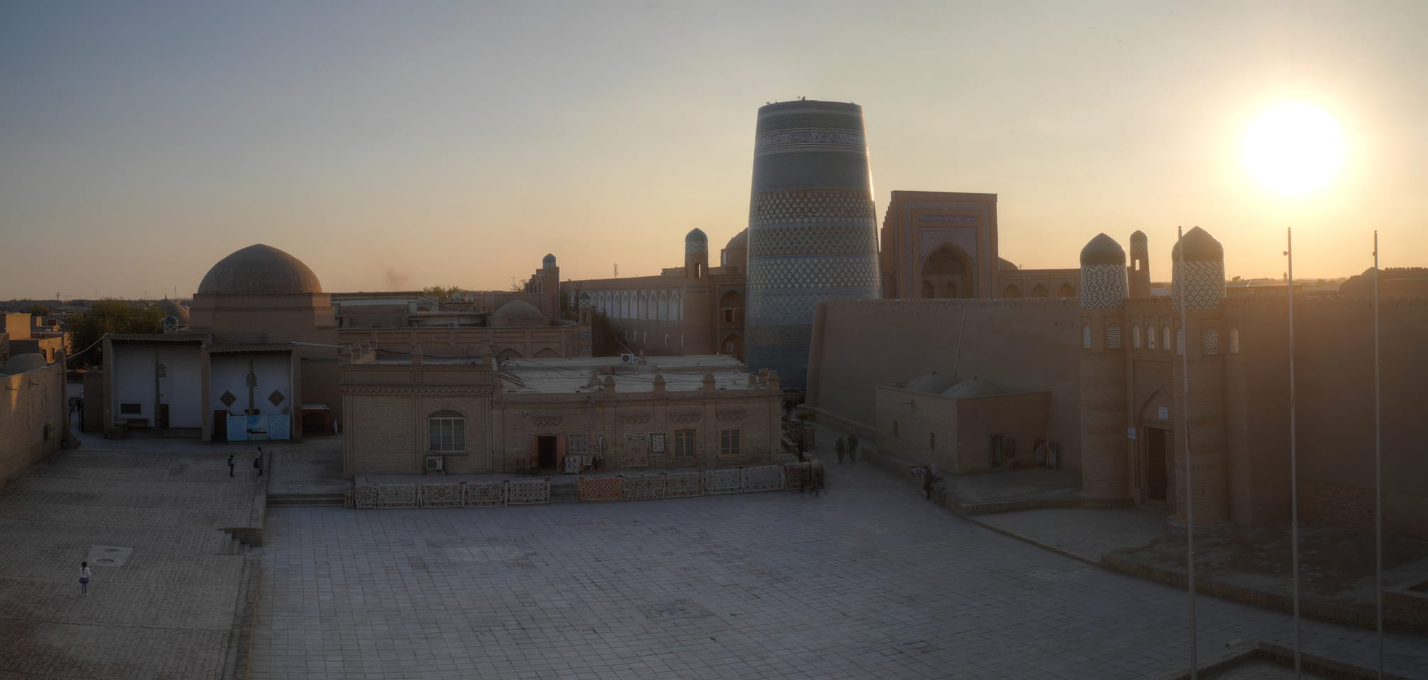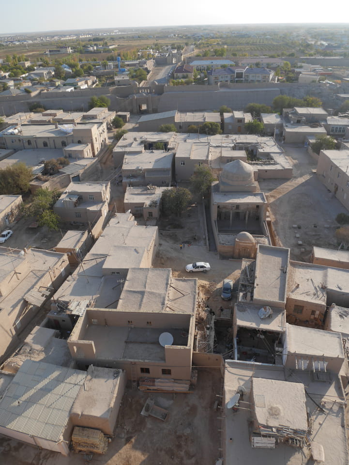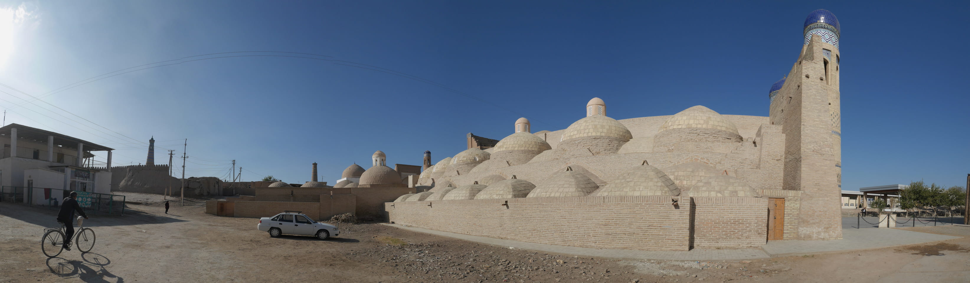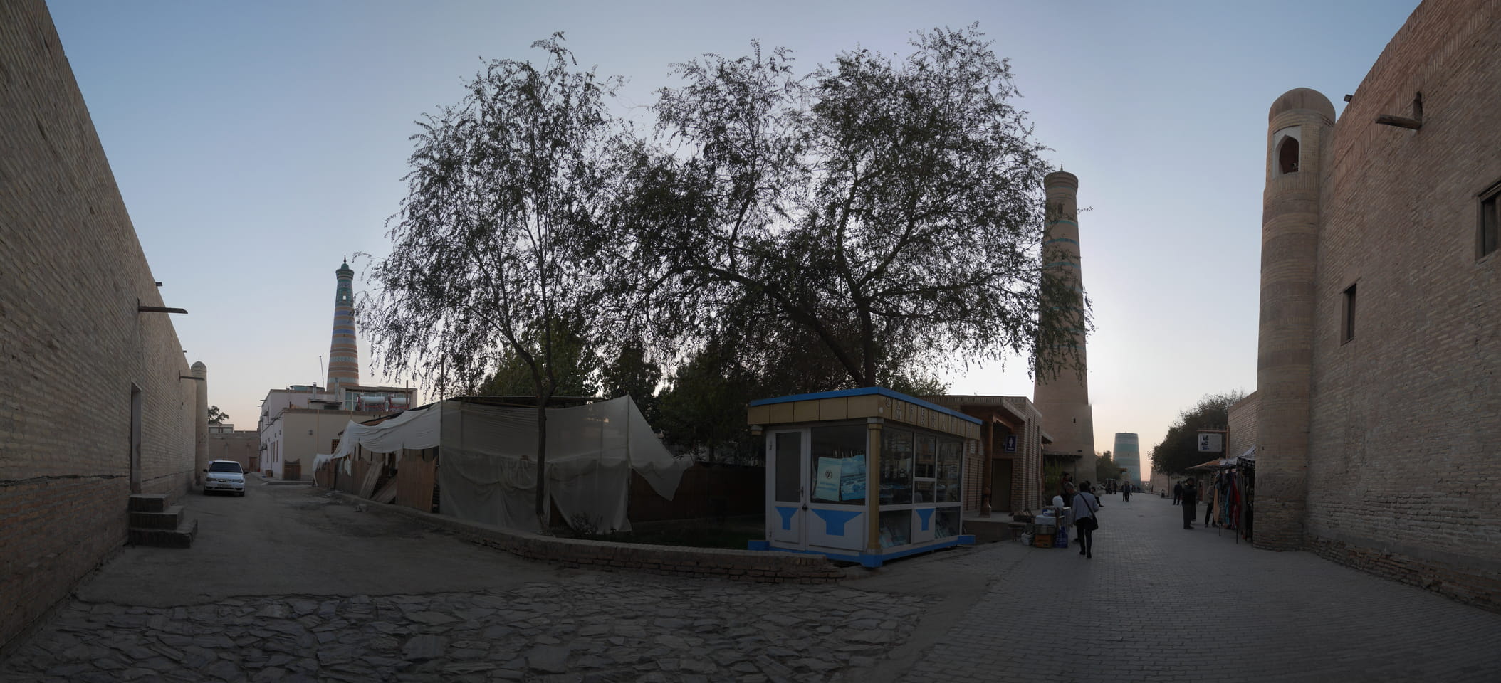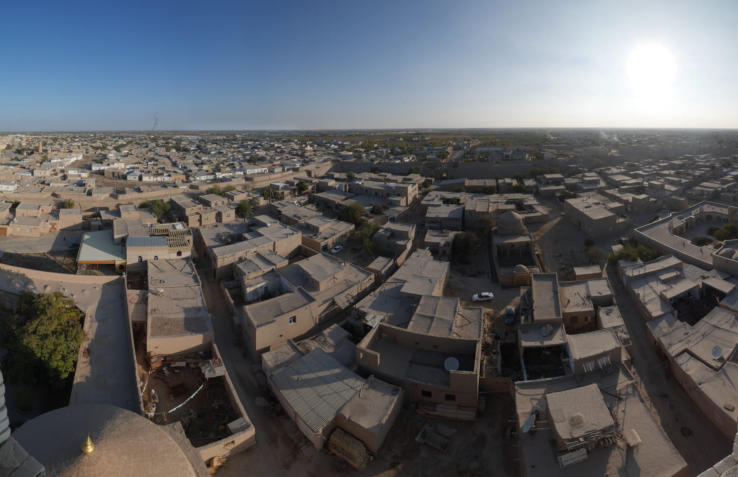 Auf dem Minarett putze ich eine super Aussicht über Khiva. Die Sicht war etwas durch Gitter versperrt doch mir gelangen die Panos. Alles wunderbar und kein zweiter Versuch nötig.
