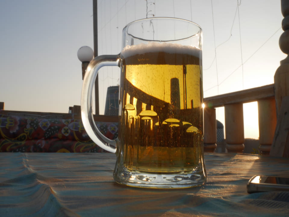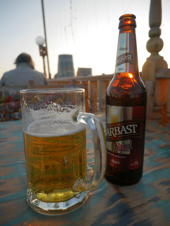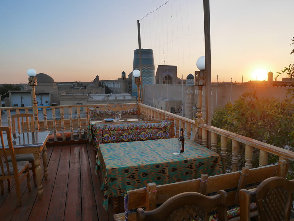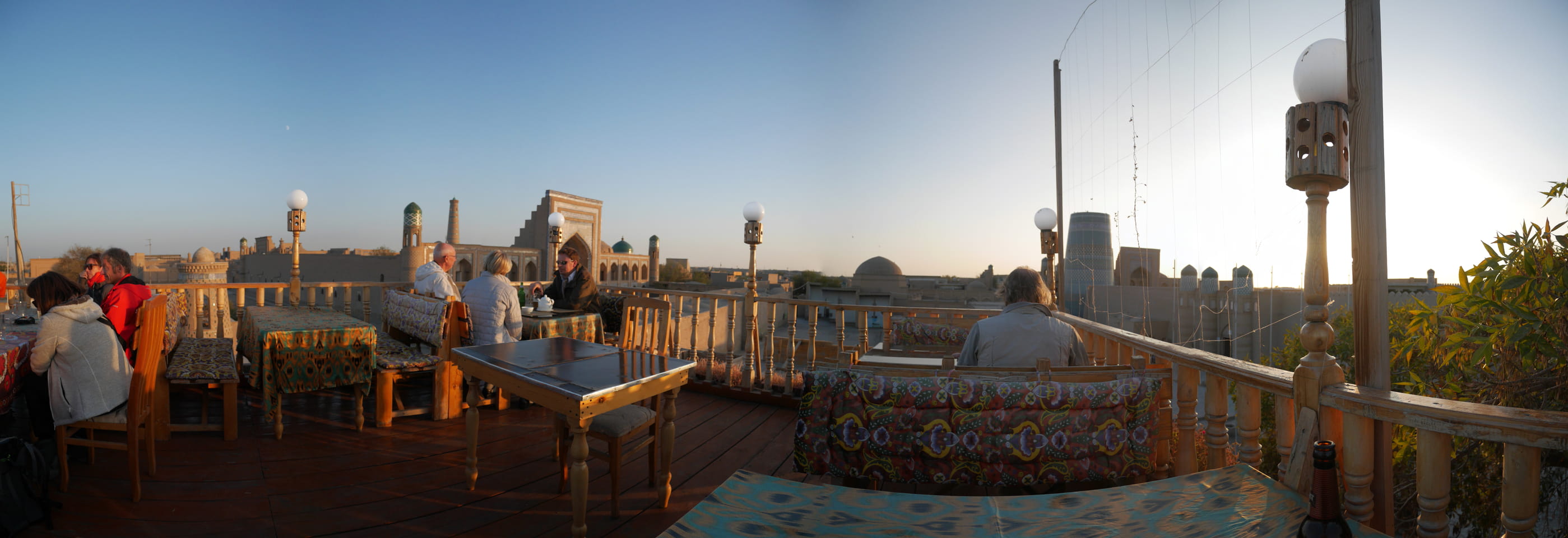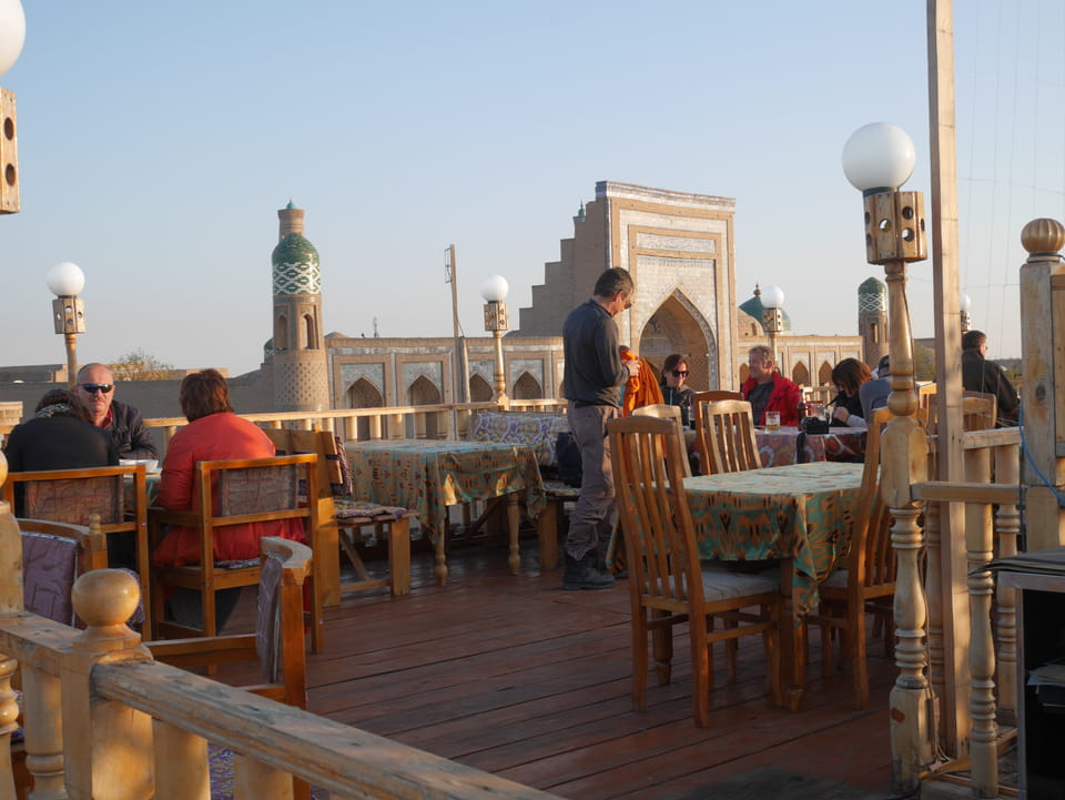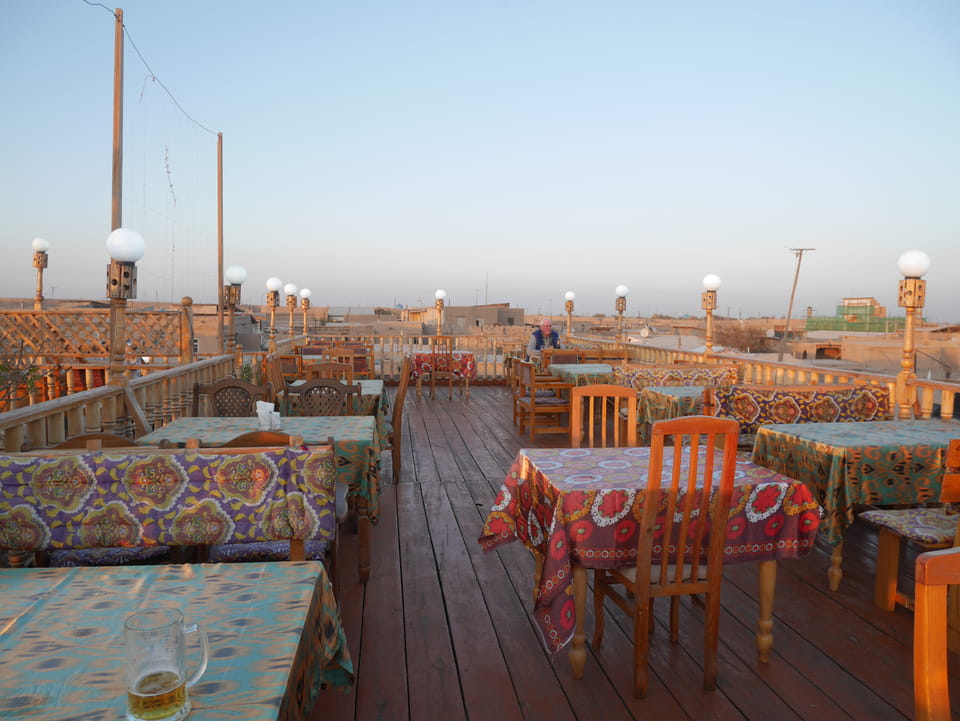 Den Sonnenuntergang genoss ich stimmungsvoll auf der Dachterasse den Terassa Restaurants. Ein Bier (160 Som) und einige Touristen da oben. Echt cooler Sitzplatz mit Aussicht und damit ein guter Abschluss meiner Seidenstraßen-Tour.