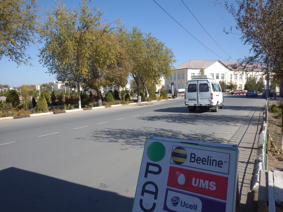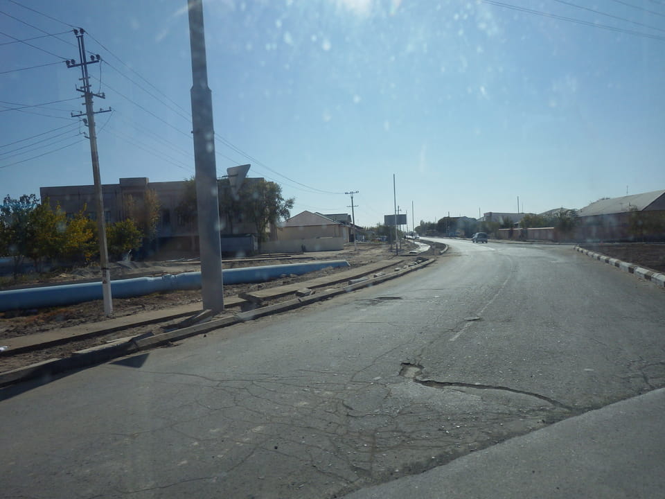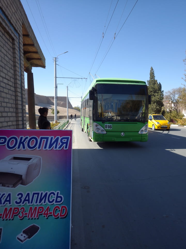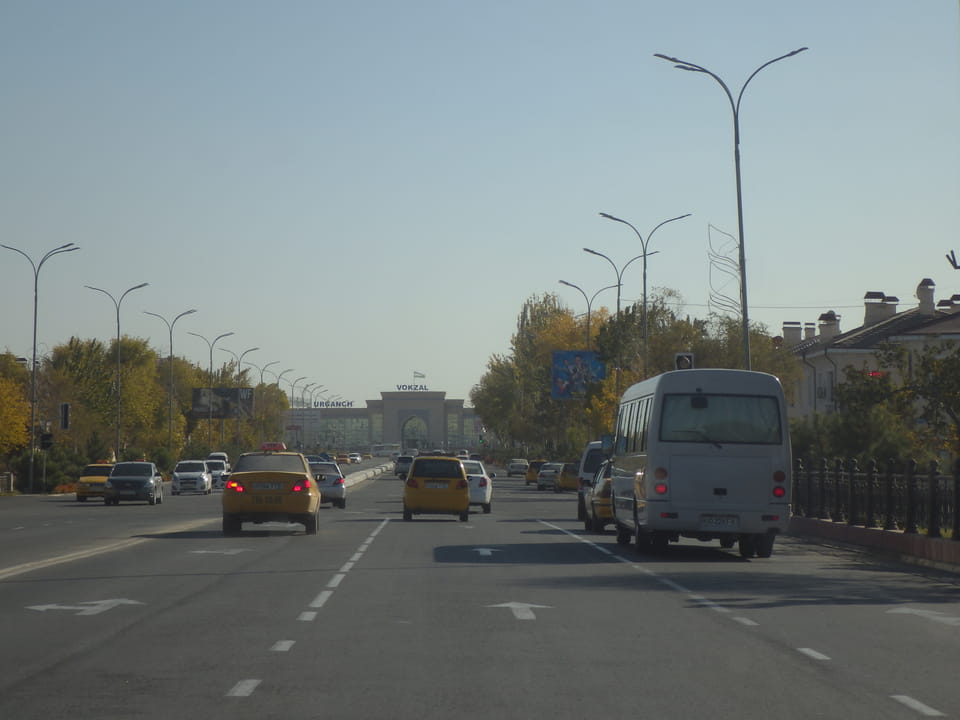 Ich hatte Zeit bis zum Zug um 15:50. So nahm ich einen Trolleybus, der erst mal eine Weile wartete. Die Fahrt bis Urgench dauerte um die 40′. Ich verfolgte den auf dem GPS. Viele Schulkinder waren auf dem Weg zum Samstag. Irgendwann im Zentrum sprang ich raus, zahlte nur 1.000 (€0,11). Hier war ein Schaschlik-Restaurant. Vor der langen Zugfahrt wollte ich mir den Bauch vollschlagen und das klappte hervorragend. Ich suchte mir 3 verschiedene Spieße raus, von denen zwei aber gleich schmeckten. Mit Brot, Salat und Cola kam ich auf 35K – kaum €4.