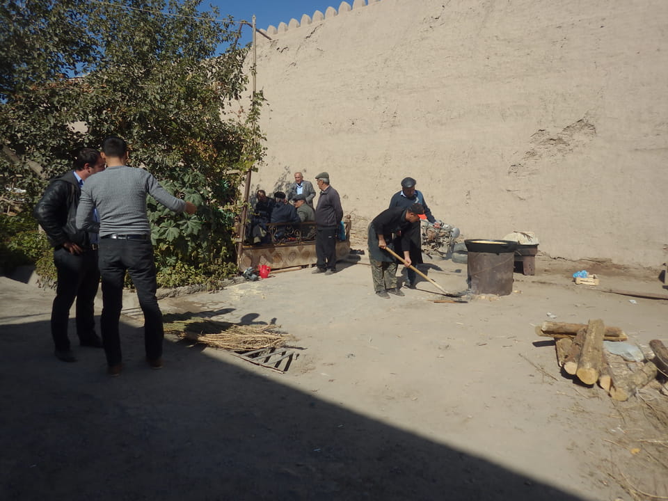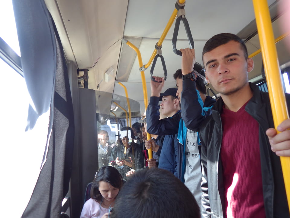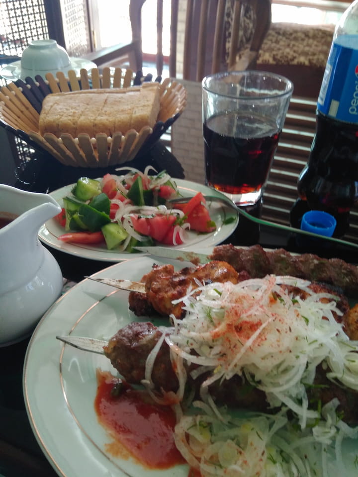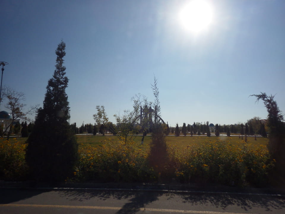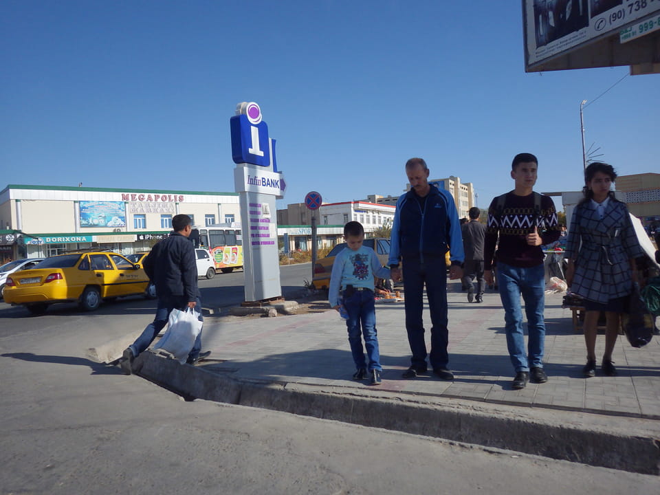 Ich hatte Zeit bis zum Zug um 15:50. So nahm ich einen Trolleybus, der erst mal eine Weile wartete. Die Fahrt bis Urgench dauerte um die 40′. Ich verfolgte den auf dem GPS. Viele Schulkinder waren auf dem Weg zum Samstag. Irgendwann im Zentrum sprang ich raus, zahlte nur 1.000 (€0,11). Hier war ein Schaschlik-Restaurant. Vor der langen Zugfahrt wollte ich mir den Bauch vollschlagen und das klappte hervorragend. Ich suchte mir 3 verschiedene Spieße raus, von denen zwei aber gleich schmeckten. Mit Brot, Salat und Cola kam ich auf 35K – kaum €4.