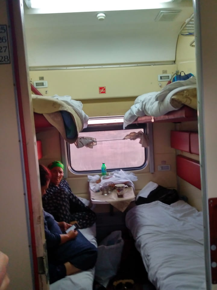 Dann war ich im Zug. Zwei alte Frauen auf den unteren Bunks. Einer Bekannten auch mit eTicket schilderte ich das Verfahren, wofür sie sich bedankte. Dann fuhr der Zug – auf nach Tashkent.