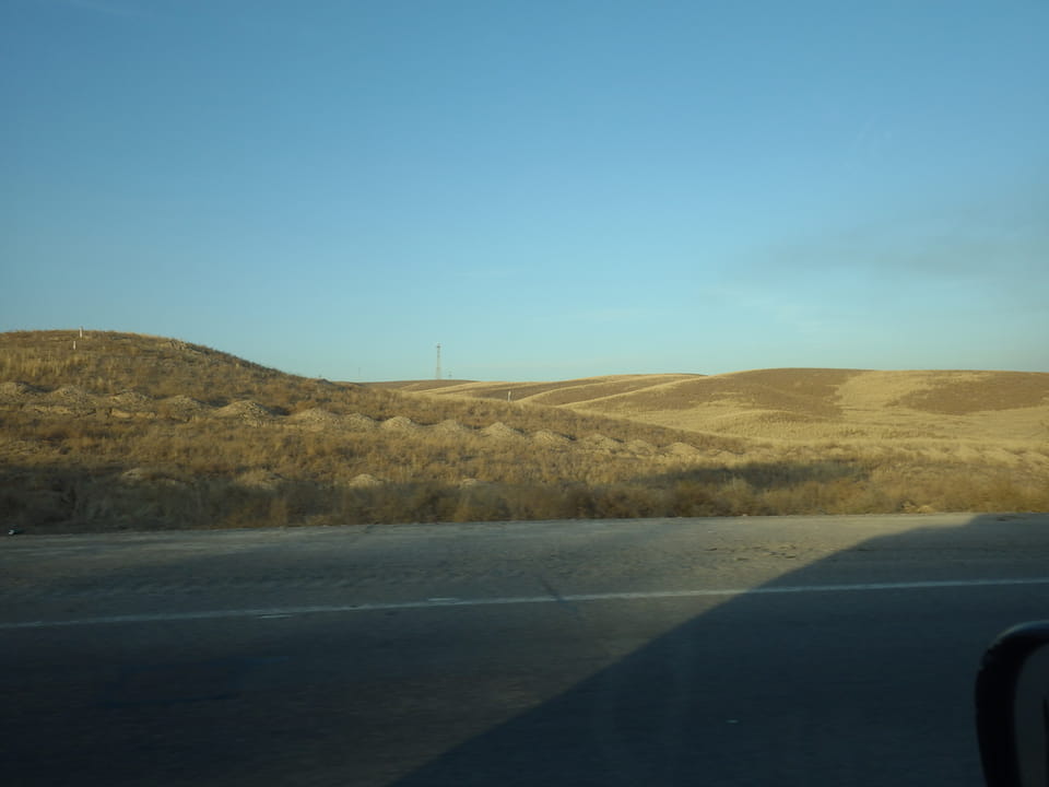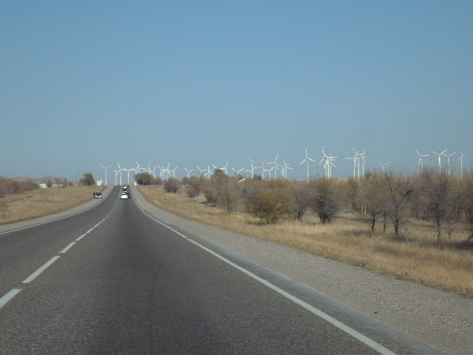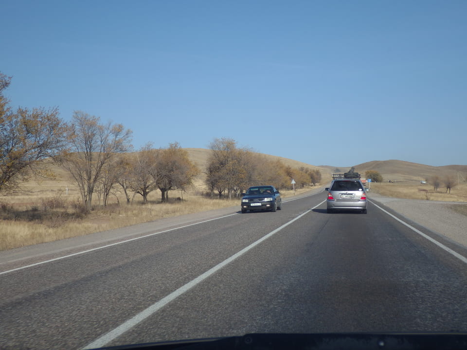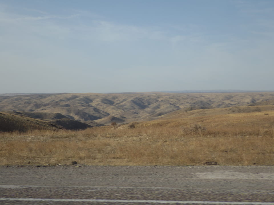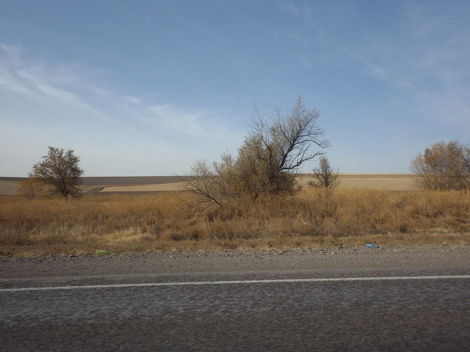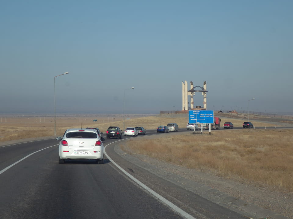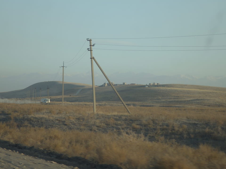 Ja, alles belanglose Infos aber die Fahrt war auch sonst belanglos. An der Grenze war heute ordentlich was los. Viel mehr Leute als auf meiner Einreise. Da standen Typen mit Wägelchen herum, es wurde gedrängelt und geschubst. Leute hatten es eilig und es gab sogar leichte Unruhen. Ich war heilfroh, als ich diese Quetschzeit mit meinem Gepäck überstanden hatte. Die lange Fahrt dann nach der Grenze Richtung Almaty war landschaftlich etwas interessanter durch die Steppe.