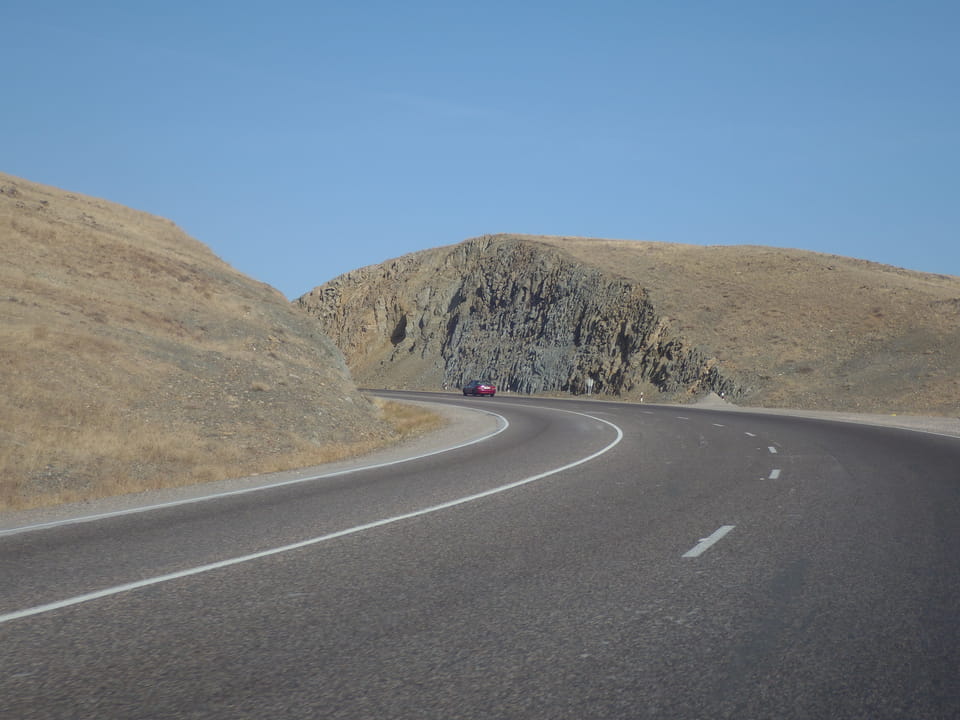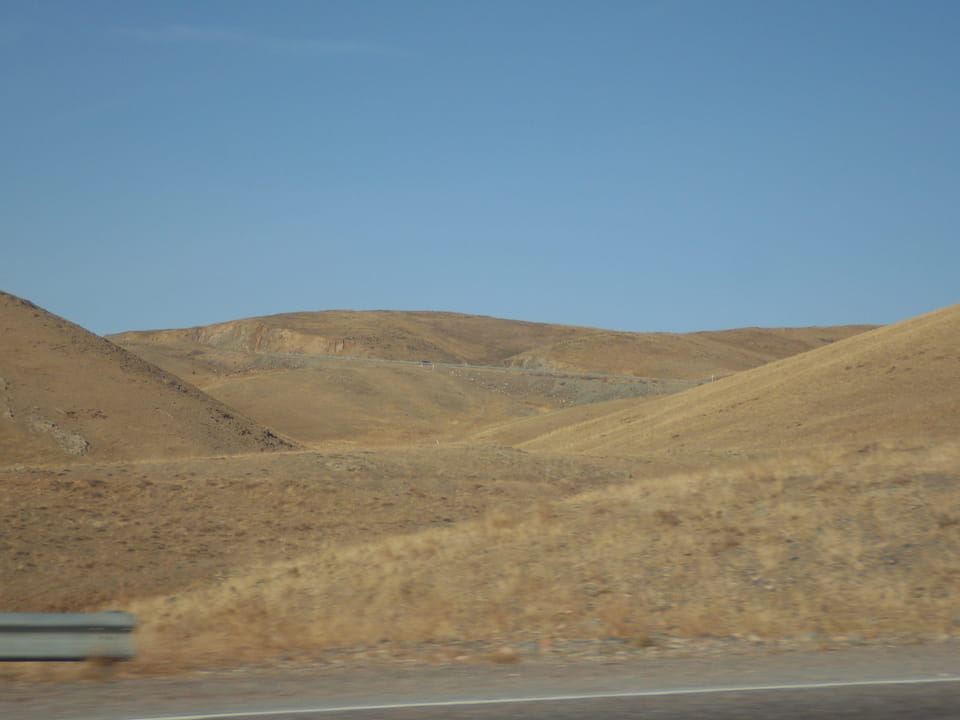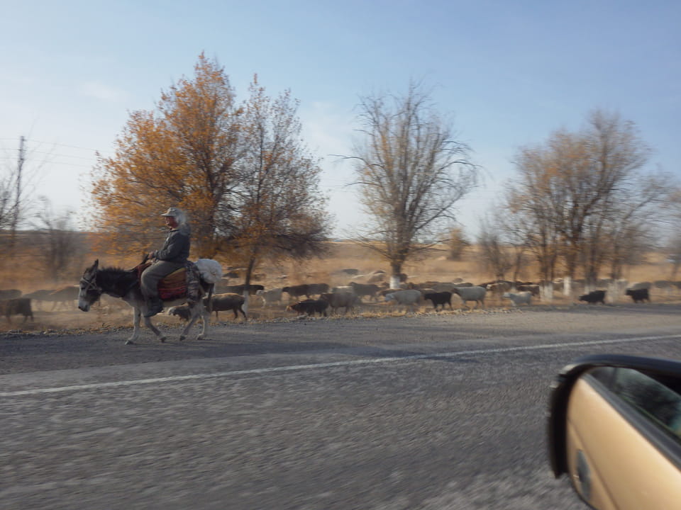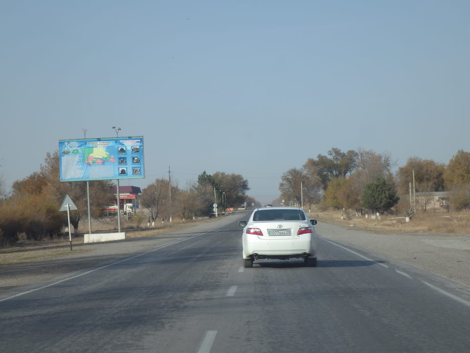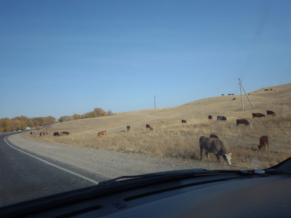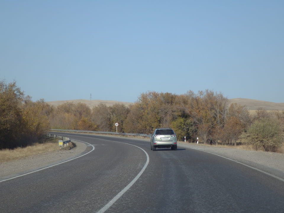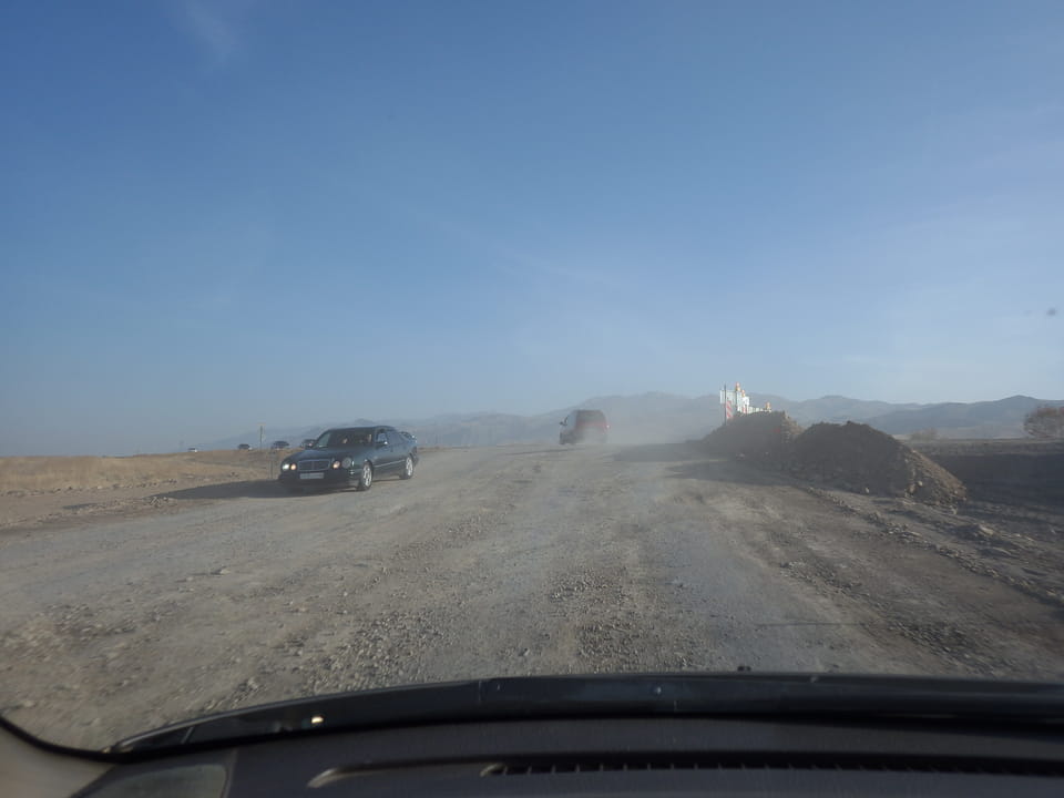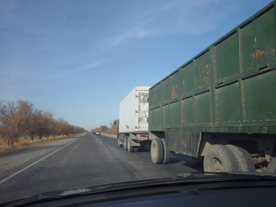 Ja, alles belanglose Infos aber die Fahrt war auch sonst belanglos. An der Grenze war heute ordentlich was los. Viel mehr Leute als auf meiner Einreise. Da standen Typen mit Wägelchen herum, es wurde gedrängelt und geschubst. Leute hatten es eilig und es gab sogar leichte Unruhen. Ich war heilfroh, als ich diese Quetschzeit mit meinem Gepäck überstanden hatte. Die lange Fahrt dann nach der Grenze Richtung Almaty war landschaftlich etwas interessanter durch die Steppe.