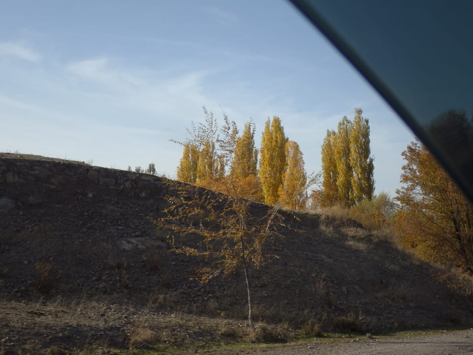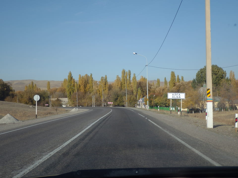 Wenigstens halbwegs bequem ging die Fahrt los. Ein weiterer Passagier wurde am Ortsrand aufgegabelt. Da war ein Restaurant und ich wollte meine letzten 40 KGS loswerden. Das für gab’s ‘ne Coca Cola. Ich behielt dann doch den 20 KGS Schein als Souvenir und kam auf 37 KGS in teilweise Klimpergeld, womit man auch zufrieden war.