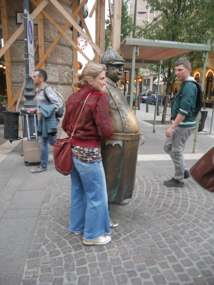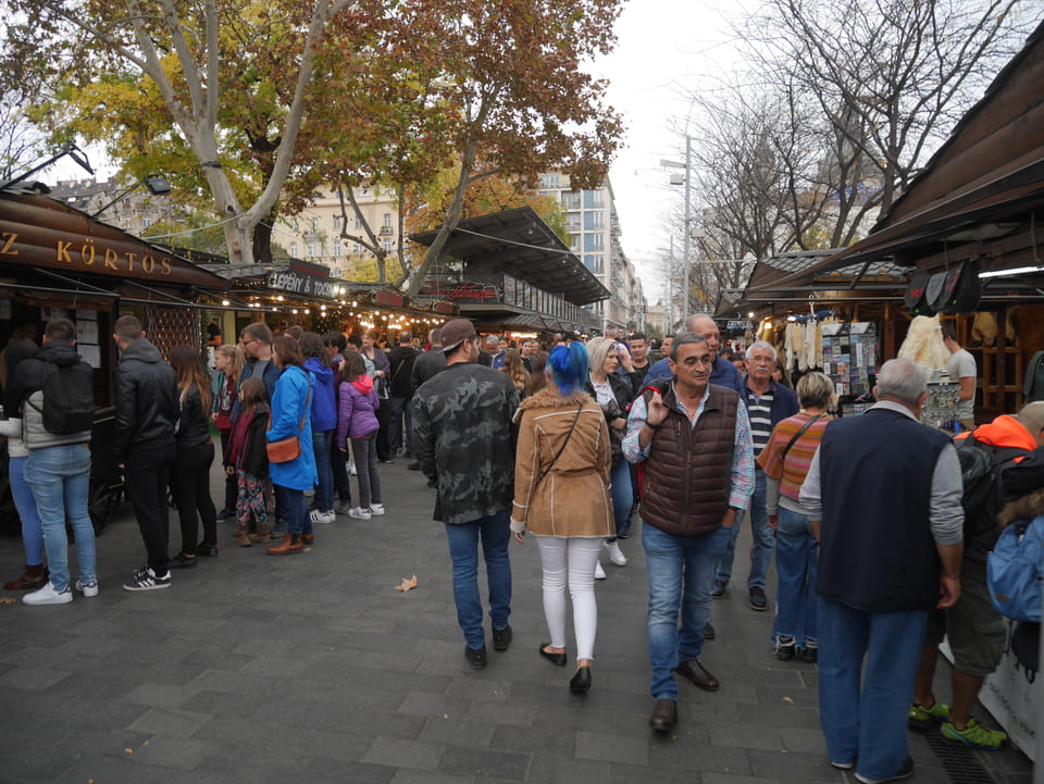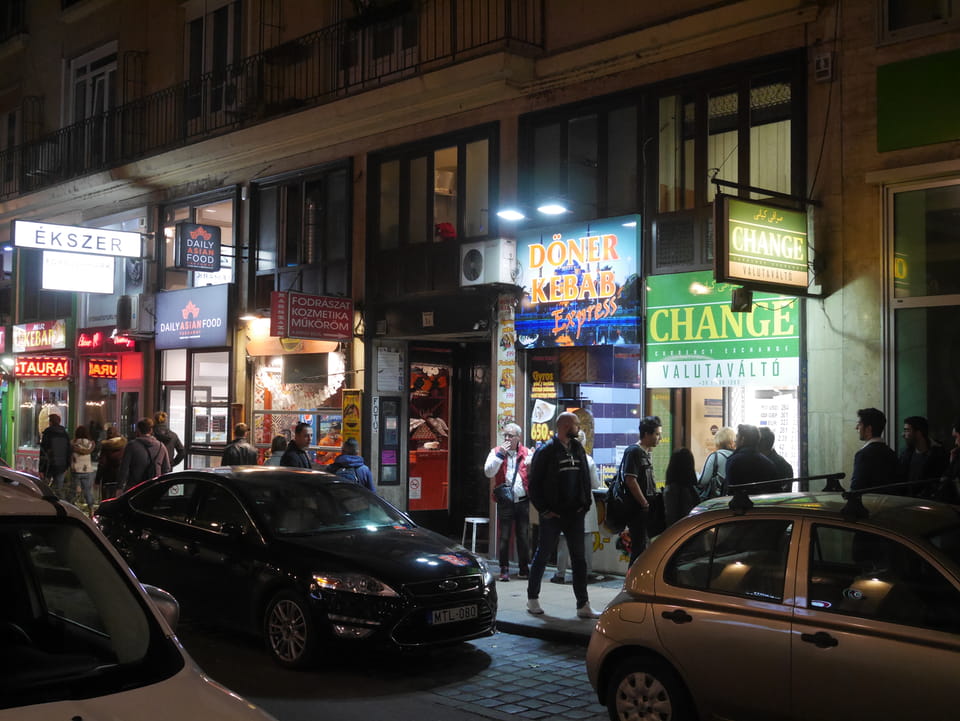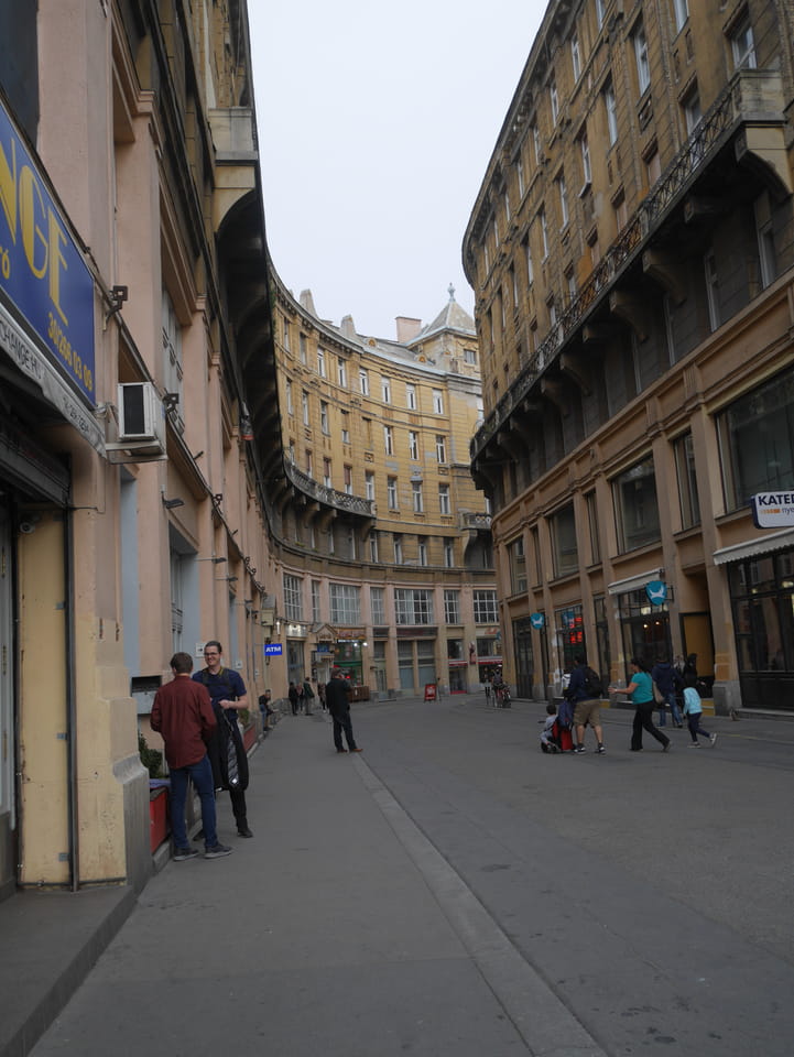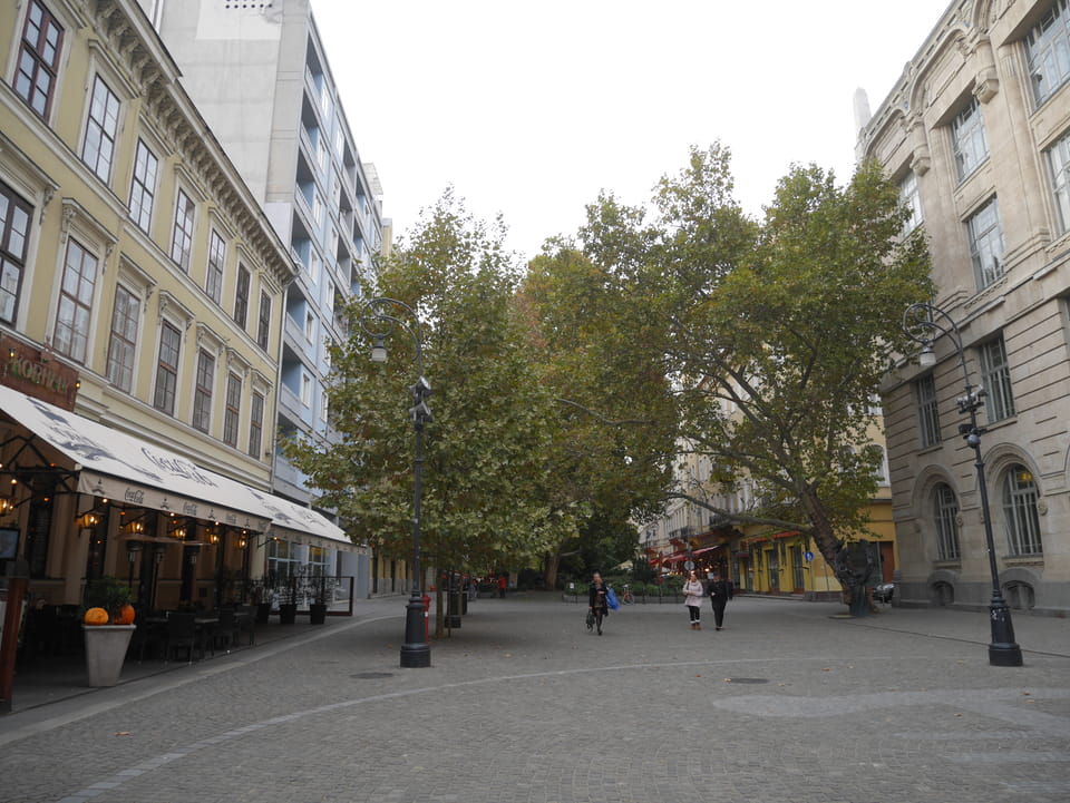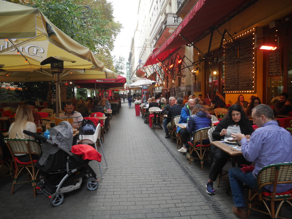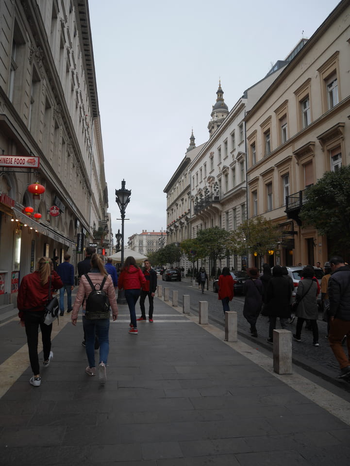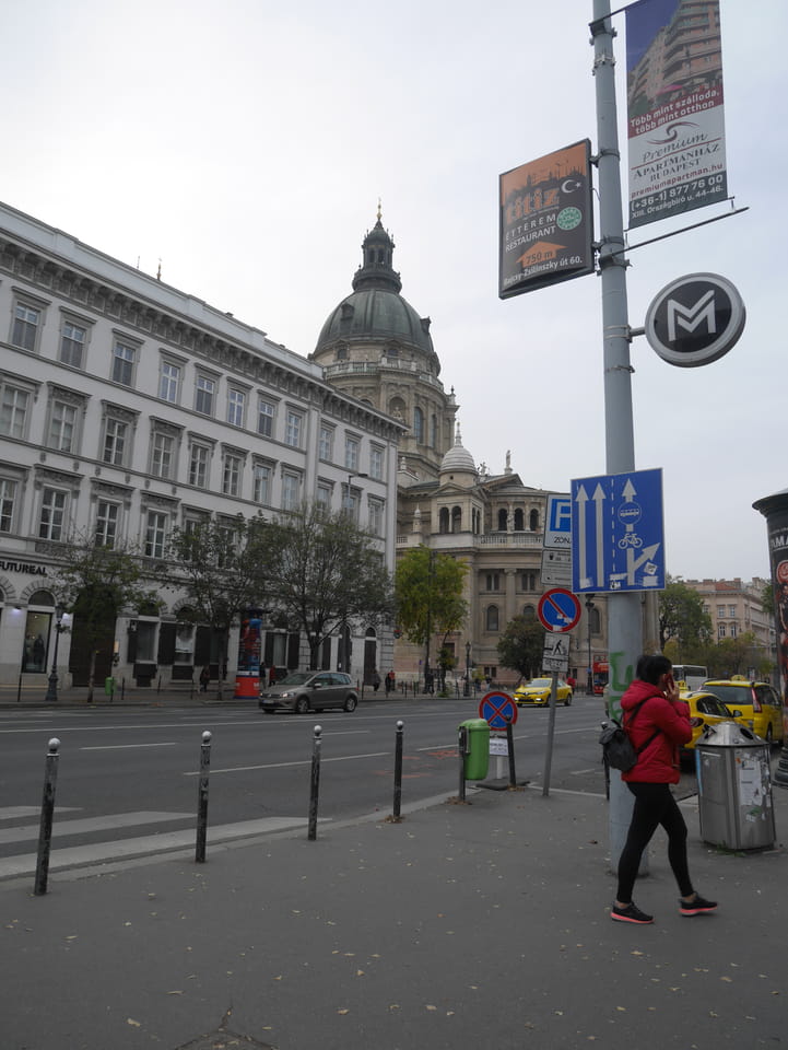 Gegen 15:00 dann schlenderte ich auf Budapests Straßen herum. Die Geschäfte hatten heute wegen eines Feiertages geschlossen. Somit war die Stimmung rein touristisch. Die Restaurants schienen gut gefüllt. Ich hatte einen Gyrosteller, der mich gut satt machte (1850 HUF mit Fanta – €6). Das Wetter war herbstlich halb trüb, wie auch meine Stimmung, denn die Reise ist eben vorbei.
