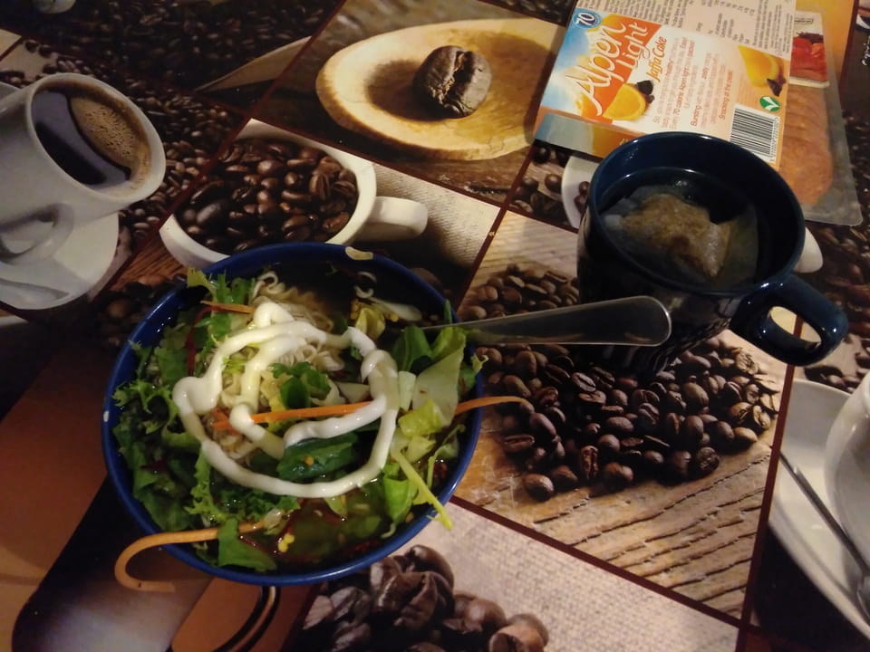 Der halb kaputte Wasserkocher hier machte das Wasser nicht heiß genug, sodass ich drüben im anderen Hostelraum mir kaum besseren lauwarmen Filterkaffee eingoss. Keksfrühstück aber OK.