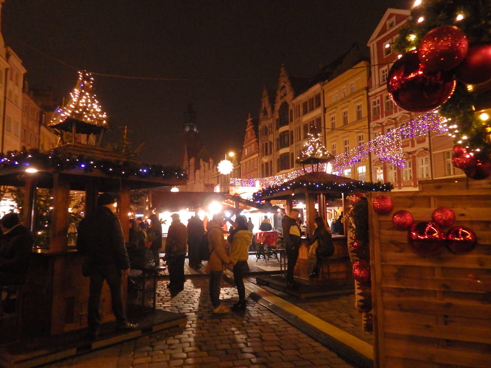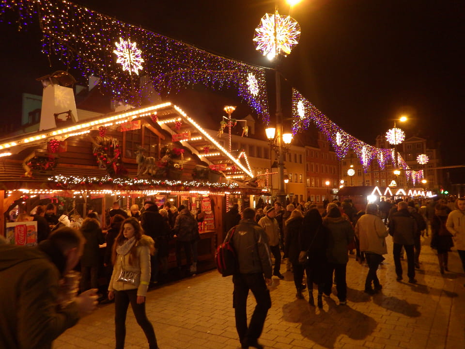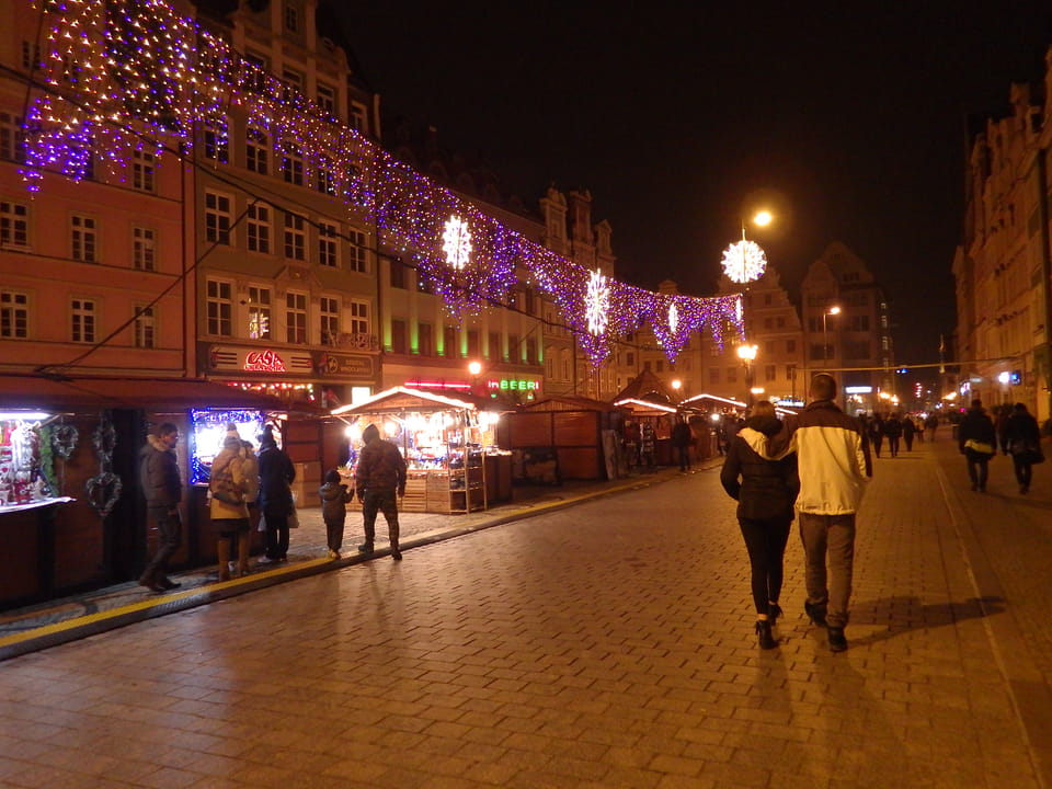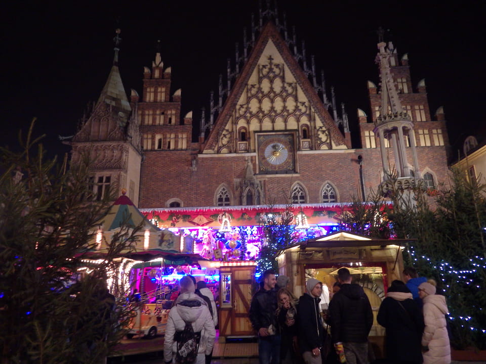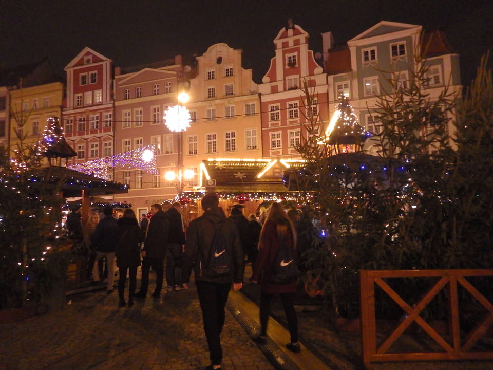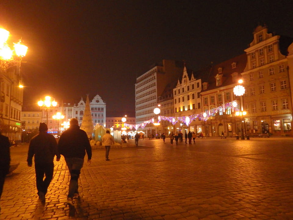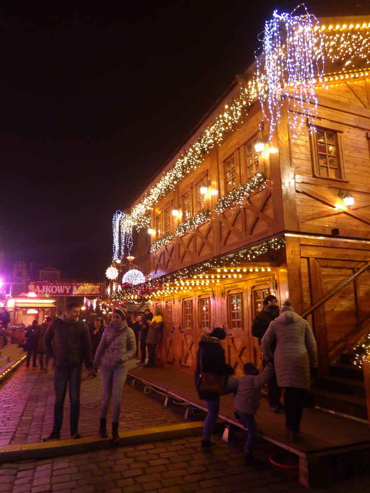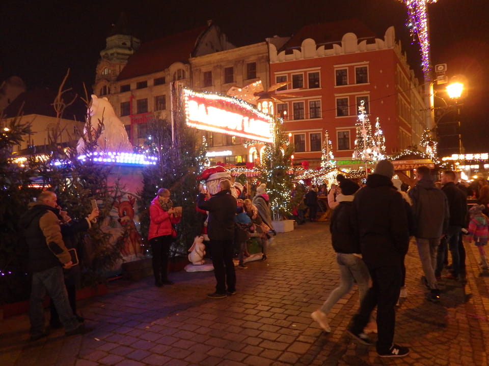 Es kamen neue Leute in’s Hostel und da hörte ich vom Weihnachtsmarkt. Den hatte ich fast vergessen! Schnell beendete ich das Computern. Erst nach 19:30 dann los, schaute ich mir den Rynek In Wroclaw an und staunte bissel. Hier waren auf dem Weihnachtsmarkt komplett mehrstöckige Holzhäuser aufgebaut. Ich hatte eine fette Bemme mit Kraut und Wurst (10 PLN) und guckte weiter. Ein Glühwein nach Wroclaw Art ging auch noch (14 PLN). Dabei Chat mit einer Bekannten, die in der Hitze Malaysias arbeitet.