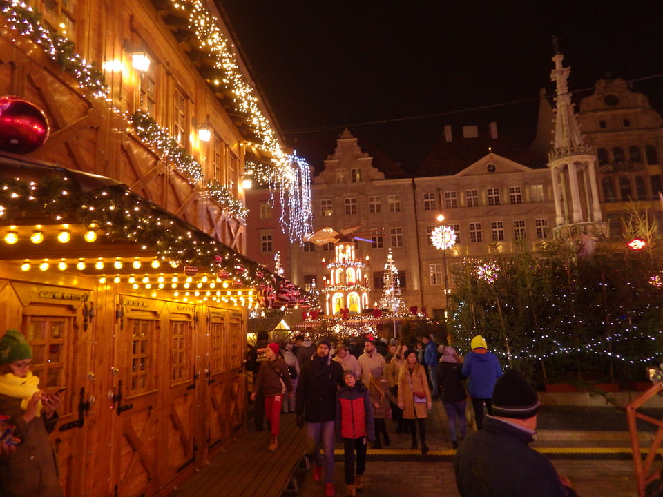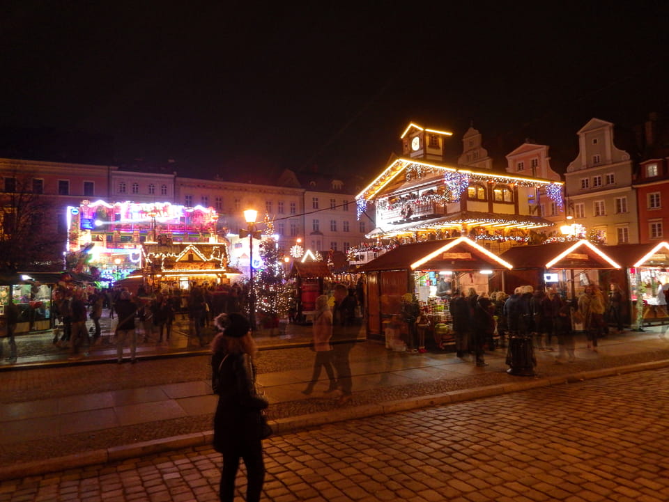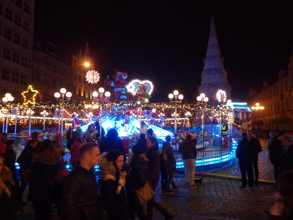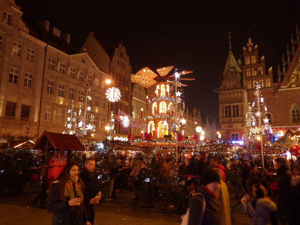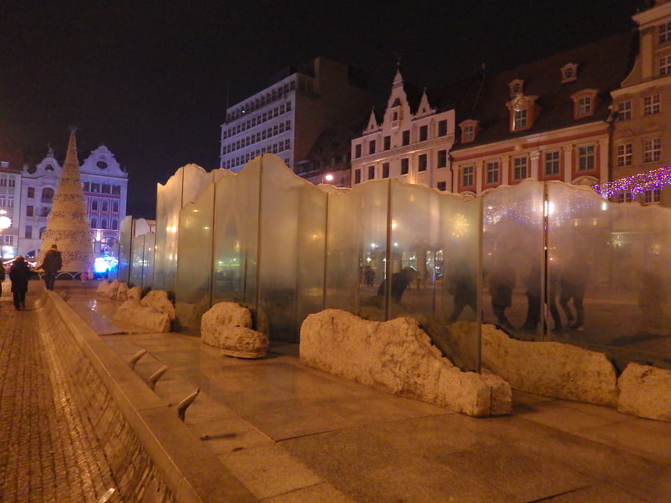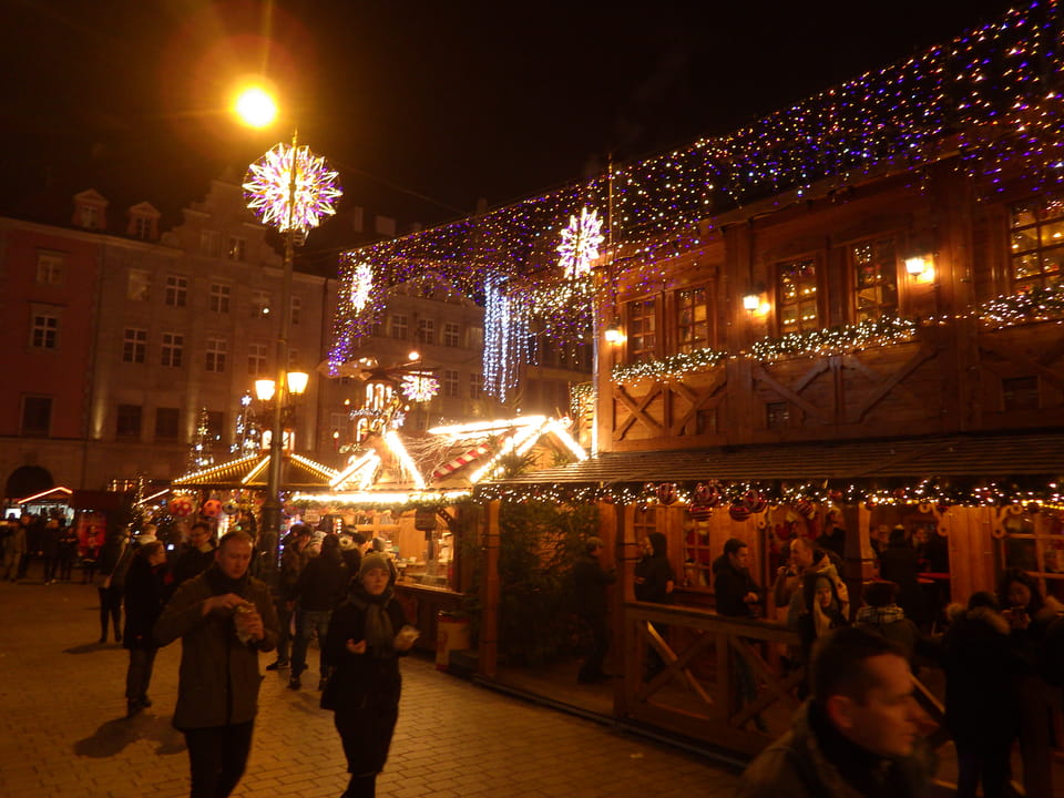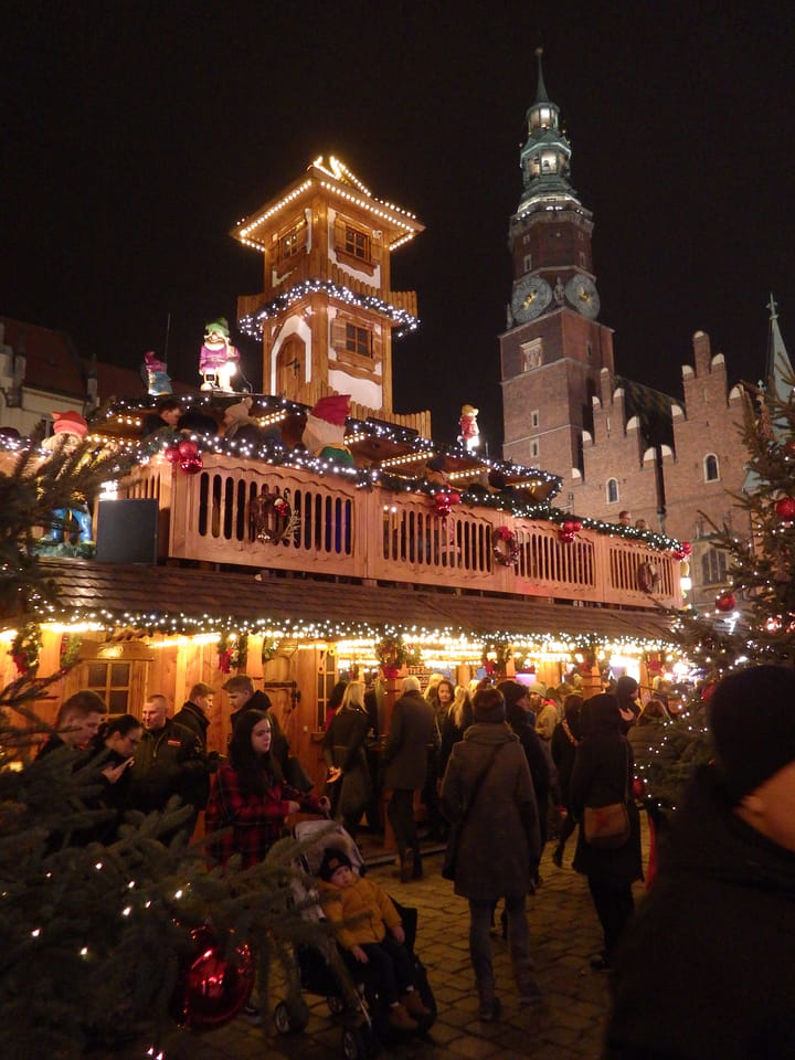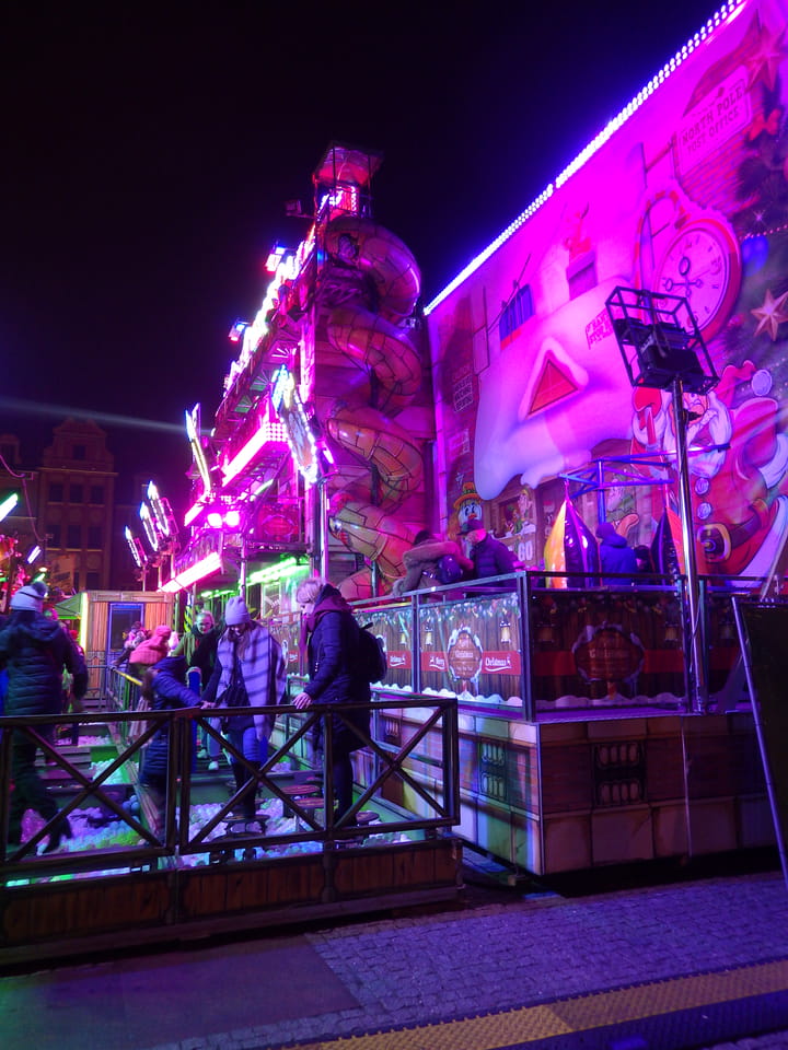 Es kamen neue Leute in’s Hostel und da hörte ich vom Weihnachtsmarkt. Den hatte ich fast vergessen! Schnell beendete ich das Computern. Erst nach 19:30 dann los, schaute ich mir den Rynek In Wroclaw an und staunte bissel. Hier waren auf dem Weihnachtsmarkt komplett mehrstöckige Holzhäuser aufgebaut. Ich hatte eine fette Bemme mit Kraut und Wurst (10 PLN) und guckte weiter. Ein Glühwein nach Wroclaw Art ging auch noch (14 PLN). Dabei Chat mit einer Bekannten, die in der Hitze Malaysias arbeitet.