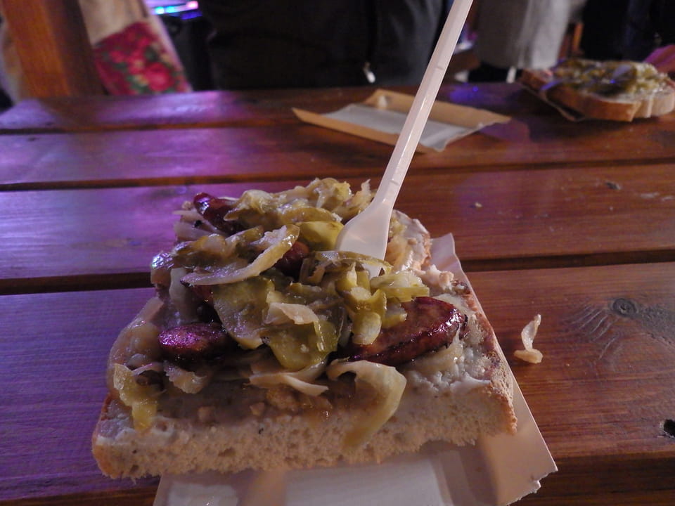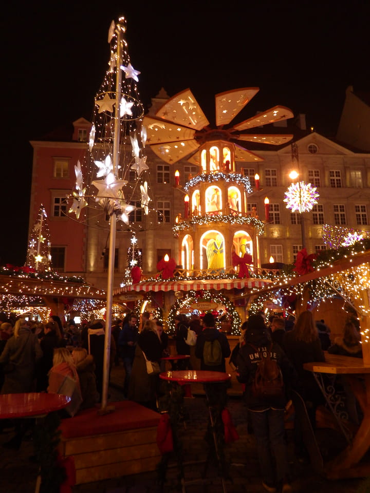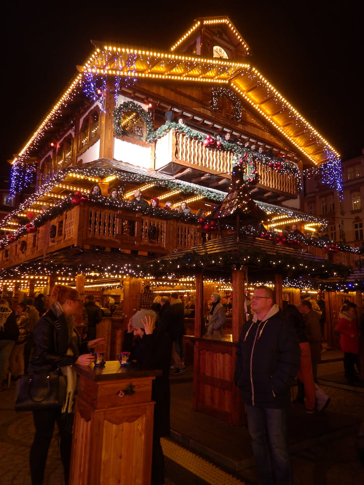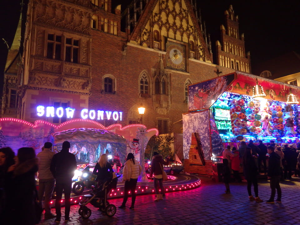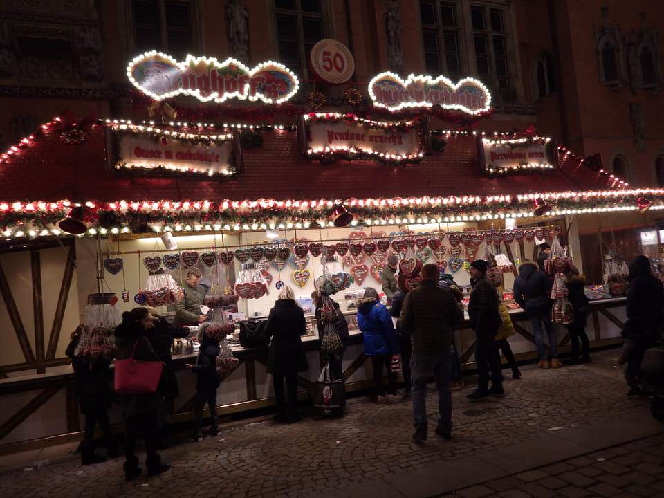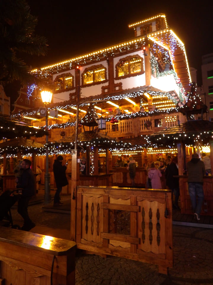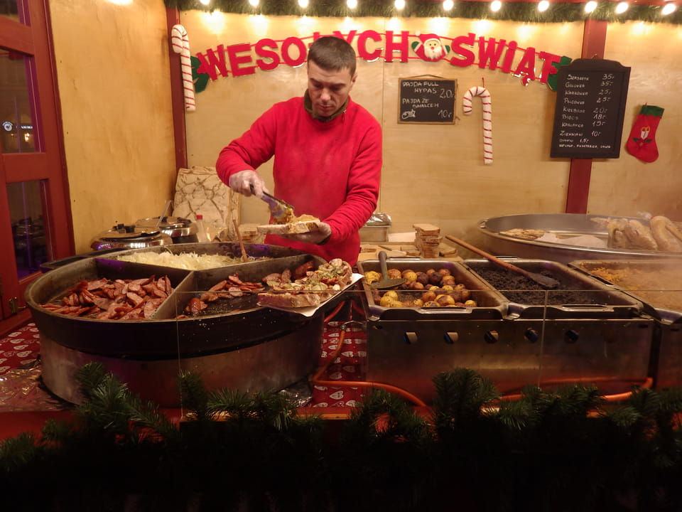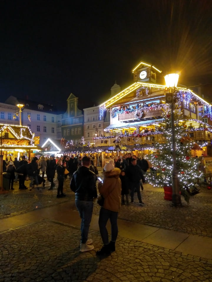 Es kamen neue Leute in’s Hostel und da hörte ich vom Weihnachtsmarkt. Den hatte ich fast vergessen! Schnell beendete ich das Computern. Erst nach 19:30 dann los, schaute ich mir den Rynek In Wroclaw an und staunte bissel. Hier waren auf dem Weihnachtsmarkt komplett mehrstöckige Holzhäuser aufgebaut. Ich hatte eine fette Bemme mit Kraut und Wurst (10 PLN) und guckte weiter. Ein Glühwein nach Wroclaw Art ging auch noch (14 PLN). Dabei Chat mit einer Bekannten, die in der Hitze Malaysias arbeitet.