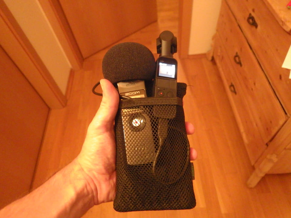 Entgegen dem Yi4K+ / Gimbal Zeug war ich erst mal begeistert. Mich stört etwas, dass man den Pro Modus wohl nur per App ändern kann, was in meinem Fall iPad mini bedeutet. Den Sound kann man auch vergessen, doch dafür habe ich ja den Zoom H1. Wie aber die beiden nutzen? Nach einigem Herumprobieren mit Taschen, nahm ich die Powerbank und sie da, die beiden Teile passten rein. Vorteil ist, dass ich gleichzeitig laden kann, was bei ’ner Stunde durchgehendem Video auch wichtig sein sollte.