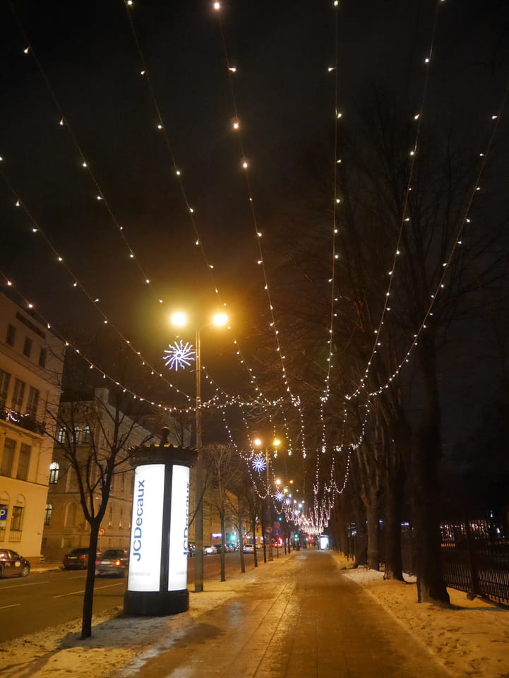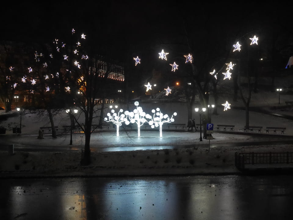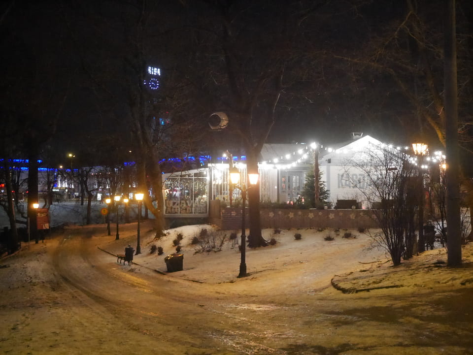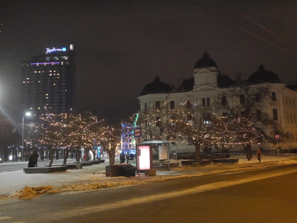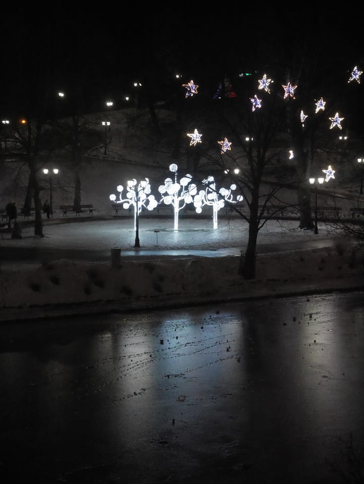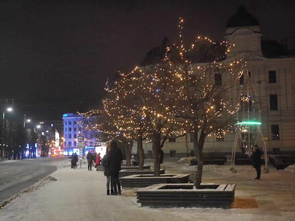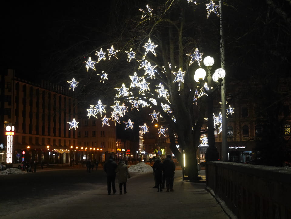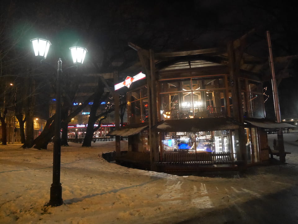 Abends schließlich war die Wäsche getrocknet und ich ging nochmal dick eingemummelt auf die Straße. Irre kalt draußen. Nur mit meiner GF7 machte ich mal Photos. Schön ist’s mit den vielen Lichtern in den Bäumen. Das Abendessen war auch russisch gut.