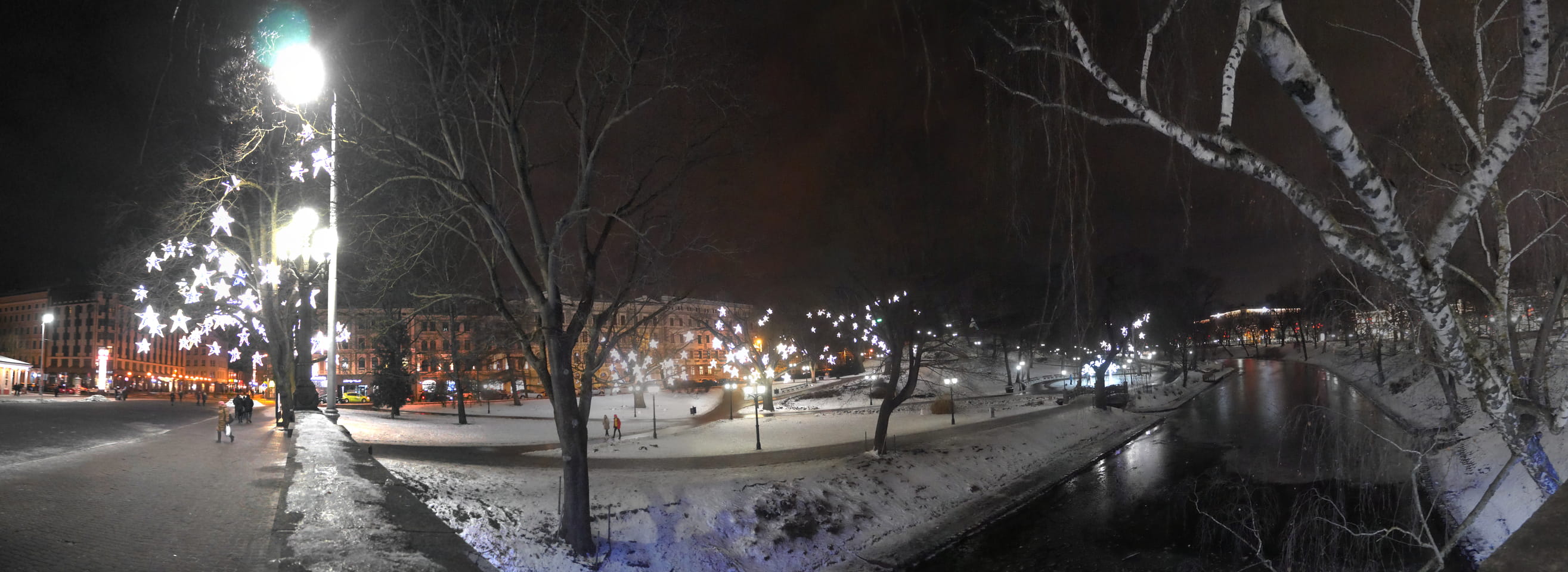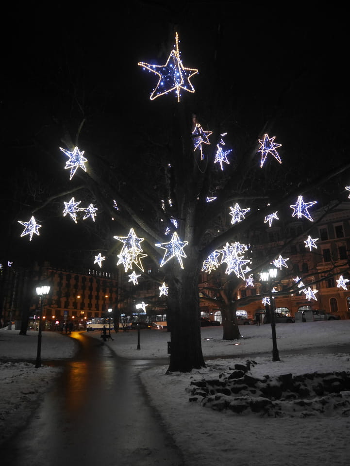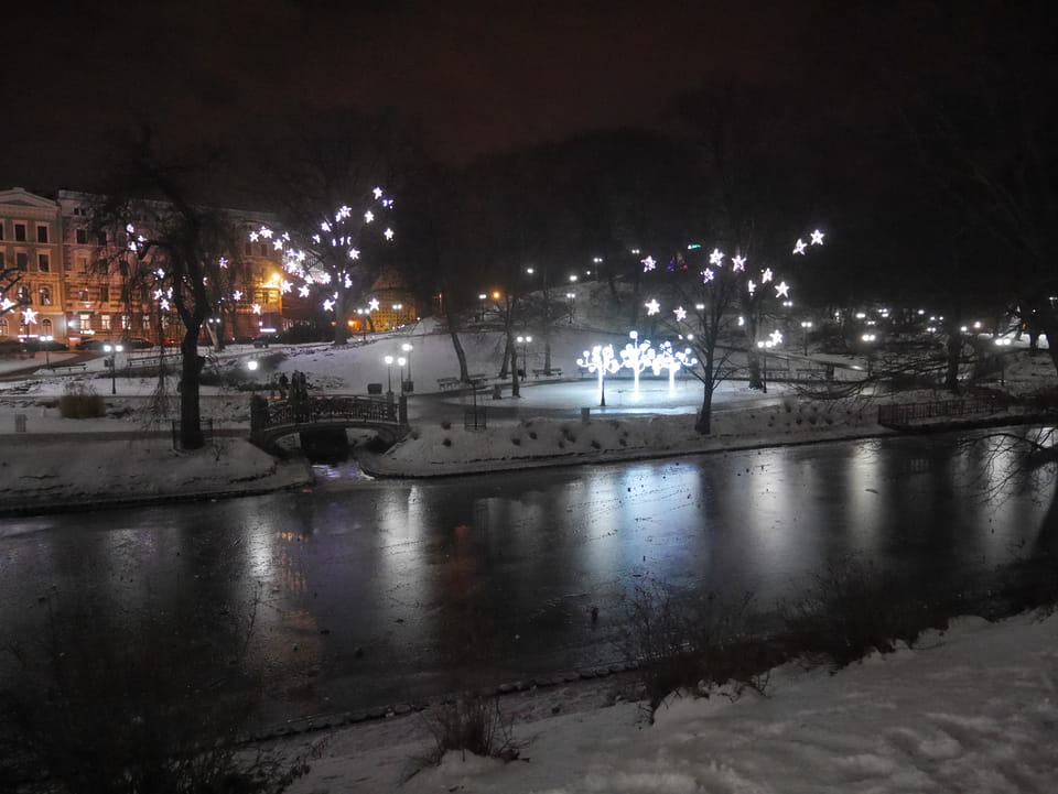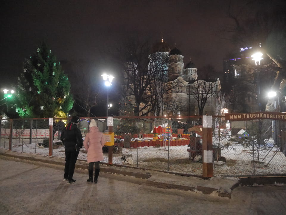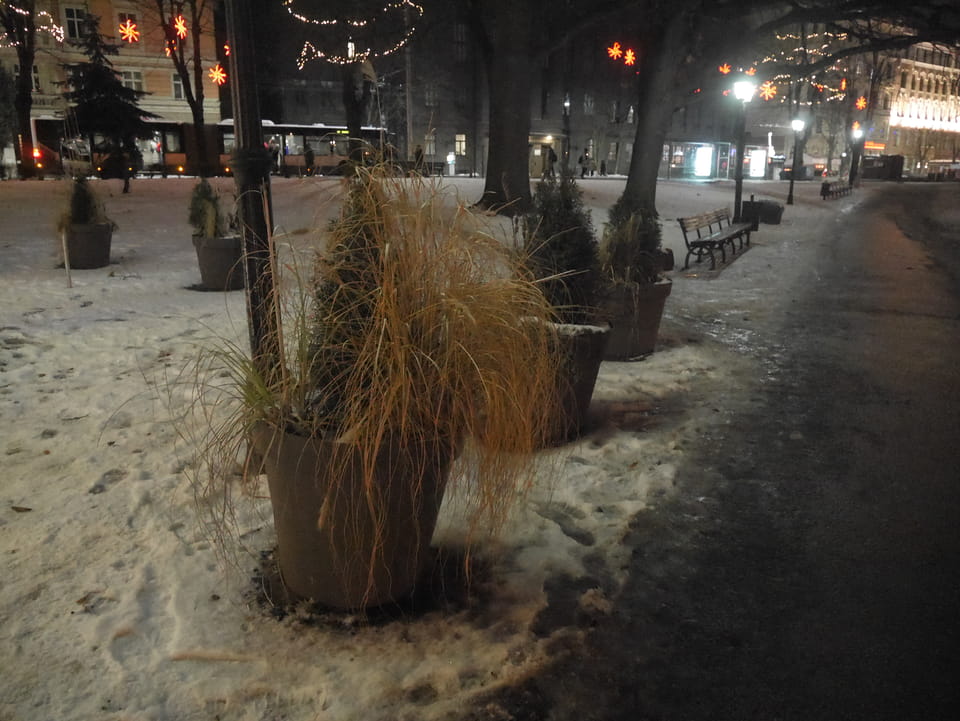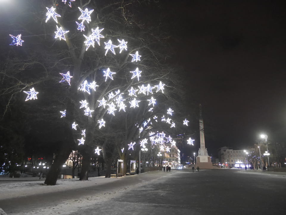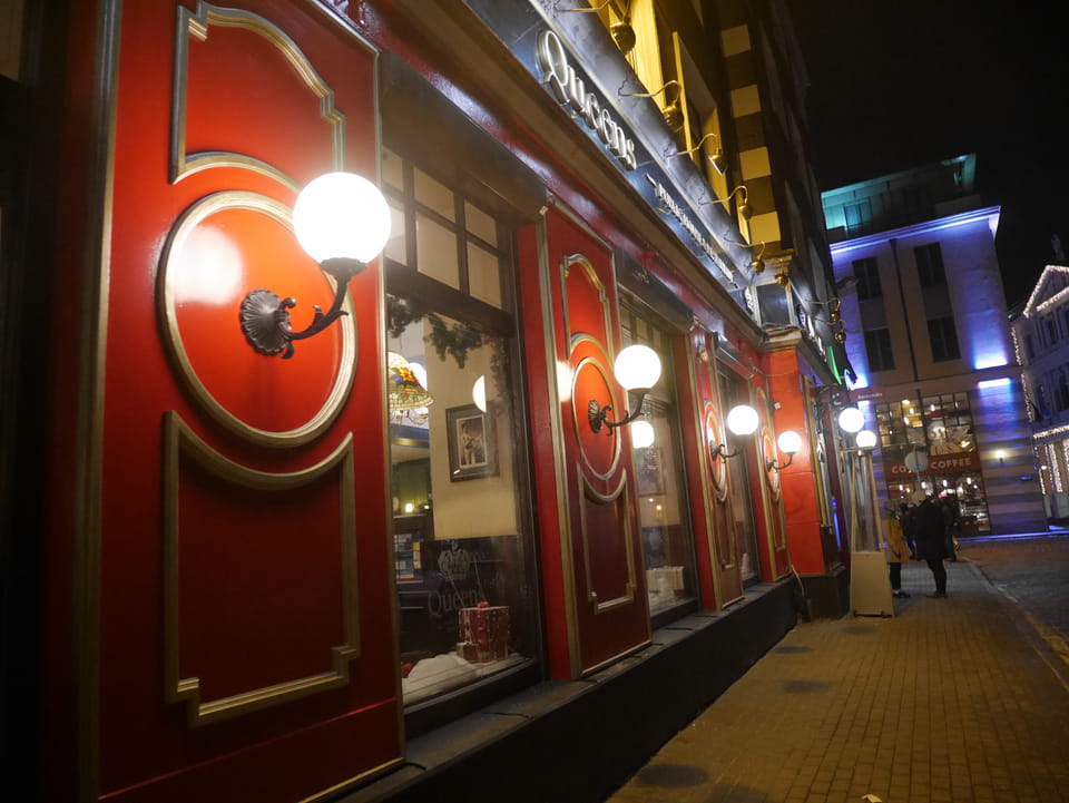 Abends schließlich war die Wäsche getrocknet und ich ging nochmal dick eingemummelt auf die Straße. Irre kalt draußen. Nur mit meiner GF7 machte ich mal Photos. Schön ist’s mit den vielen Lichtern in den Bäumen. Das Abendessen war auch russisch gut.