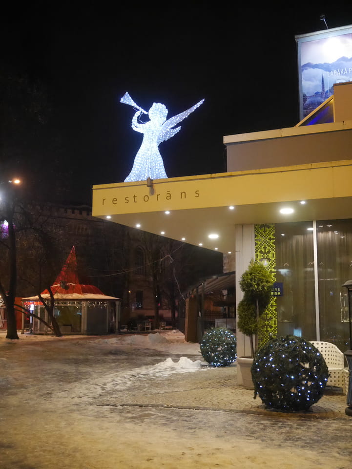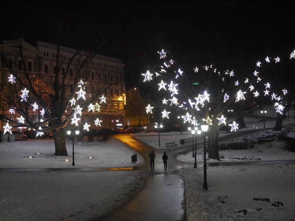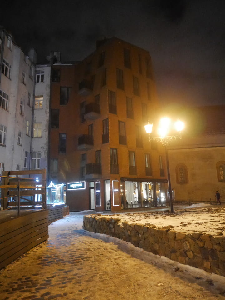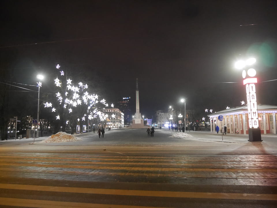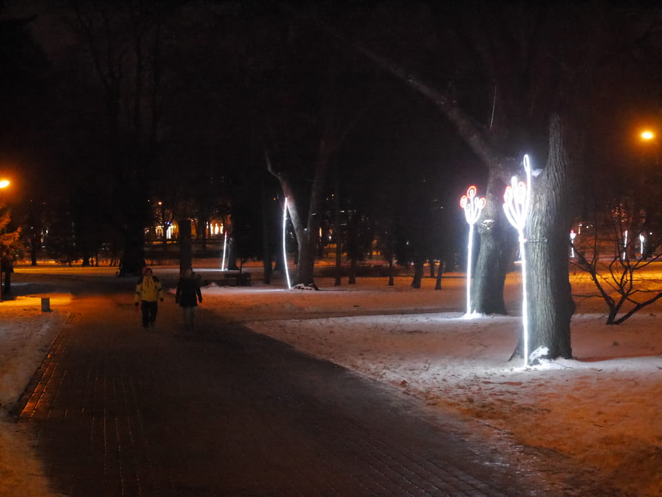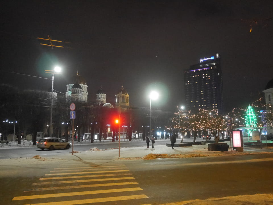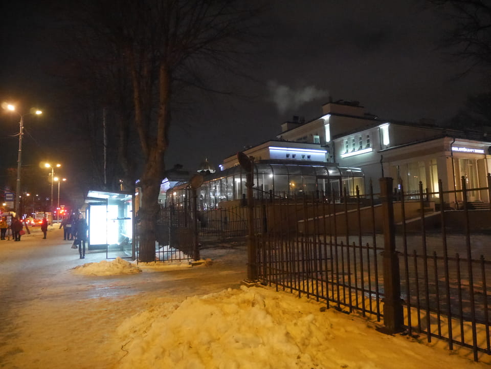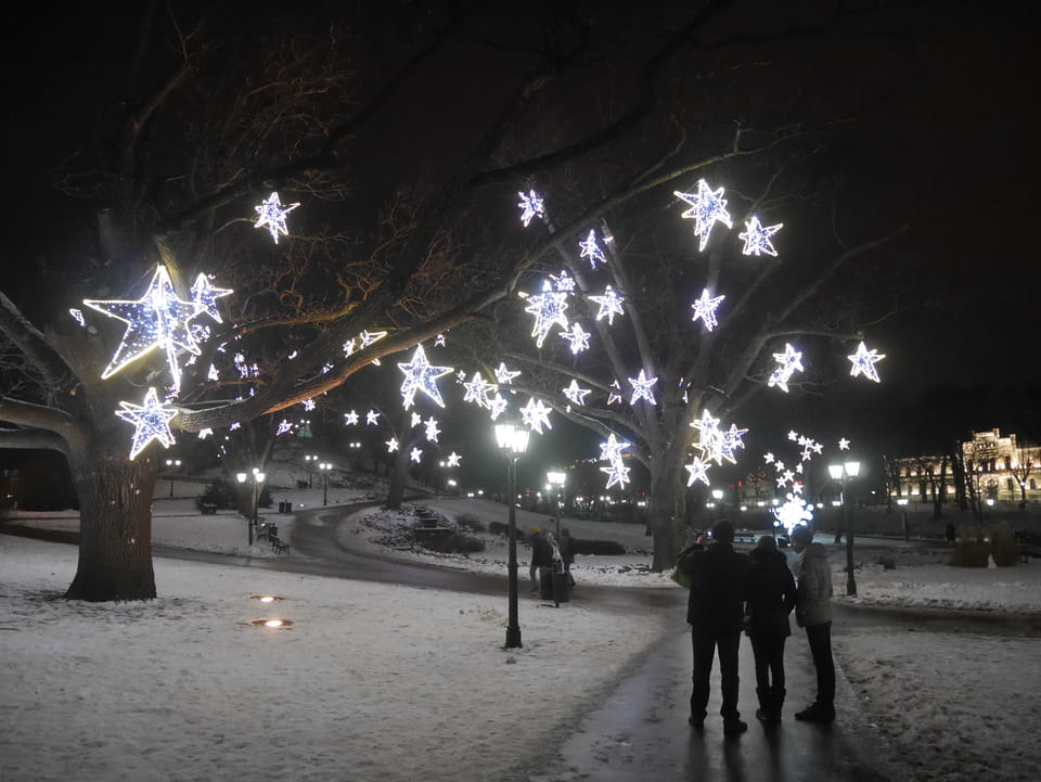 Abends schließlich war die Wäsche getrocknet und ich ging nochmal dick eingemummelt auf die Straße. Irre kalt draußen. Nur mit meiner GF7 machte ich mal Photos. Schön ist’s mit den vielen Lichtern in den Bäumen. Das Abendessen war auch russisch gut.