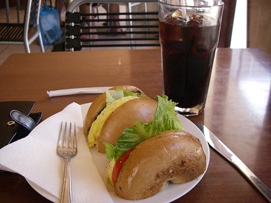Nah 1 dann los. Frühstück und Mittag zugleich im Café. Special aus Omelette-Burger und Ice Coffee für schlappe $6,75 + Tax&Tip. Die hatten dort WLAN. Ich checkte mit dem PocketPC das RescoRadio. Auf dem PPC läuft ein Audiostreaming Client. Man kann also über WLAN Internet Radio empfangen und auch die einzelnen Songs speichern. Coole Sache.