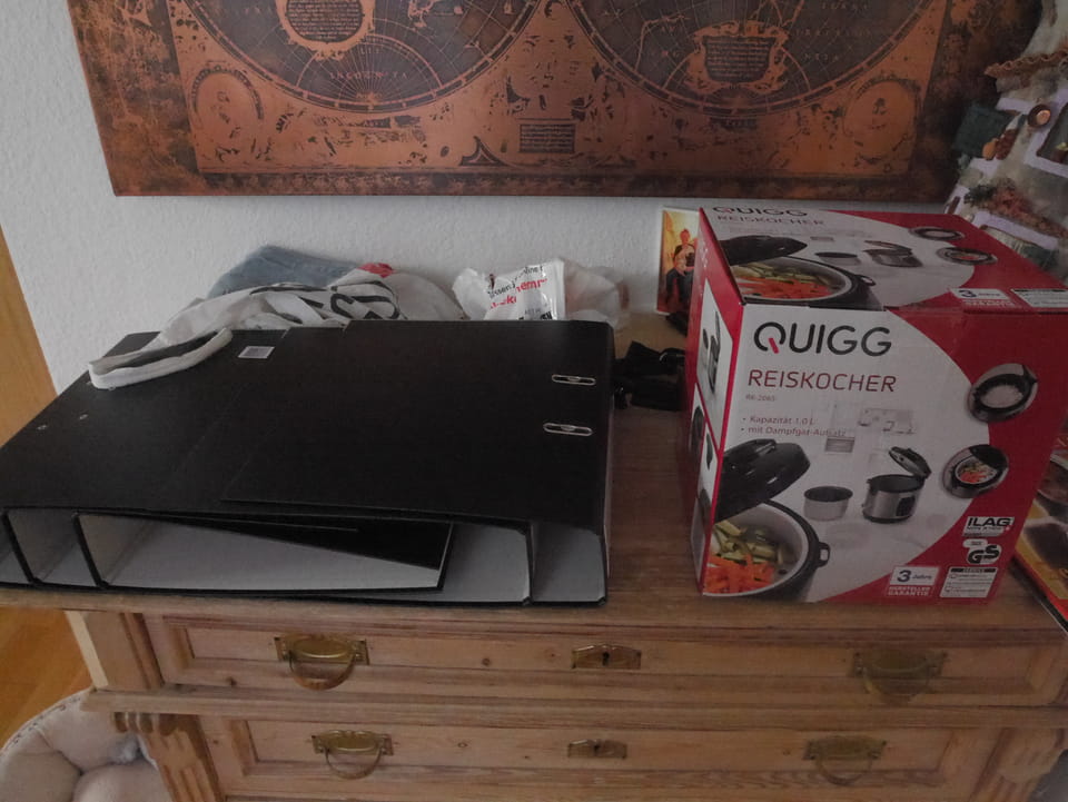 Ich kaufte einen neuen kleinen Reiskocher (€14,99), weil beim alten von 2007 inzwischen das Teflon abblättert. Sollte man nicht essen.