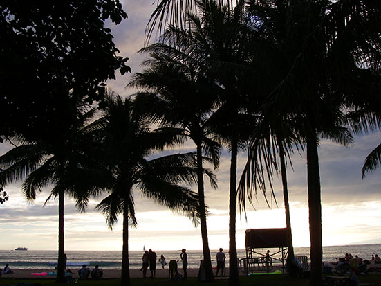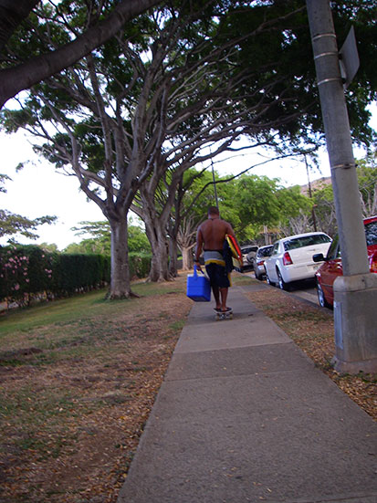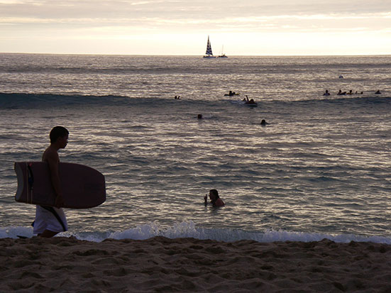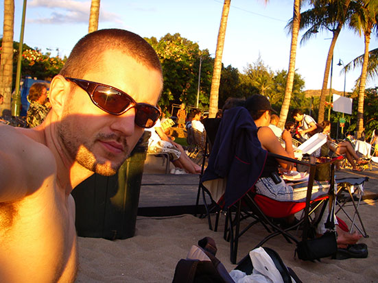 Ich wartete an der Bushaltestelle, Musik aus dem Dell PDA. Dann dauert es mir zu lange und ich ging einfach los. Wieder am Strand angekommen war irgendeine Veranstaltung. So ließ ich mich nieder. „Sunset on the beach“ brachte Musik. In der Woche muss ein Wasserfest zum Gedenken an einen großen Hawaiianer gewesen sein. Surf Competitions usw.. Habe ich verpasst. Schade…