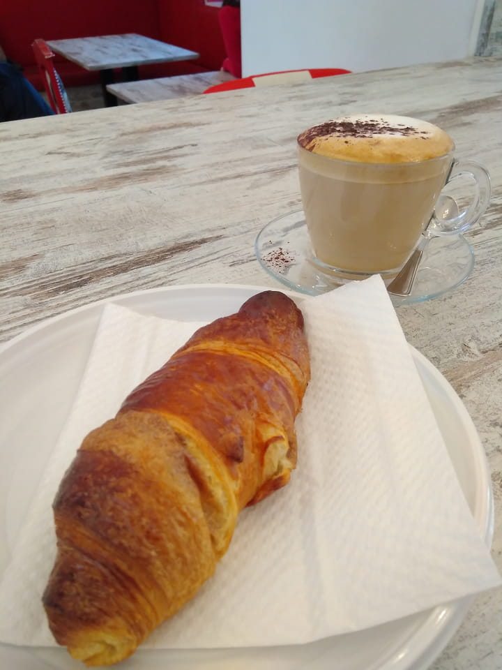 Es klappte alles ganut gut früh. Ich war kurz nach 11 draußen, gab die Bettwäsche ab und checkte aus. Da wollte ich mir ein kleines Frühstück gönnen – Cappuccinu und ein Croissant.