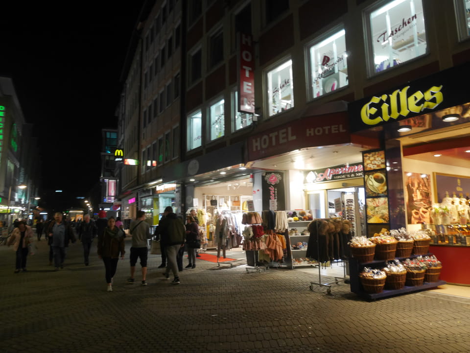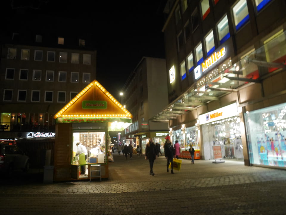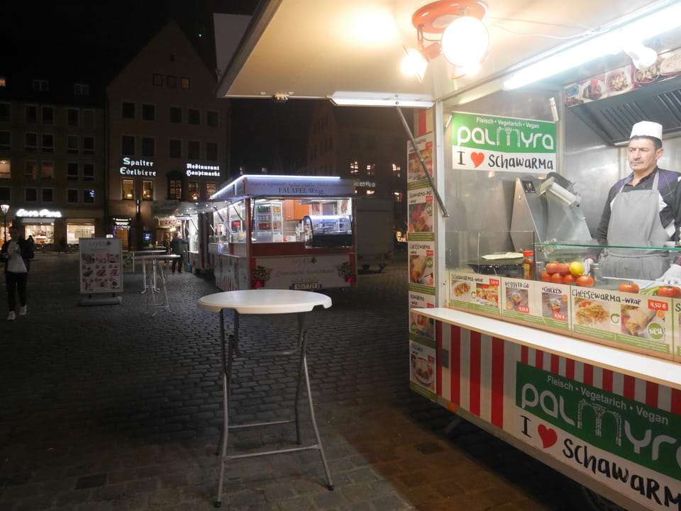 Ich wollte erst Bratwürste essen, doch die Preise €8,50 für 6 Stück mit Kartoffelsalat sind einfach nicht mein Geschmack. Es ging dann an einem Dürüm für €3,50 bei ’nem Syrer. Es standen mind. 3 Falafel Buden am Markt.