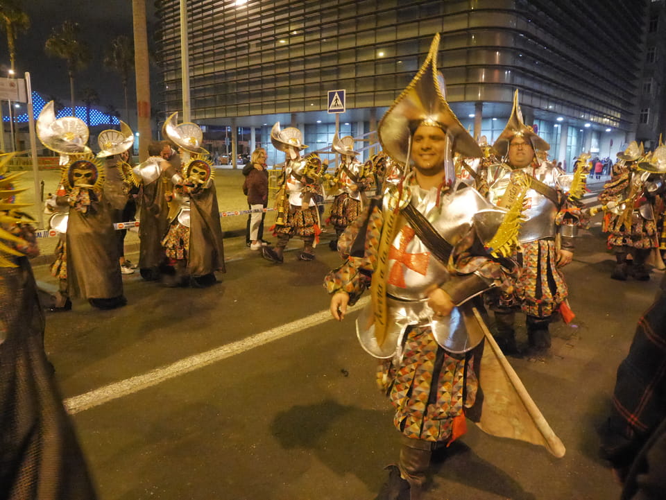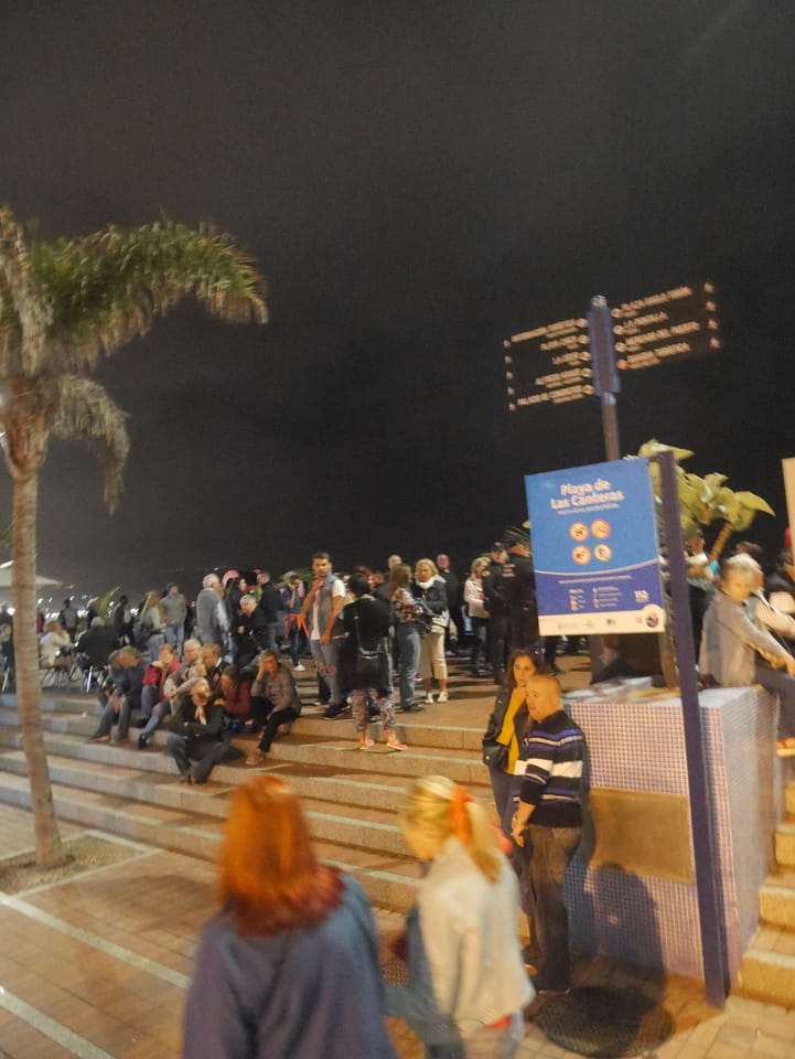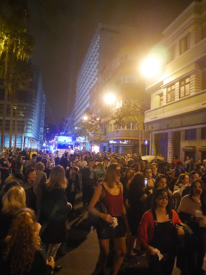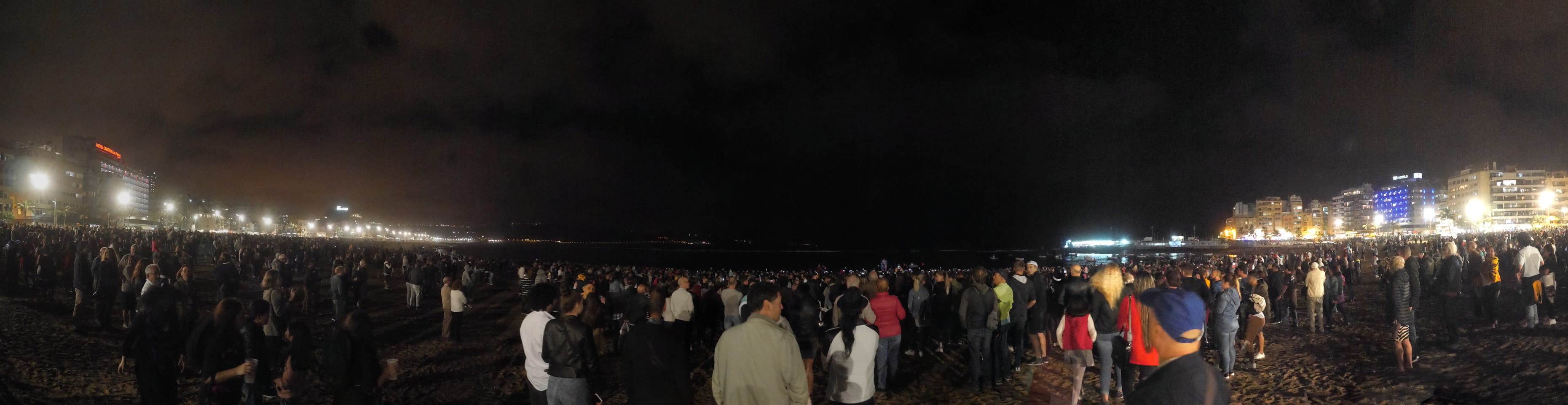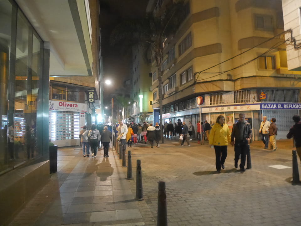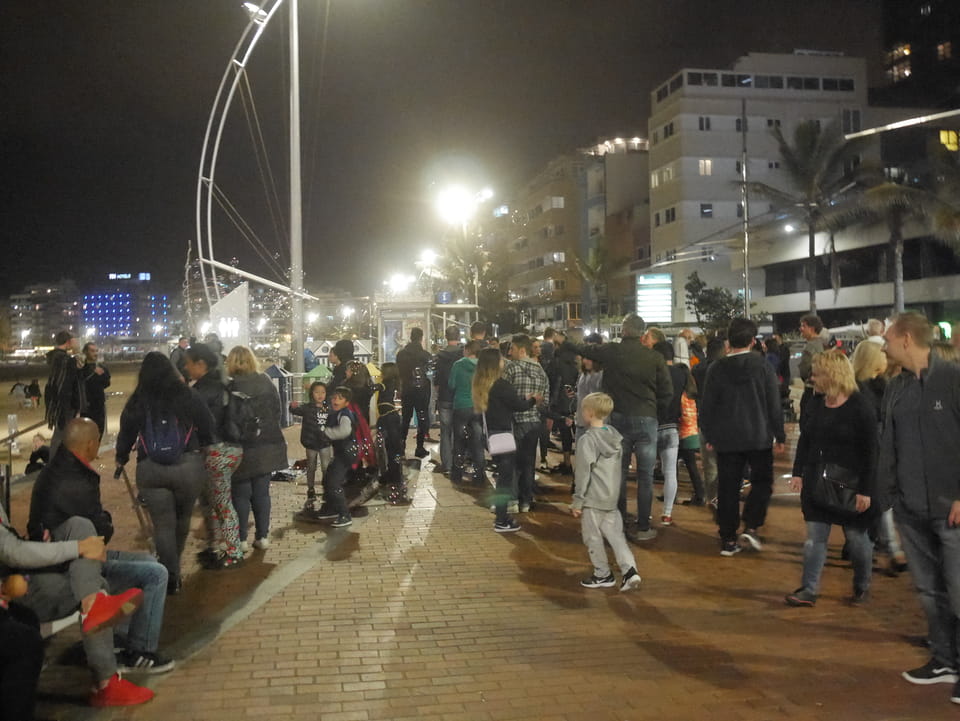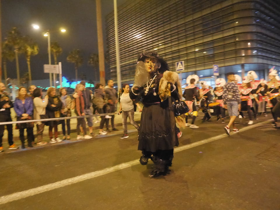 Vor 18:00 zurück in’s Hostel, aß ich etwas Tütensuppe und ging dann gegen 20:00 los, um die Sardine und das Feuerwerk anzuschauen. Wieder alleine unterwegs, weil ich filmen wollte. Die Routine sollte sich etwas ändern, nur müsste ich dann editieren. Aber OK, jetzt waren viele Leute in Las Canteras unterwegs. Die meisten gingen Richtung Norden. Ich hatte keine Ahnung, wo die Sardine angezündet war, doch der Menschenstrom war gut erkennbar. Ich sah dann Polizei und Absperrungen. Die letzte Prozession des Las Palma Carnavals. Die Tradition hier ist, dass Männer sich als Frauen verkleiden und eine Trauerfeier parodieren. Da wird geheult und gejammert, dass die Feier nun zu Ende sei. Es gab auch ein paar Trommler und Tanzgruppen, bevor zwei Trucks die Sache abschlossen.