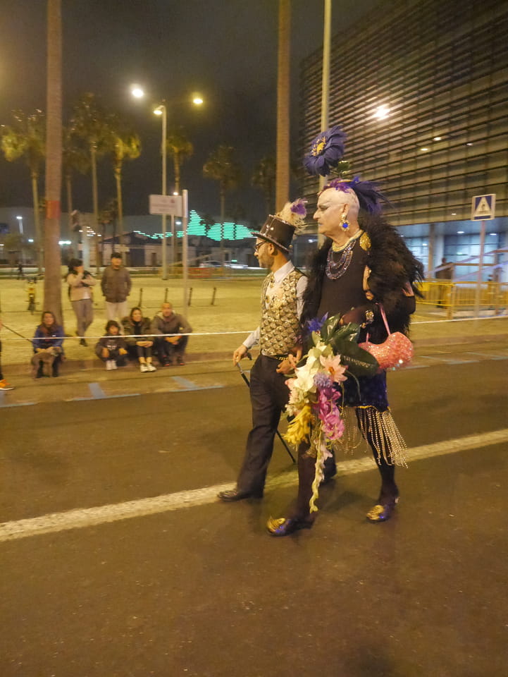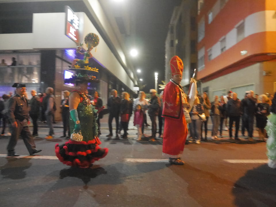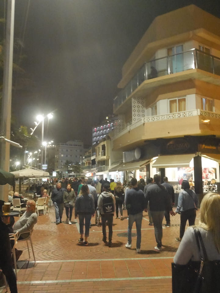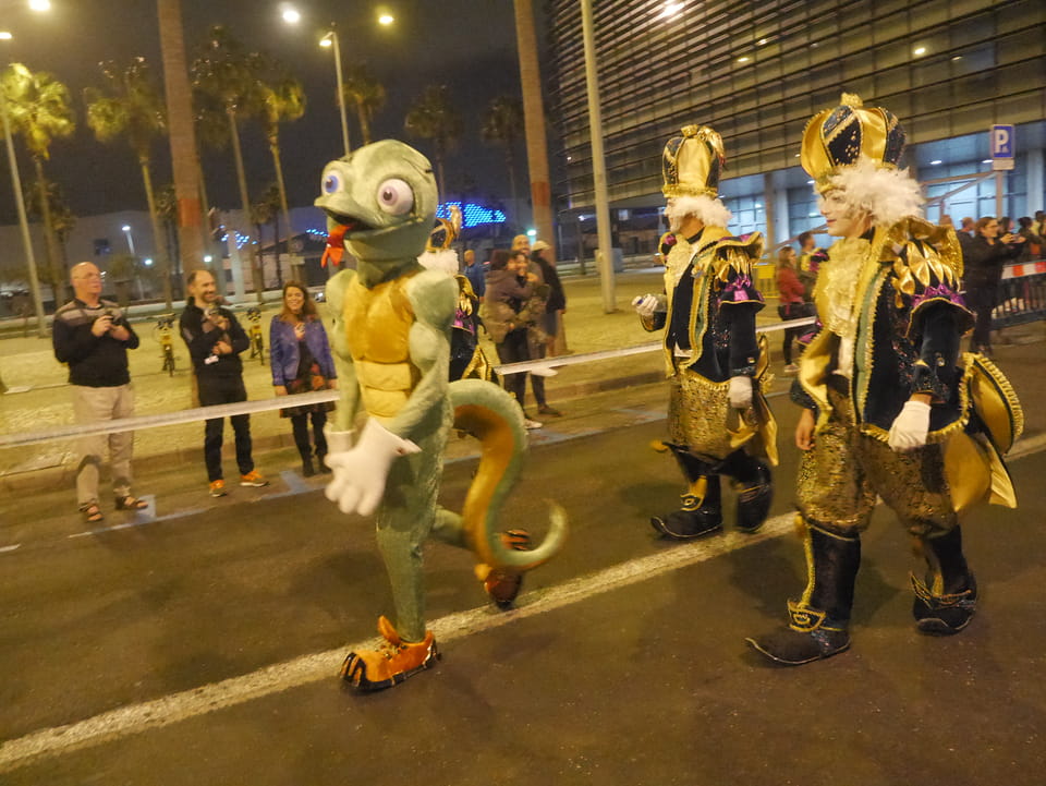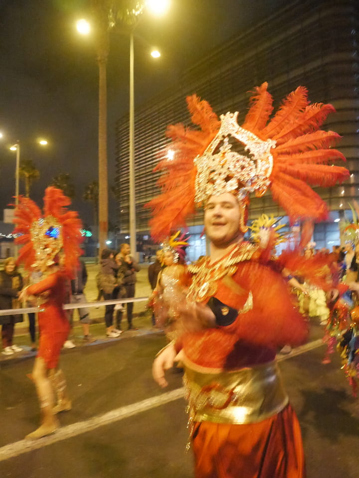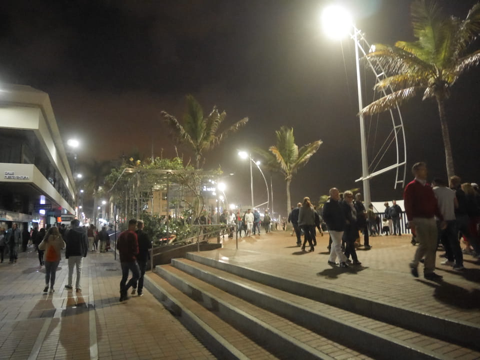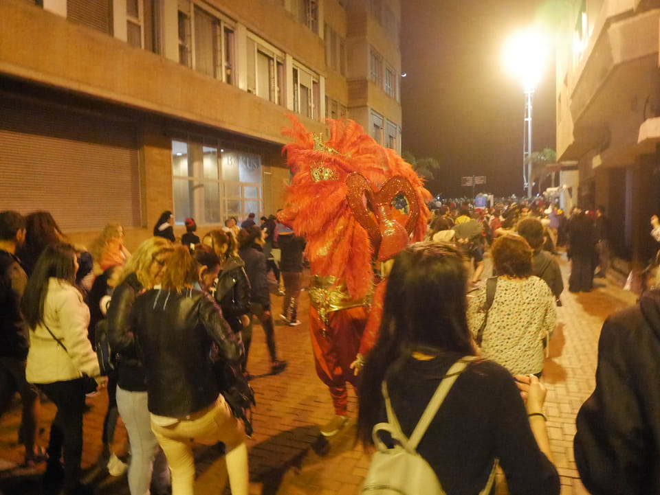 Vor 18:00 zurück in’s Hostel, aß ich etwas Tütensuppe und ging dann gegen 20:00 los, um die Sardine und das Feuerwerk anzuschauen. Wieder alleine unterwegs, weil ich filmen wollte. Die Routine sollte sich etwas ändern, nur müsste ich dann editieren. Aber OK, jetzt waren viele Leute in Las Canteras unterwegs. Die meisten gingen Richtung Norden. Ich hatte keine Ahnung, wo die Sardine angezündet war, doch der Menschenstrom war gut erkennbar. Ich sah dann Polizei und Absperrungen. Die letzte Prozession des Las Palma Carnavals. Die Tradition hier ist, dass Männer sich als Frauen verkleiden und eine Trauerfeier parodieren. Da wird geheult und gejammert, dass die Feier nun zu Ende sei. Es gab auch ein paar Trommler und Tanzgruppen, bevor zwei Trucks die Sache abschlossen.