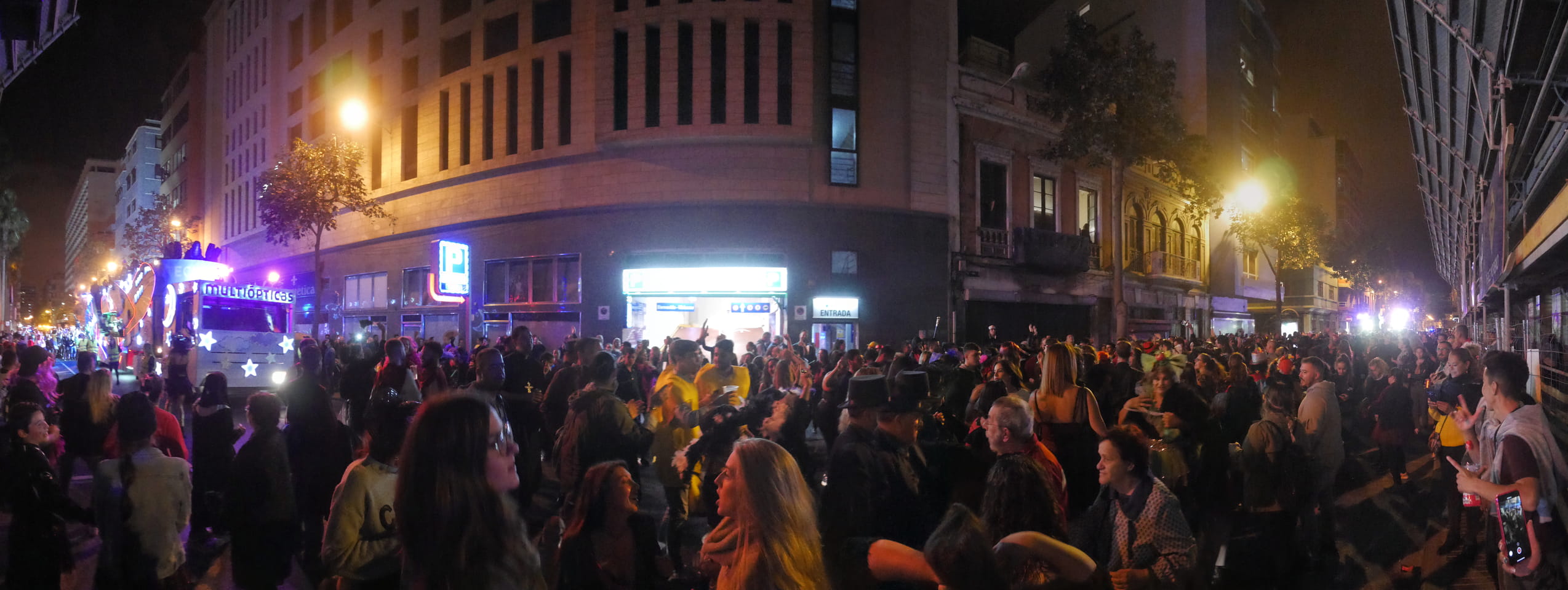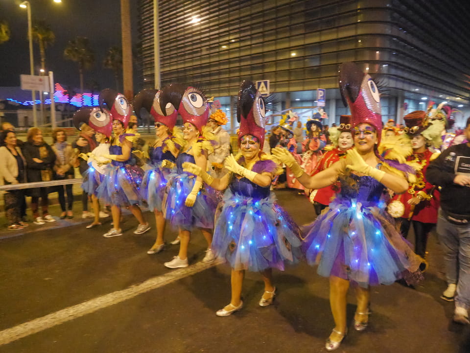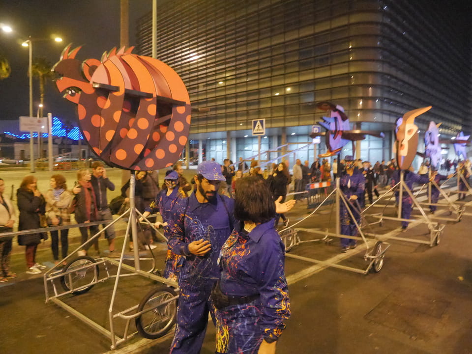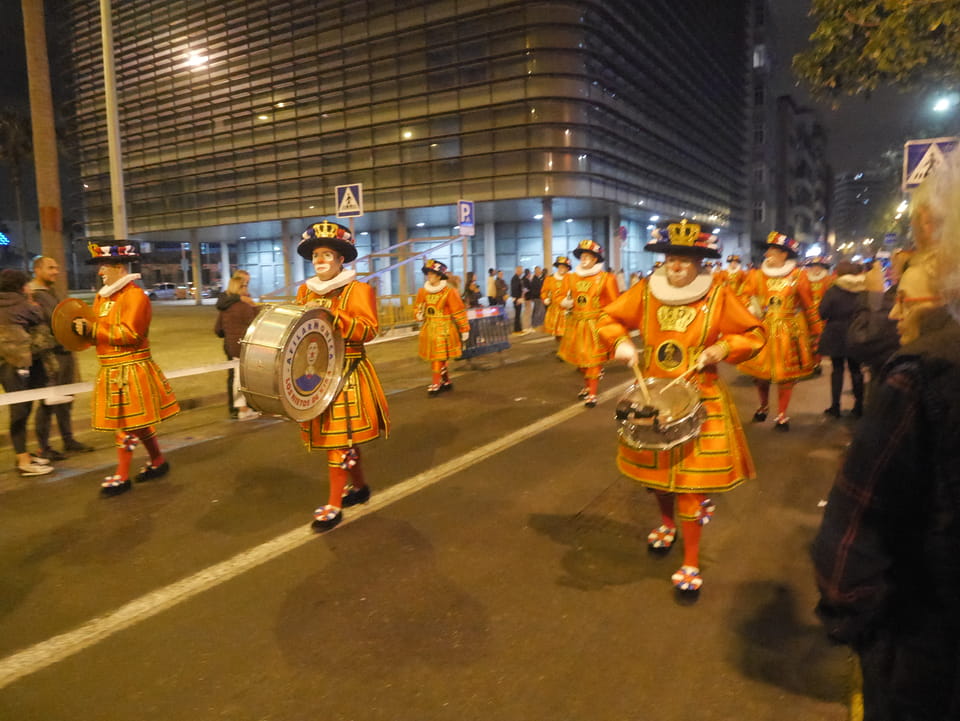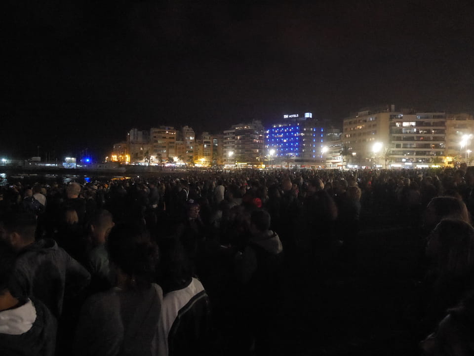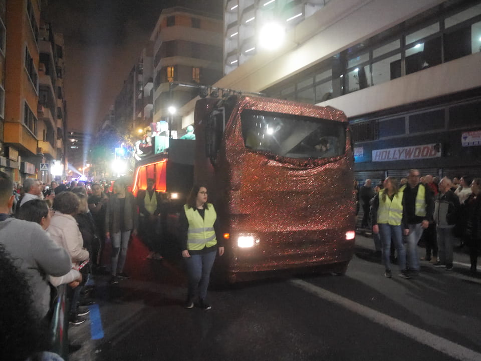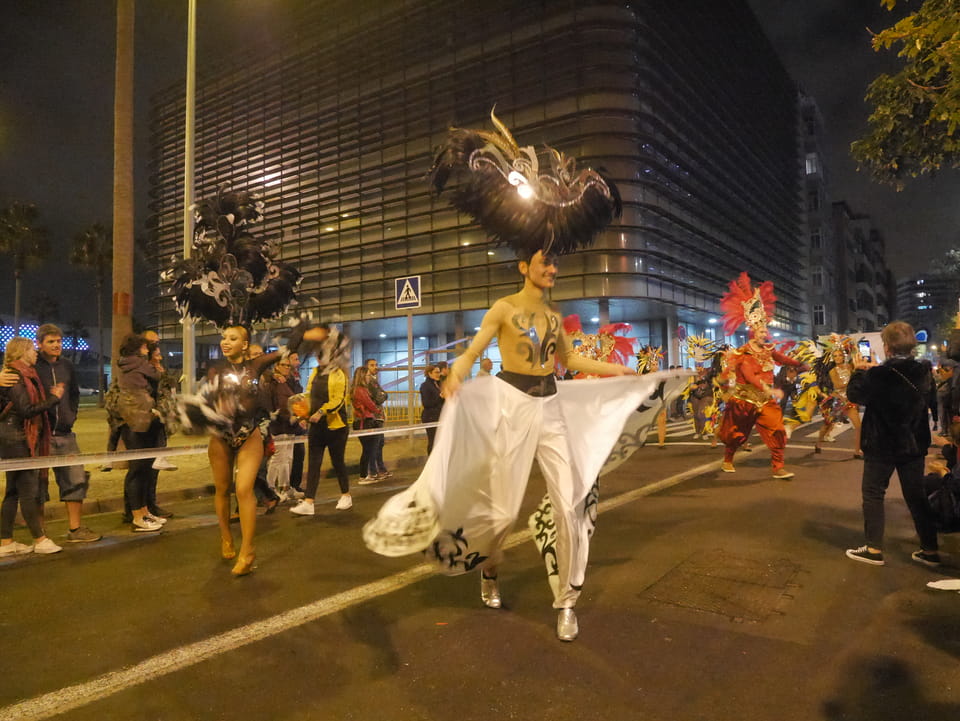 Vor 18:00 zurück in’s Hostel, aß ich etwas Tütensuppe und ging dann gegen 20:00 los, um die Sardine und das Feuerwerk anzuschauen. Wieder alleine unterwegs, weil ich filmen wollte. Die Routine sollte sich etwas ändern, nur müsste ich dann editieren. Aber OK, jetzt waren viele Leute in Las Canteras unterwegs. Die meisten gingen Richtung Norden. Ich hatte keine Ahnung, wo die Sardine angezündet war, doch der Menschenstrom war gut erkennbar. Ich sah dann Polizei und Absperrungen. Die letzte Prozession des Las Palma Carnavals. Die Tradition hier ist, dass Männer sich als Frauen verkleiden und eine Trauerfeier parodieren. Da wird geheult und gejammert, dass die Feier nun zu Ende sei. Es gab auch ein paar Trommler und Tanzgruppen, bevor zwei Trucks die Sache abschlossen.