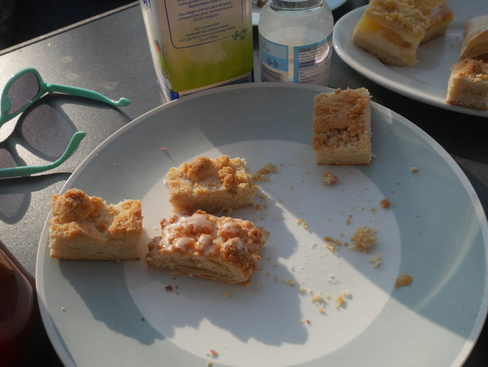Es ging zum Kaffee heute, dank einer Einladung meines Bruders in seinen Garten. Sehr nett bei tollem Wetter. Ich musste mein Auto etwas schlecht parken. Das war ein Privatgrundstück aber sonst sah ich nix. Der Hudn war auch mit und so ließ ich’s darauf ankommen.