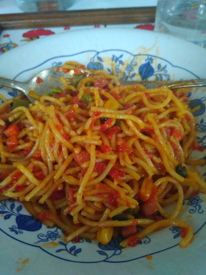 Ich fuhr auch bei Netto vorbei, kaufte Kleinigkeiten ein und machte mir ein ganz nettes Essen. Das Kilo Nudeln war mit etwas Relish OK.