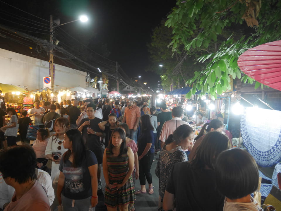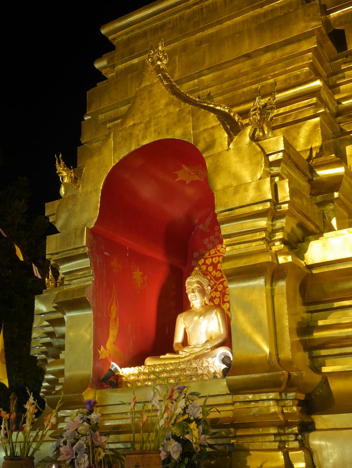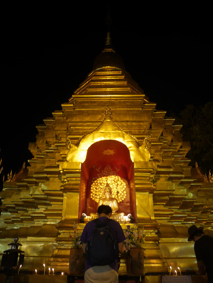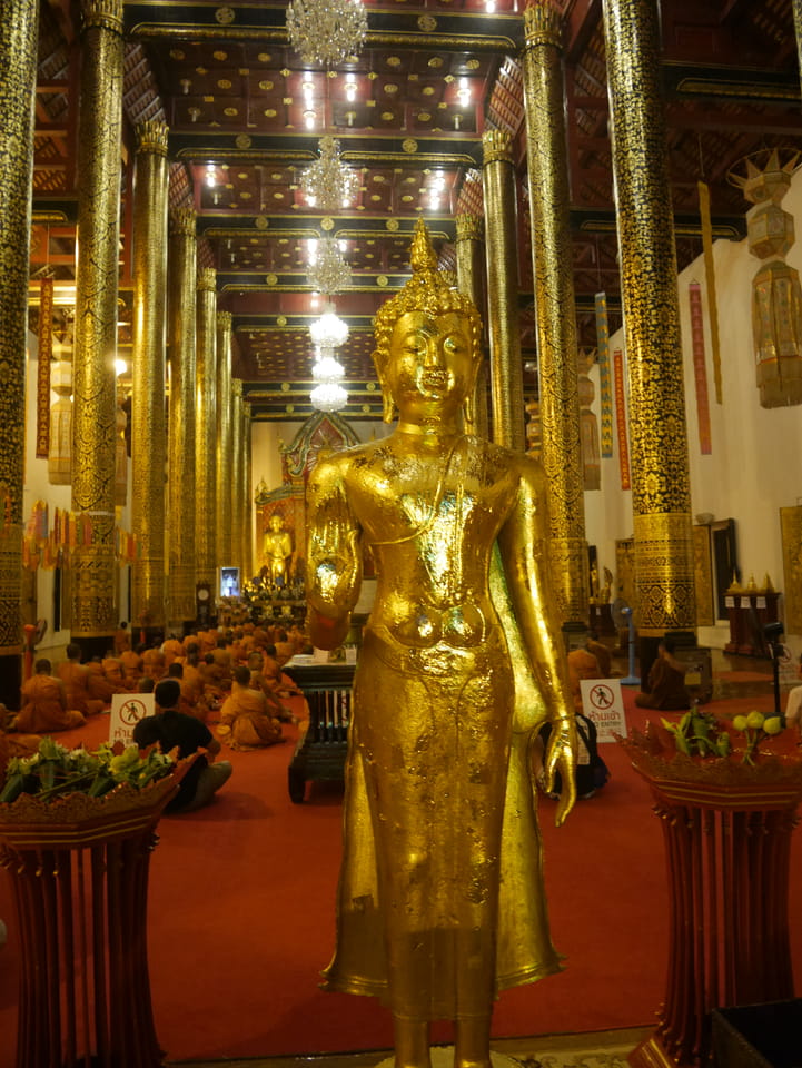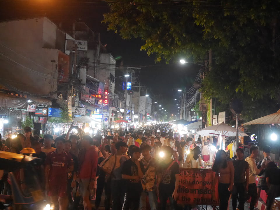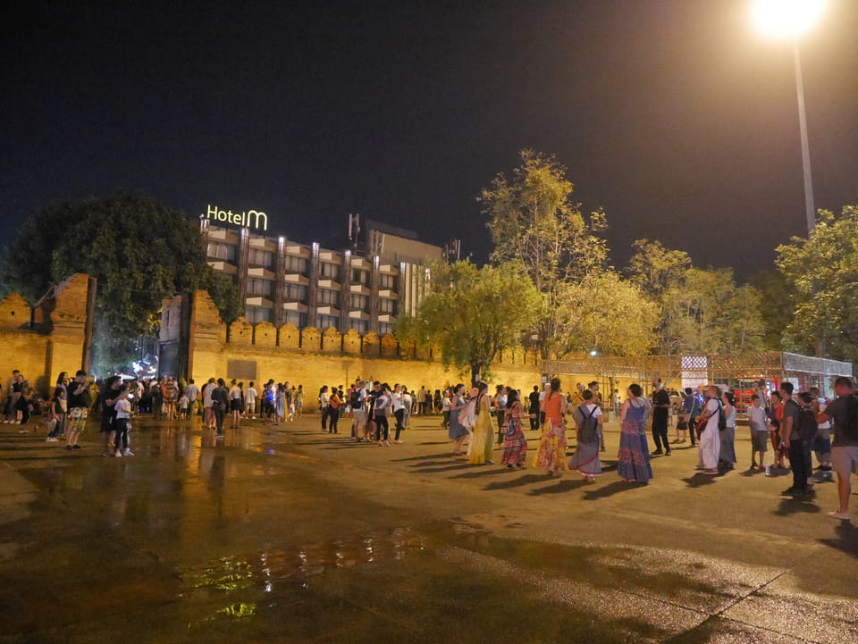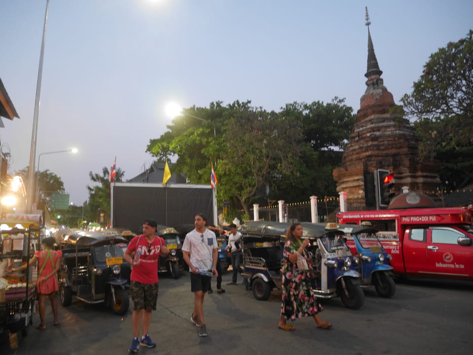 Zuerst schaute ich im Wat Chedi Luang rein (THB 40 Eintritt). Tolle Atmosphäre mit Gebet der Mönche. Danach ging’s zum Markt, wo die Menschmassen sich durch die Straßen schlenderten. Ich war nicht der Einzige, der heute die Sache per Walking Video filmte. Ich ging mit Umwegen bis zum Tha Phae Gate und da war der Osmo auch fertig. das passte fast bis auf die Sekunde genau. Glück gehabt.