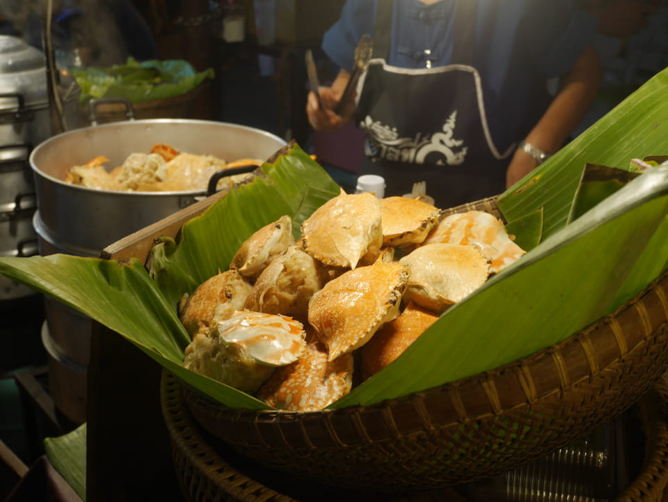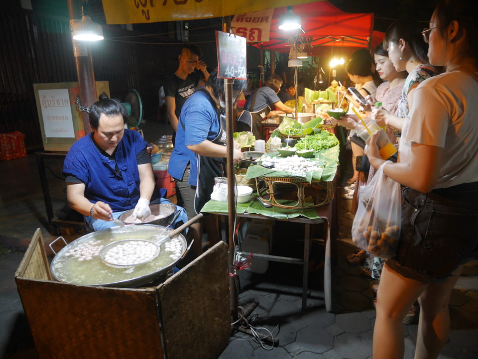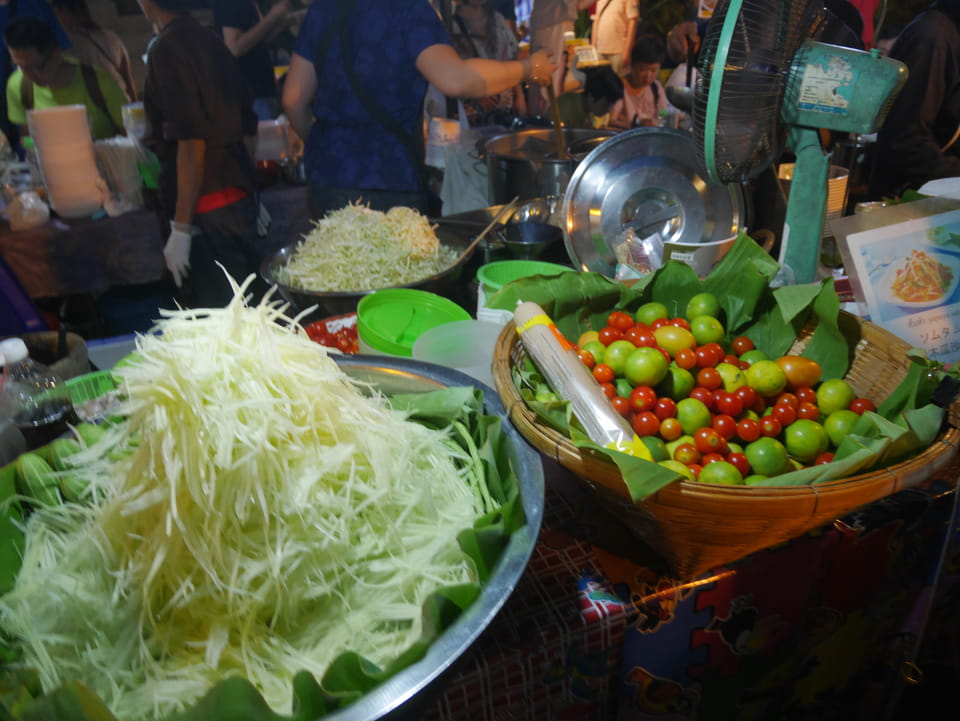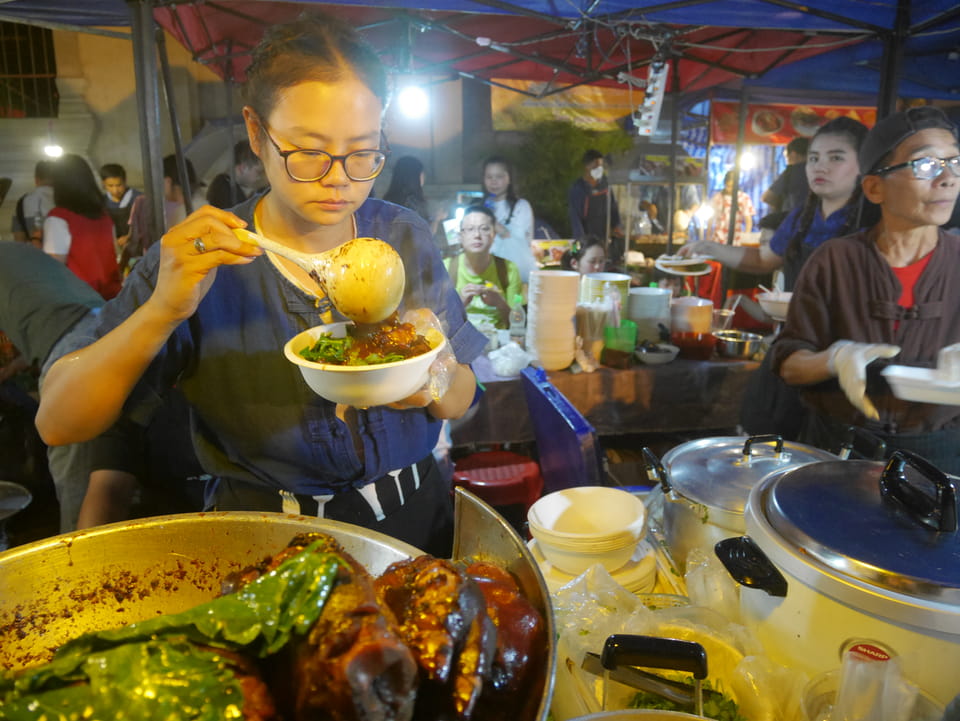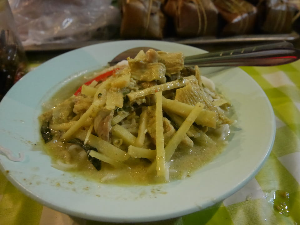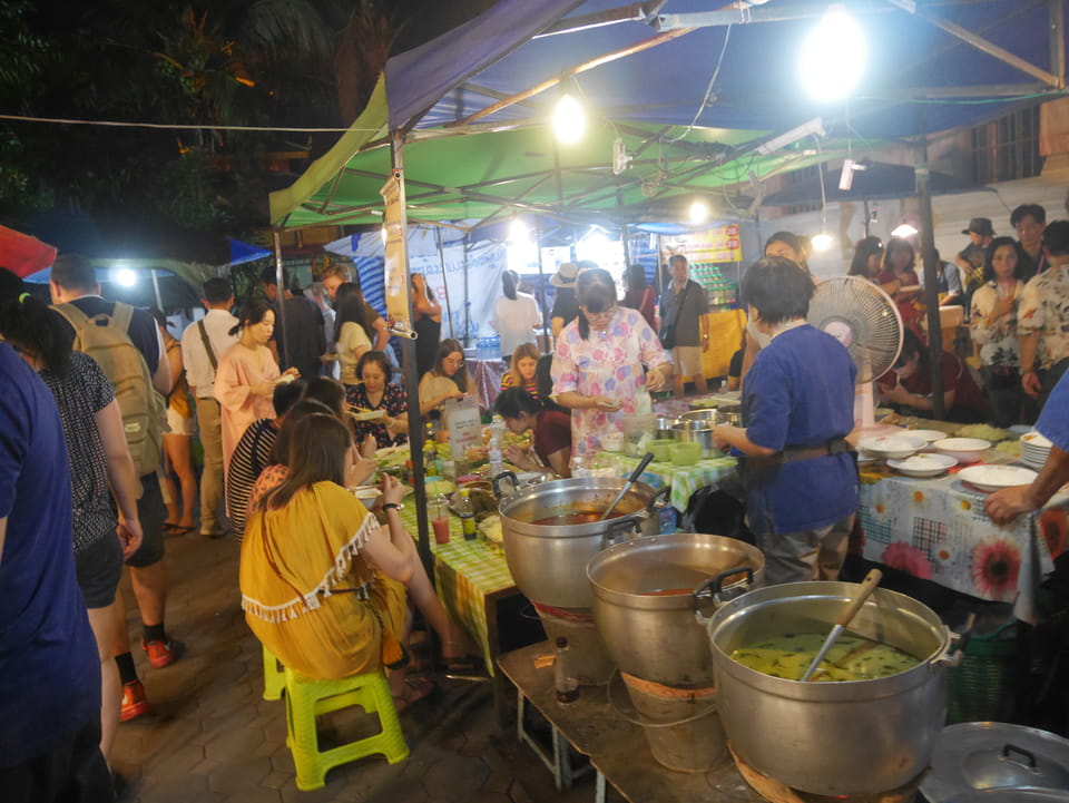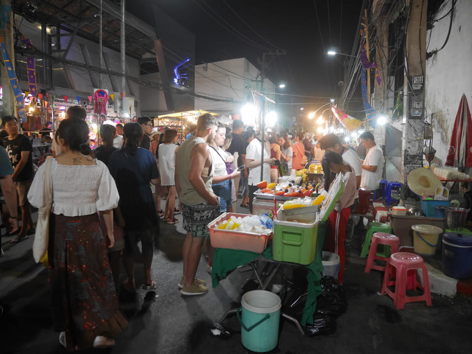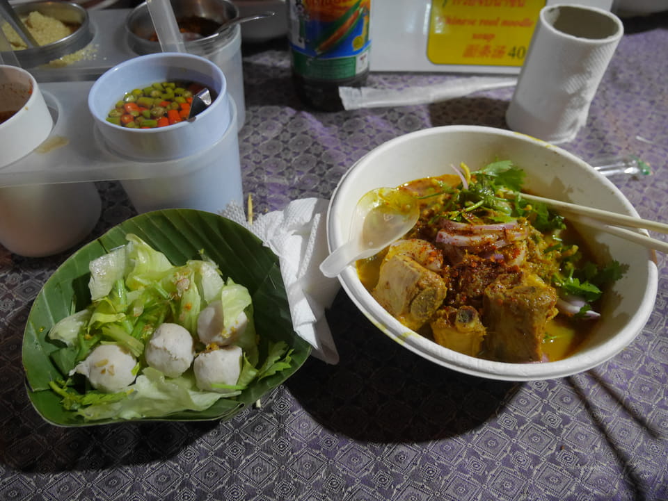Na gut, die „Arbeit“ war getan. Nur um die 35′ Video halt – mehr geht eben in der Hitze nicht. Jetzt konnte ich die Essenstände genießen. Da fand ich endlich eine Khao Soi (mit Schwien mal) und danach noch ein Gürnes Curry mit Huhn. ganz gut beides, wenn ich auch schon bessere Versionen hatte. Ich hatte dann doch genug gesehen, saß eine Weile abseits bei einem Mango/Papaya – Saft. Eine Straße weiter ist es menschenleer. Alles konzentriert sich eben auf den Nachtmarkt.