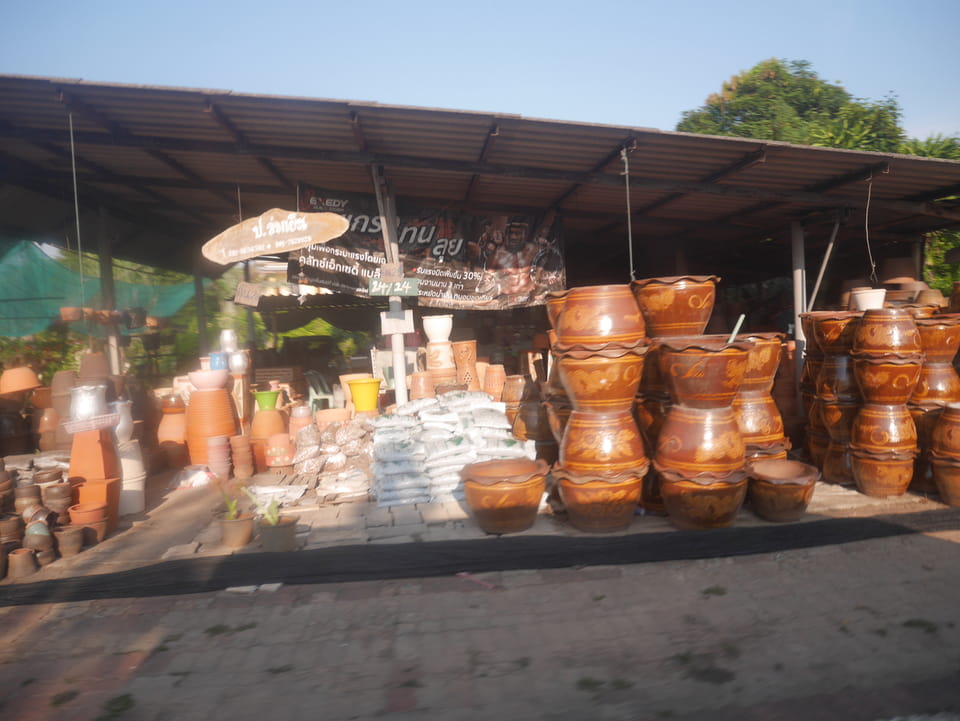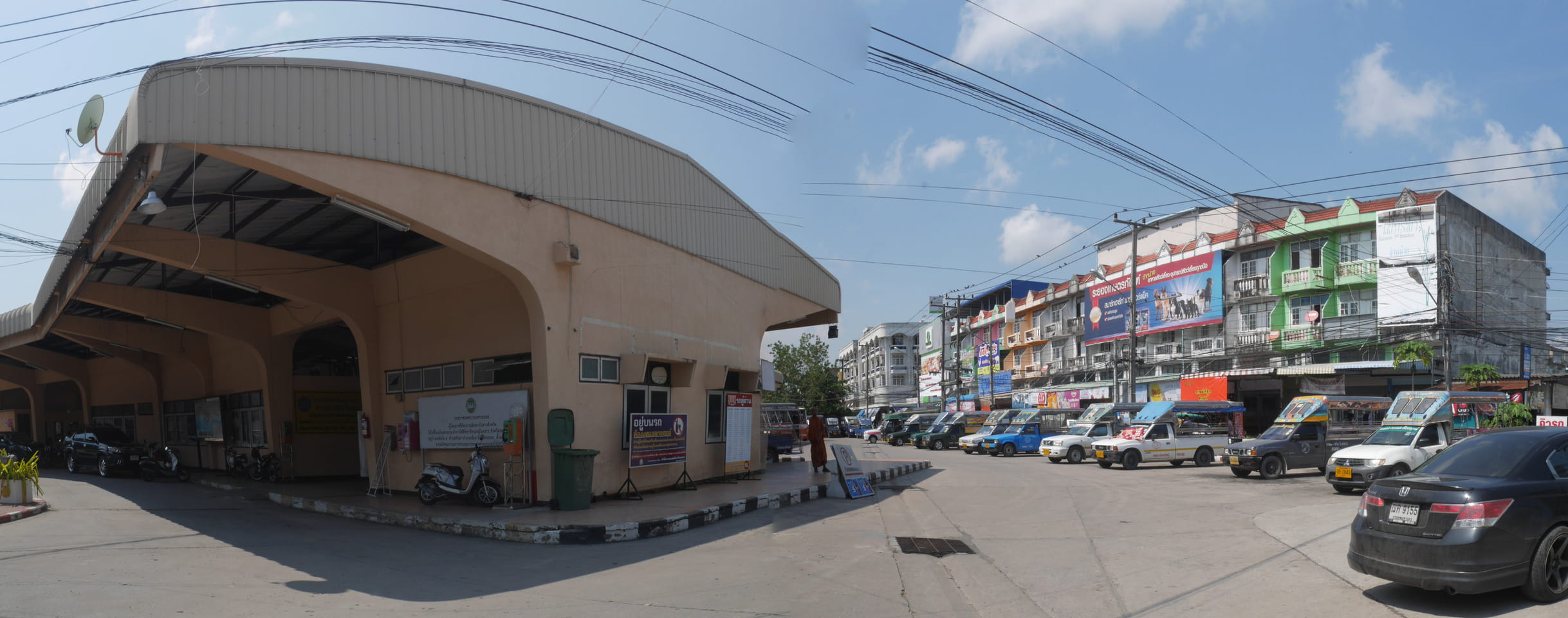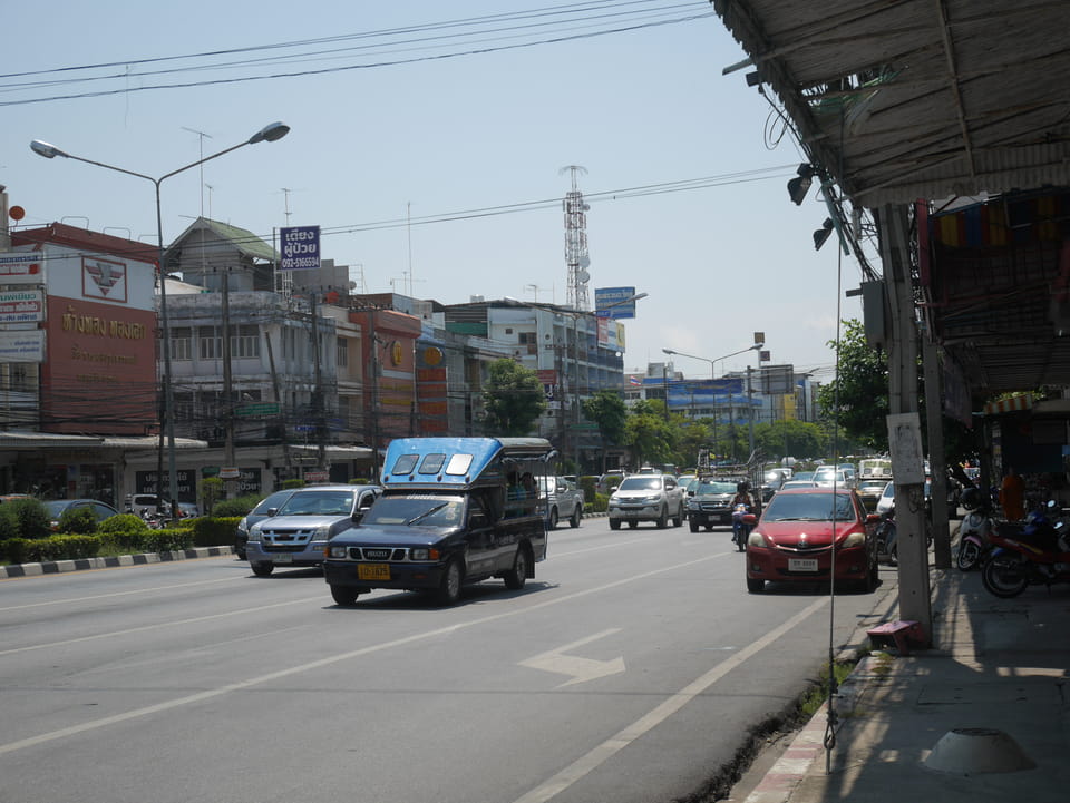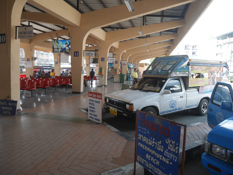 Ich ging als zum Busbahnhof, wo hauptsächlich Pickups und Minibusse herumstanden. Ich fragte mich durch und kaufte das Ticket für 120THB (€3,50). Es war inzwischen 14:40 und der nächste Bus sollte 15:20 fahren. Ich setzte mich erst mal, sollte ich was zu Mittag essen? Kaum saß ich 5-10′ rief die Ticketverkäuferin. Da war doch schon ein Minibus bereit. Ein Platz frei, mein fetter Rucksack gerade so hinten zwischen die Sitze und ab ging die Fahrt.