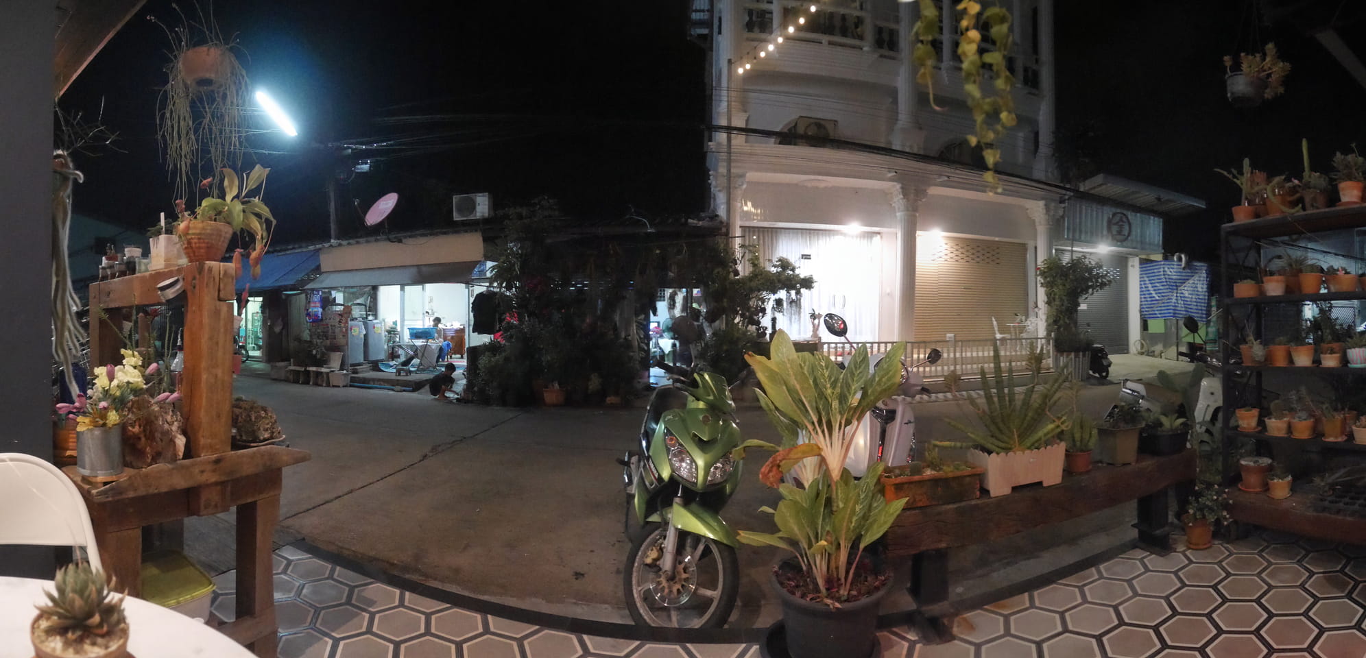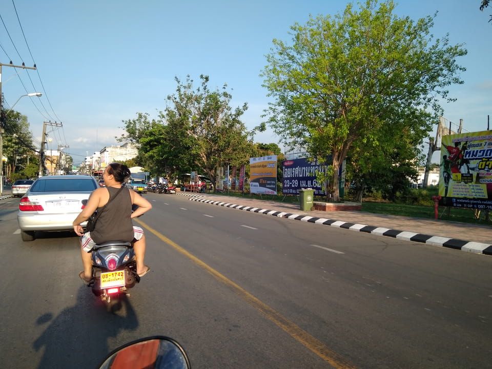 Erst gegen 17:00 war die Endhaltestelle erreicht. Ich kroch aus dem Van und nun ja – was nun? Keiner interessierte sich für mich. Taxis konnte ich nicht ausmachen. Ich ging erst mal zur anderen Straßenseite, dann wieder zurück zum Busterminal und nahm mir ein Moto Taxi. Ich hatte die Adresse eines Hostels parat und die Fahrer (und Fahrerin) diskutierten die Lage. Dann war klar wohin ich will. Mein kleiner Technikrucksack beim Fahrer vorn, ich mit dem 19kg Teil hinten. Das Moped ächzte, der Fahrer war etwas besorgt. Ich machte mir bei Beschleunigungen auh Sorgen, denn der Rucksack an mir zog mich da ordentlich nach hinten. Es ging aber alles gut: 40 THB wollte er, ich gab dann noch 20 Trickgeld.