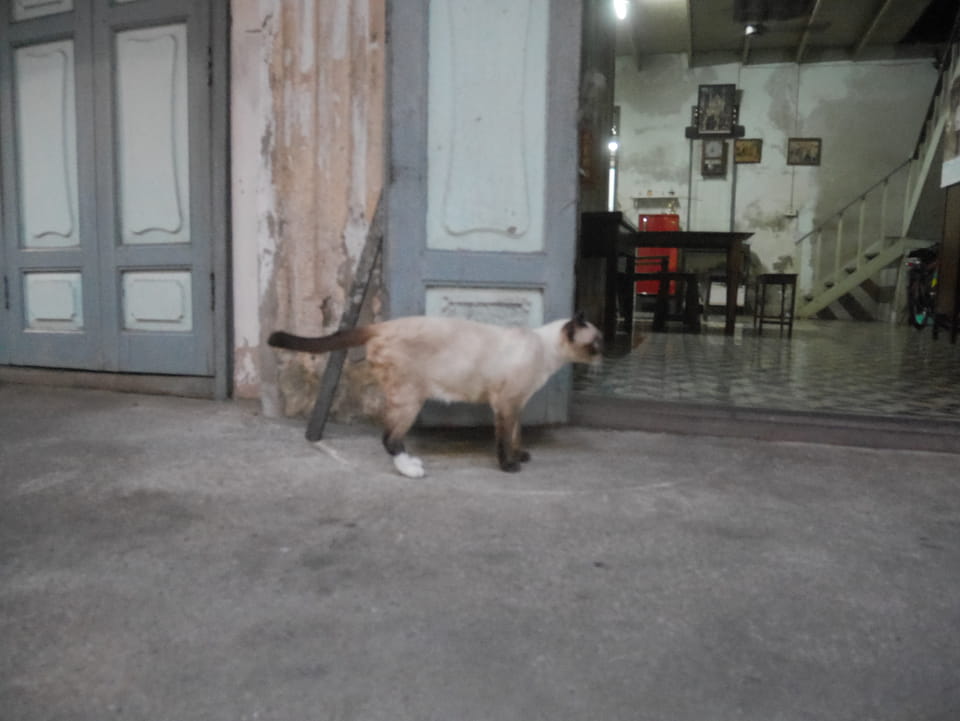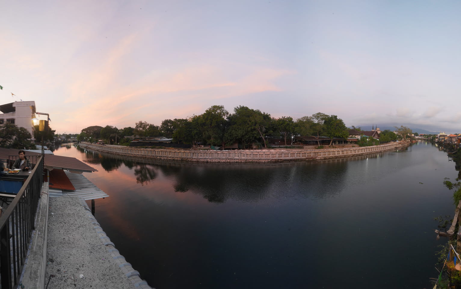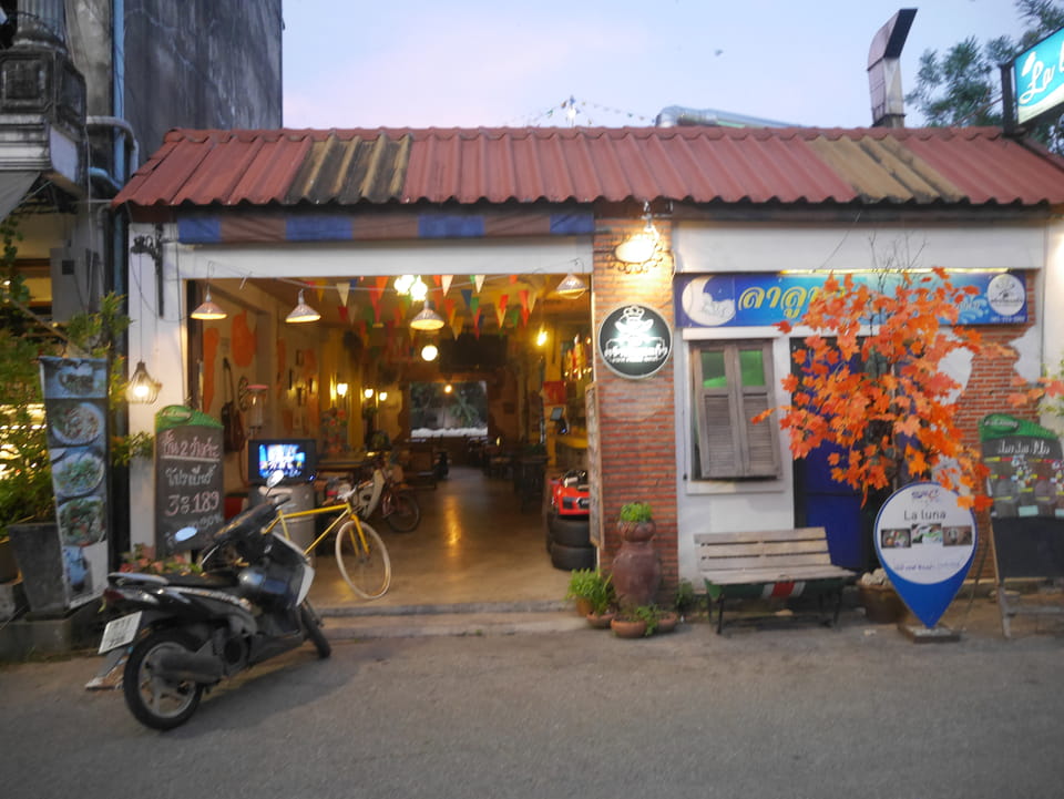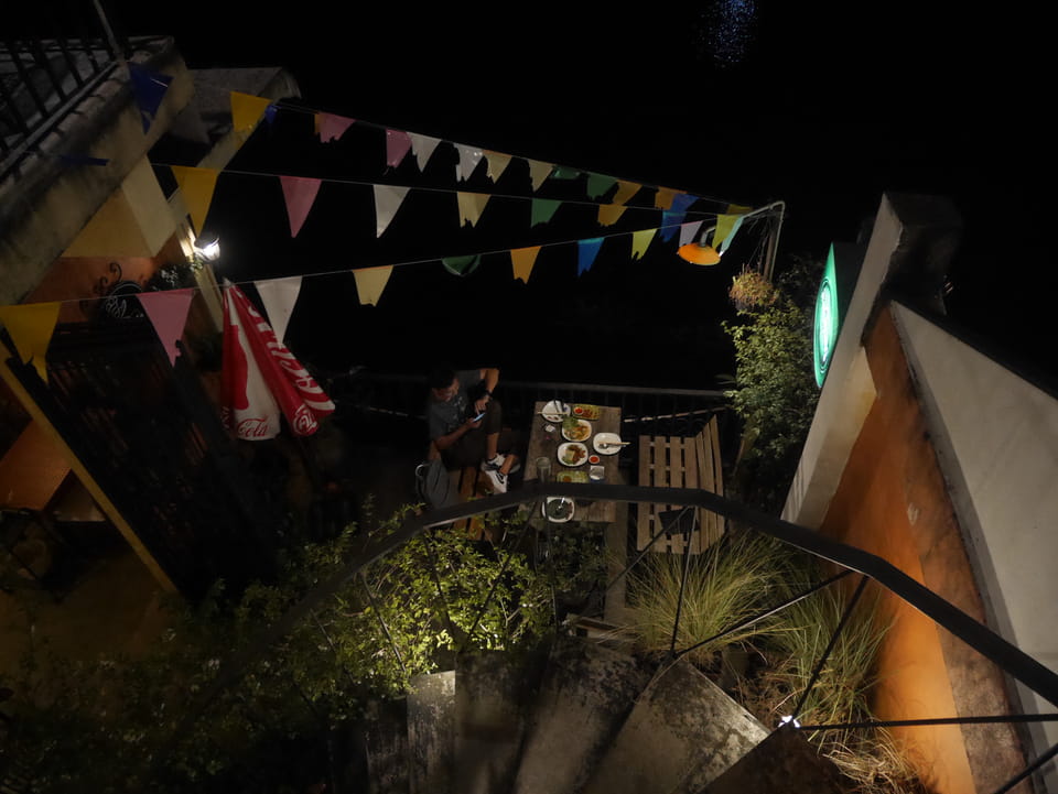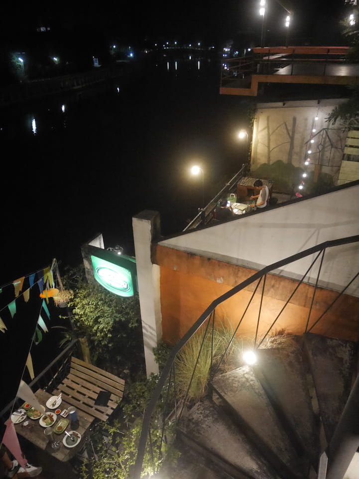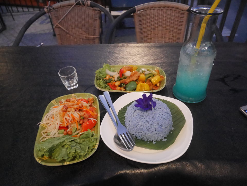 Alles ganz nett und auch nur mit warmen Kühlakku zog die Osmo heute die knapp 40′ ohne KO durch. Ich war dagegen echt fertig, durchsgeschwitzt im Saunawetter. So kehrte ich mit dem Sonnenuntergang in ein Café ein, was ich vorher schon gesehen hatte. Dort setzte ich mich auf die Terasse, bestellte zwei Sachen und genoss den Abend. Das Essen ganz gut, blauer Reis und blaue Limo zur blauen Stunde. Es wurde finster ich satt und zahlte die doch etwas hohe Rechnung von 244 THB.