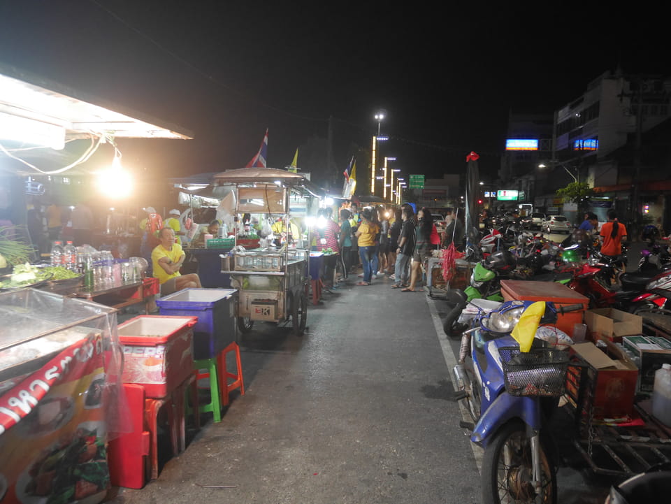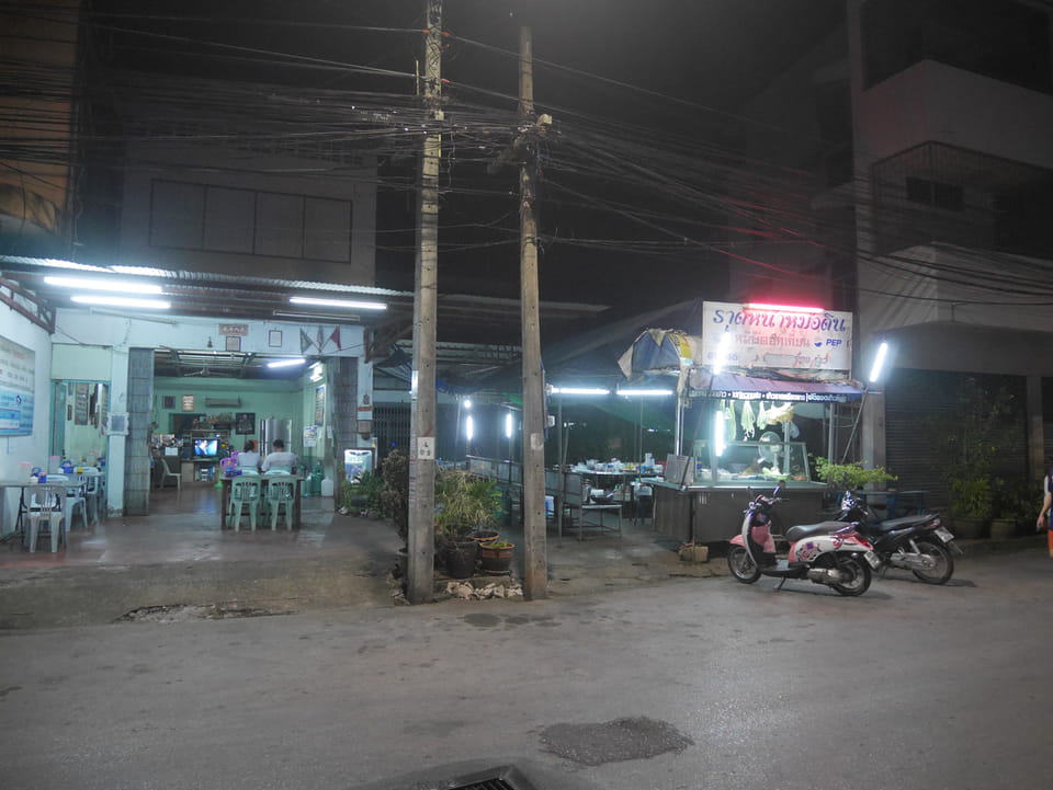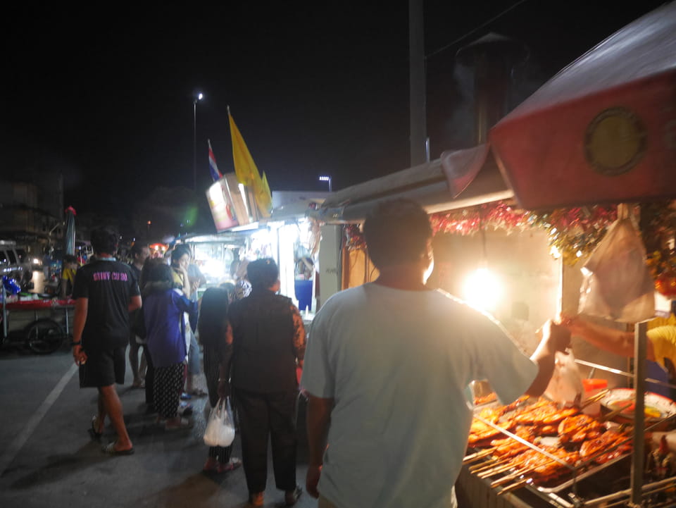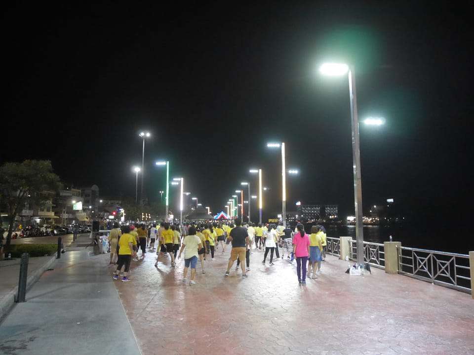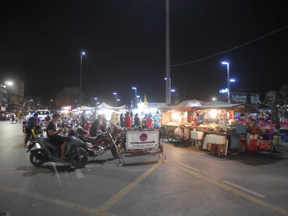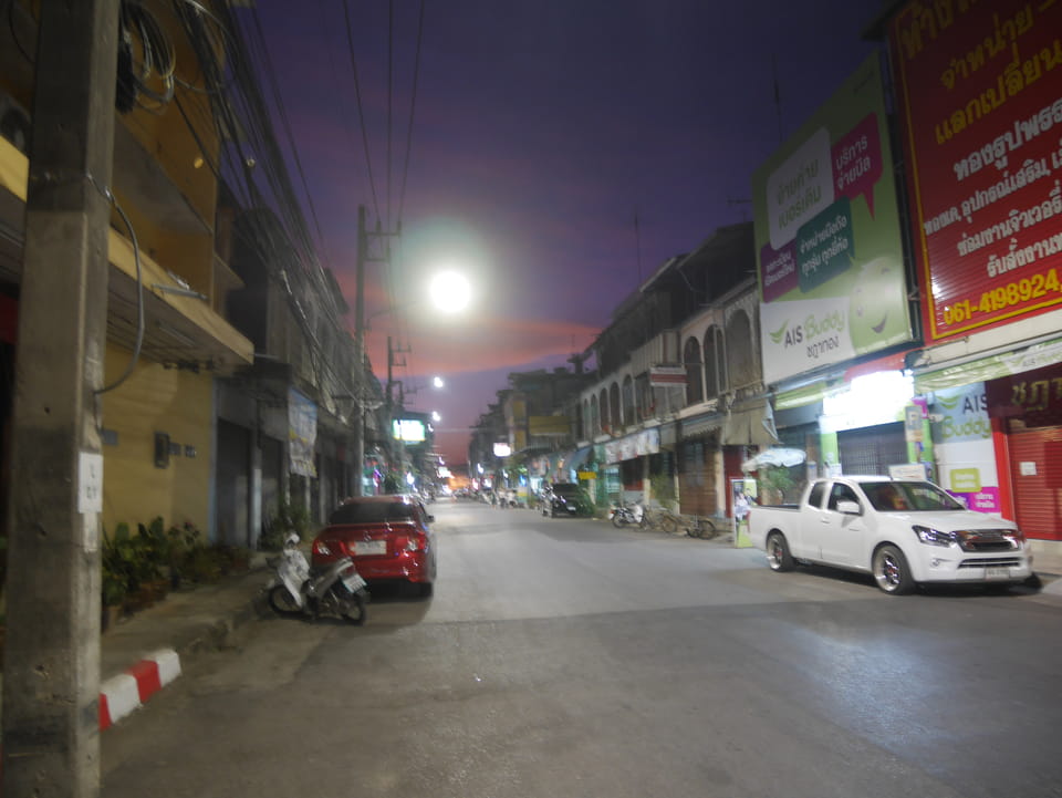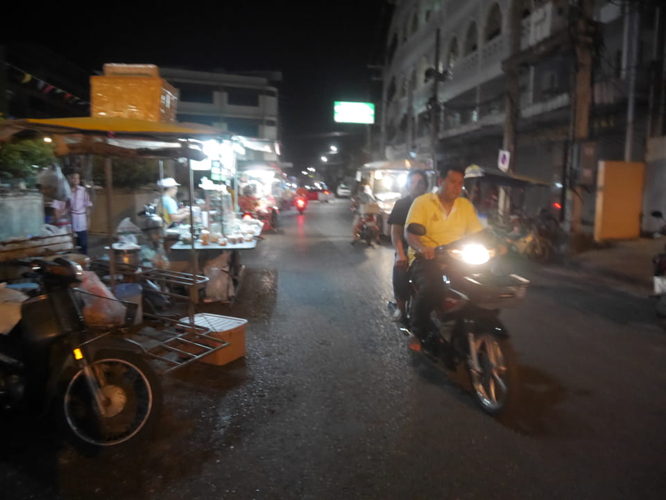 Weit nach Sonnenuntergang kam ich erst in’s Zentrum, drehte eine Runde über den Nachtmarkt und am Wasser entlang. Eine nette Atmosphäre mit Fitness/Tanzgruppe und eben typisch lokaler Thai Atmosphäre. Als ich die ca 25’ Video im Kasten hatte, wollte ich was essen. Ein Typ schüttelte Thai untypmisch die Hand und machte Druck zur Bestellung. Also OK – Shrimp Pad Thai. Dann nebenan noch ein Lime Soda. Das Limonen Wasser kam 50 THB, was ungefähr das Doppelte des normalen Preises ist. Der Typ dann wollte nicht diskutieren und OK, kann ich verschmerzen. Das Pad Thai auch 50 THB was OK ist, nur war die Qualtät mies. Das schlechteste Pad Thai mit harten Nudeln und lieblos ungerupften Shrimps. Leicht mürrisch heute wollte ich den anderen Touris vom Laden abraten aber naja, lies es dann doch.