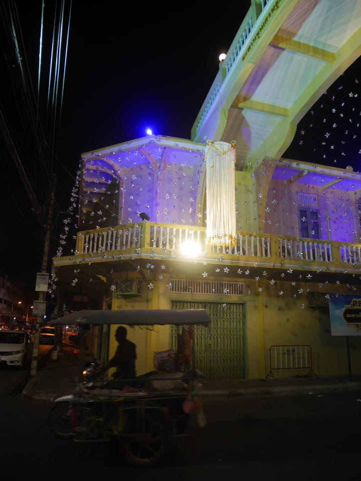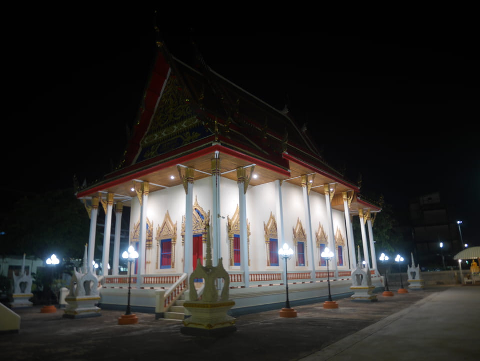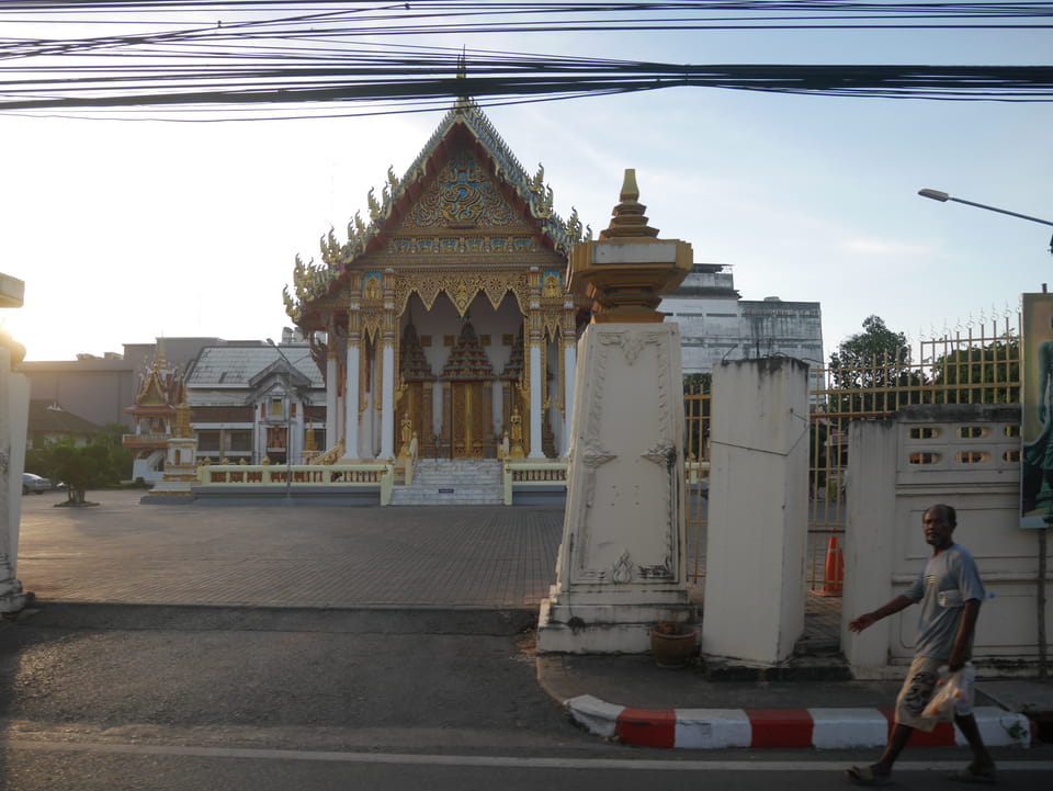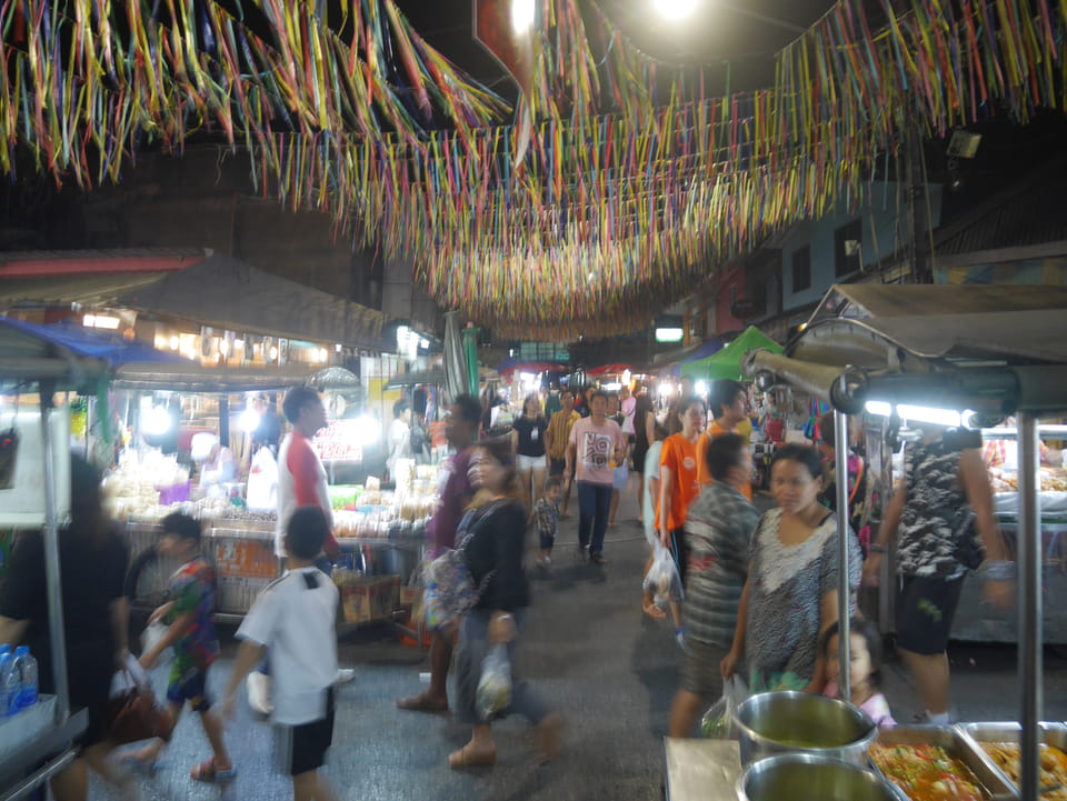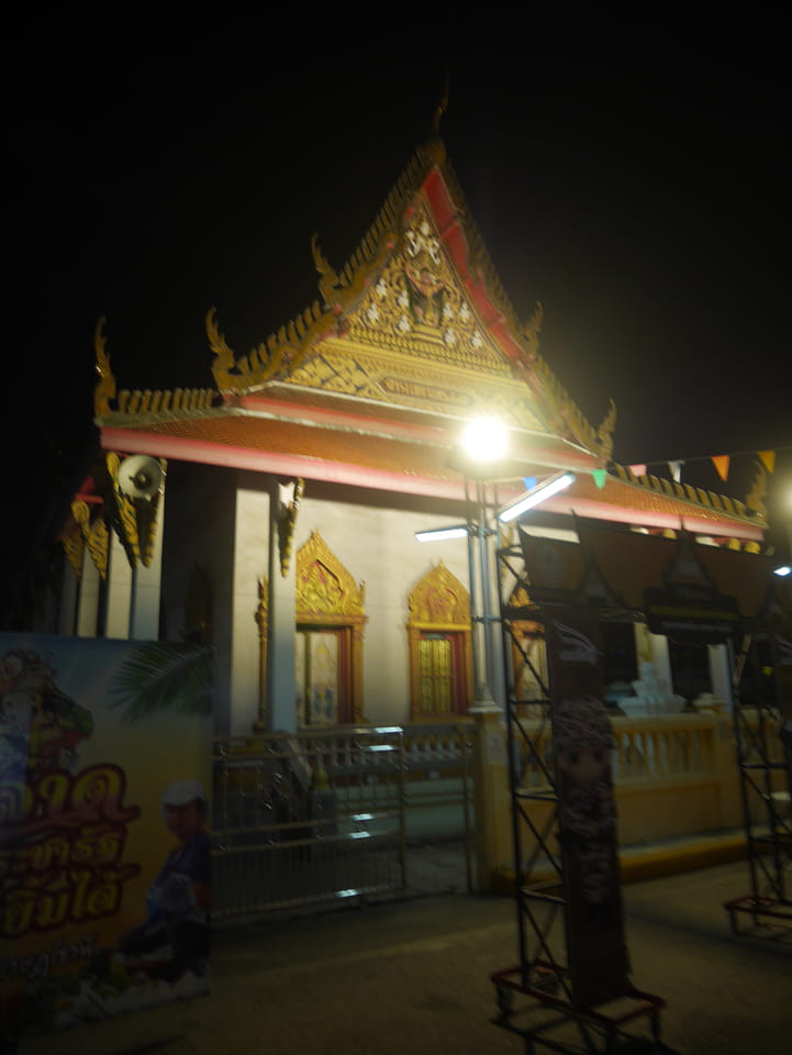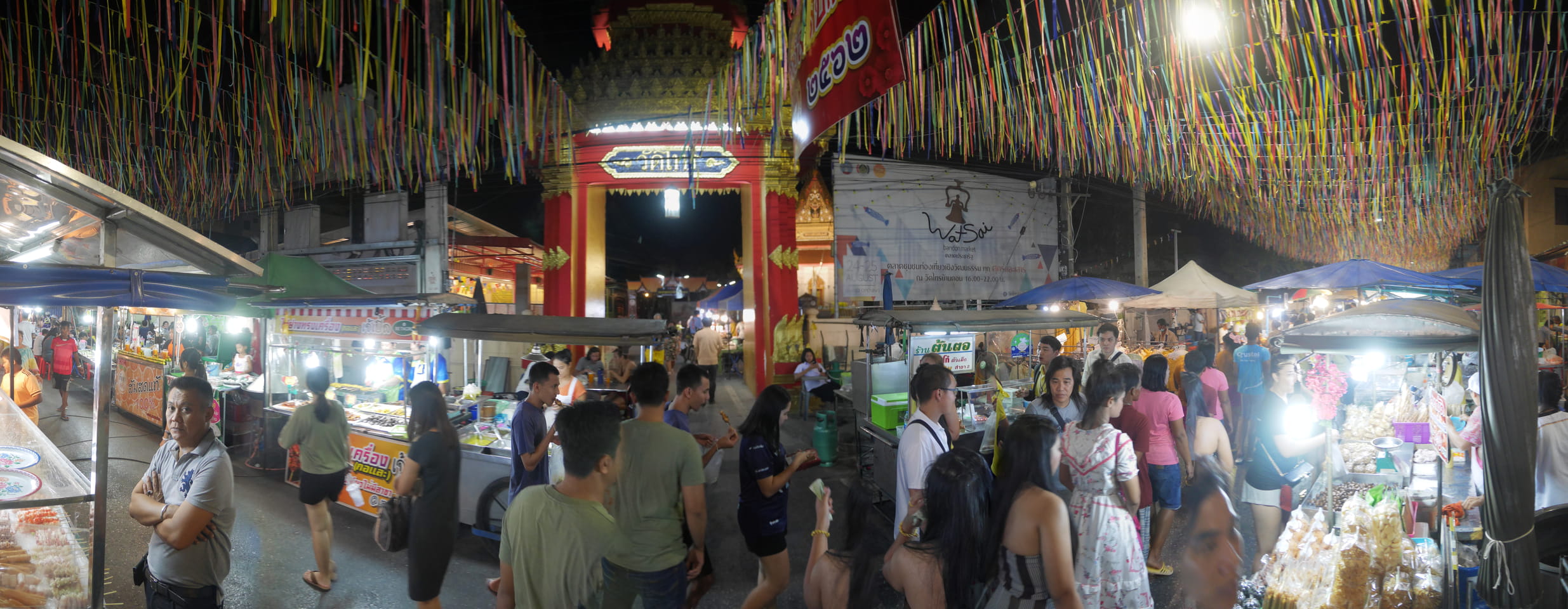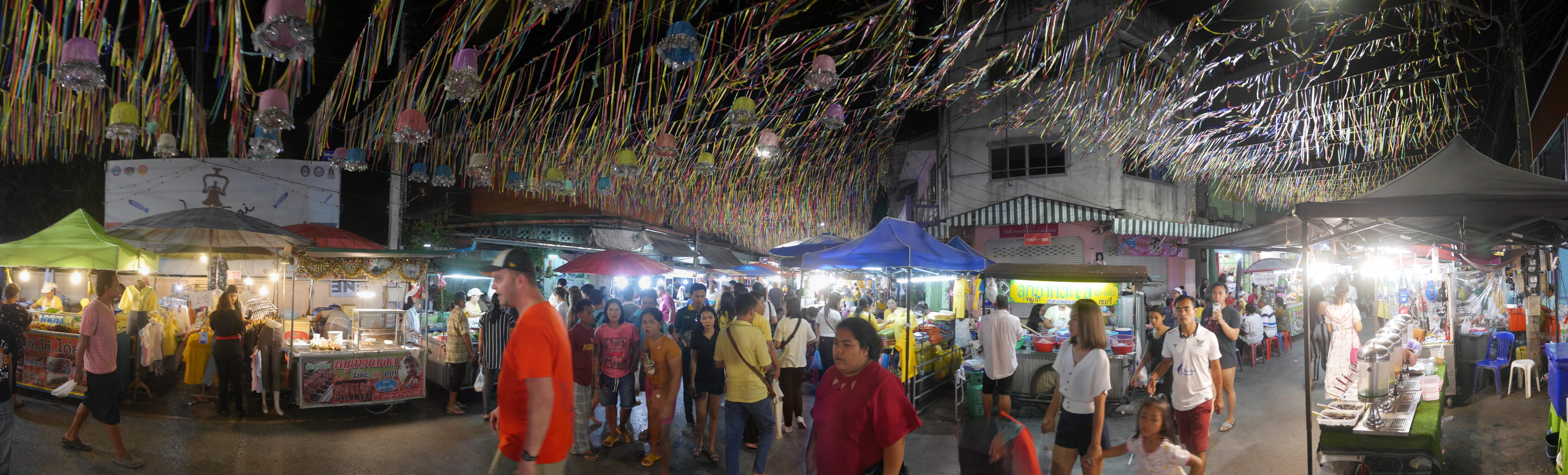 Weit nach Sonnenuntergang kam ich erst in’s Zentrum, drehte eine Runde über den Nachtmarkt und am Wasser entlang. Eine nette Atmosphäre mit Fitness/Tanzgruppe und eben typisch lokaler Thai Atmosphäre. Als ich die ca 25’ Video im Kasten hatte, wollte ich was essen. Ein Typ schüttelte Thai untypmisch die Hand und machte Druck zur Bestellung. Also OK – Shrimp Pad Thai. Dann nebenan noch ein Lime Soda. Das Limonen Wasser kam 50 THB, was ungefähr das Doppelte des normalen Preises ist. Der Typ dann wollte nicht diskutieren und OK, kann ich verschmerzen. Das Pad Thai auch 50 THB was OK ist, nur war die Qualtät mies. Das schlechteste Pad Thai mit harten Nudeln und lieblos ungerupften Shrimps. Leicht mürrisch heute wollte ich den anderen Touris vom Laden abraten aber naja, lies es dann doch.