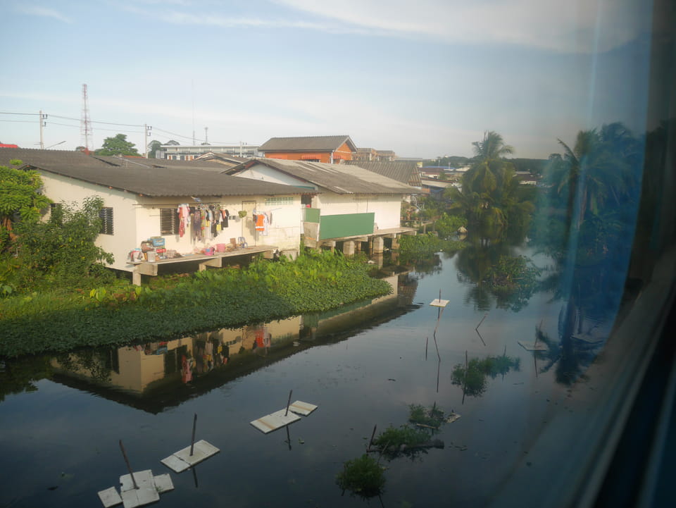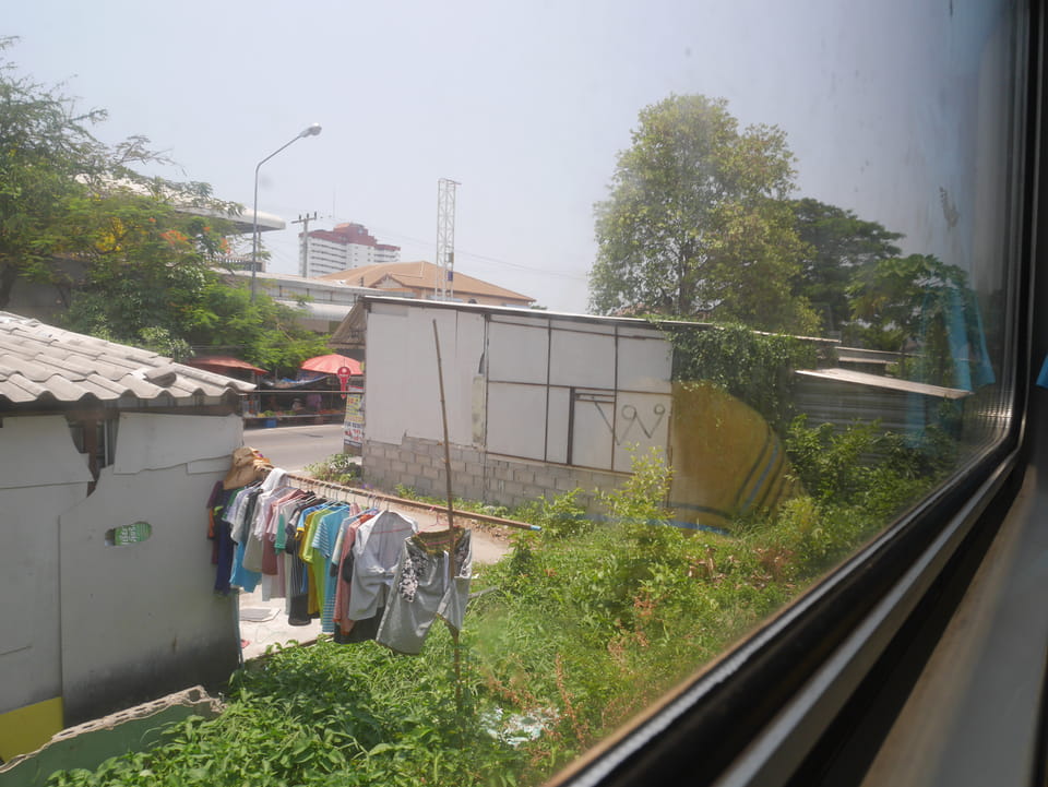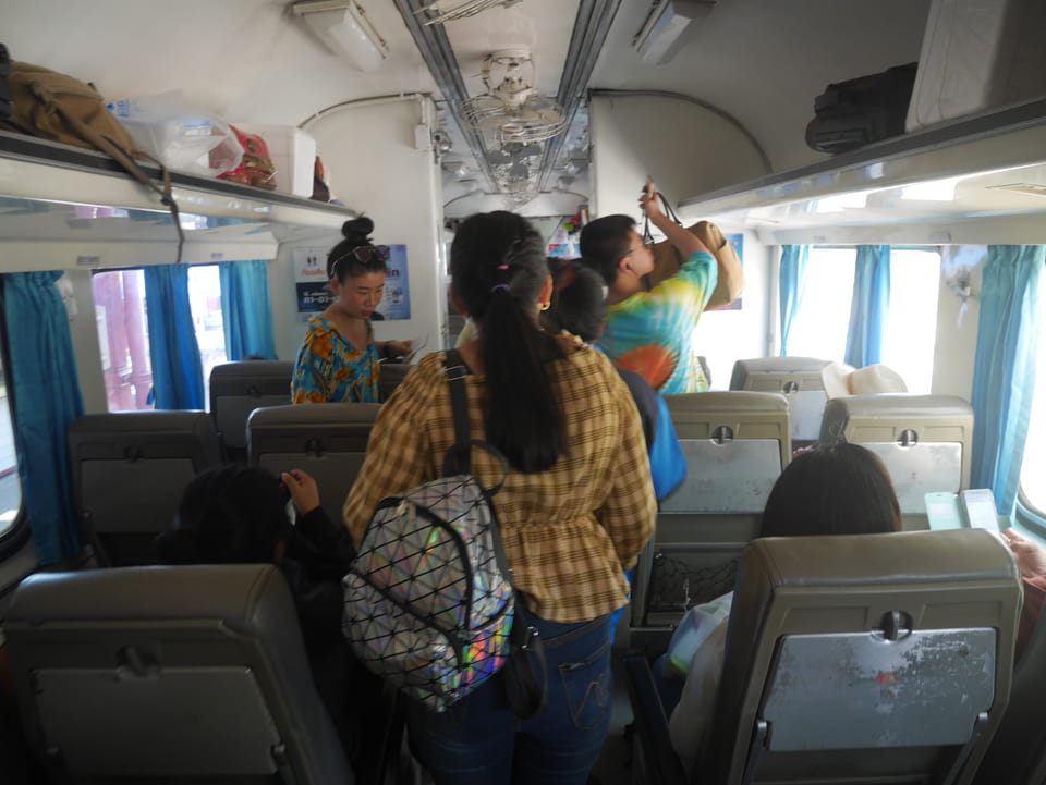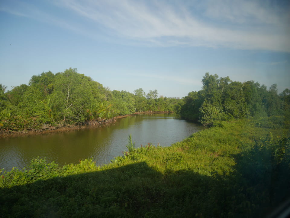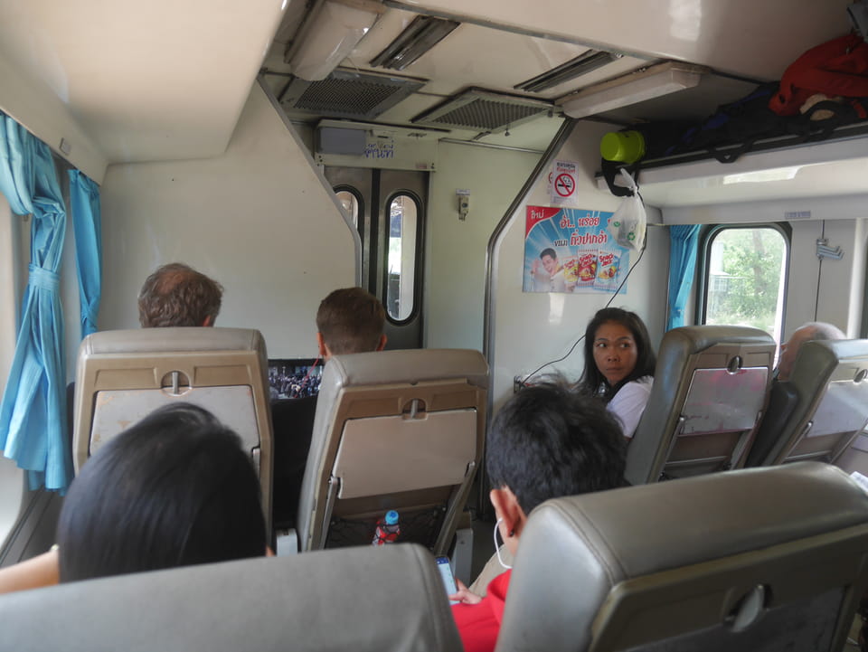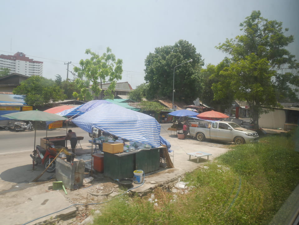 Der Zug kam schließlich, war kurz und wurde entsprechend voll. Es wurde sogar nochmal ein Mittagsessen gereicht. Nun war ich wirklich satt. Zufrieden tuckerten wir durch die Landschaft. Kleine Orte in Thailand, große Palmenwälder. Viel Grün noch vor dem Start der Regenzeit.