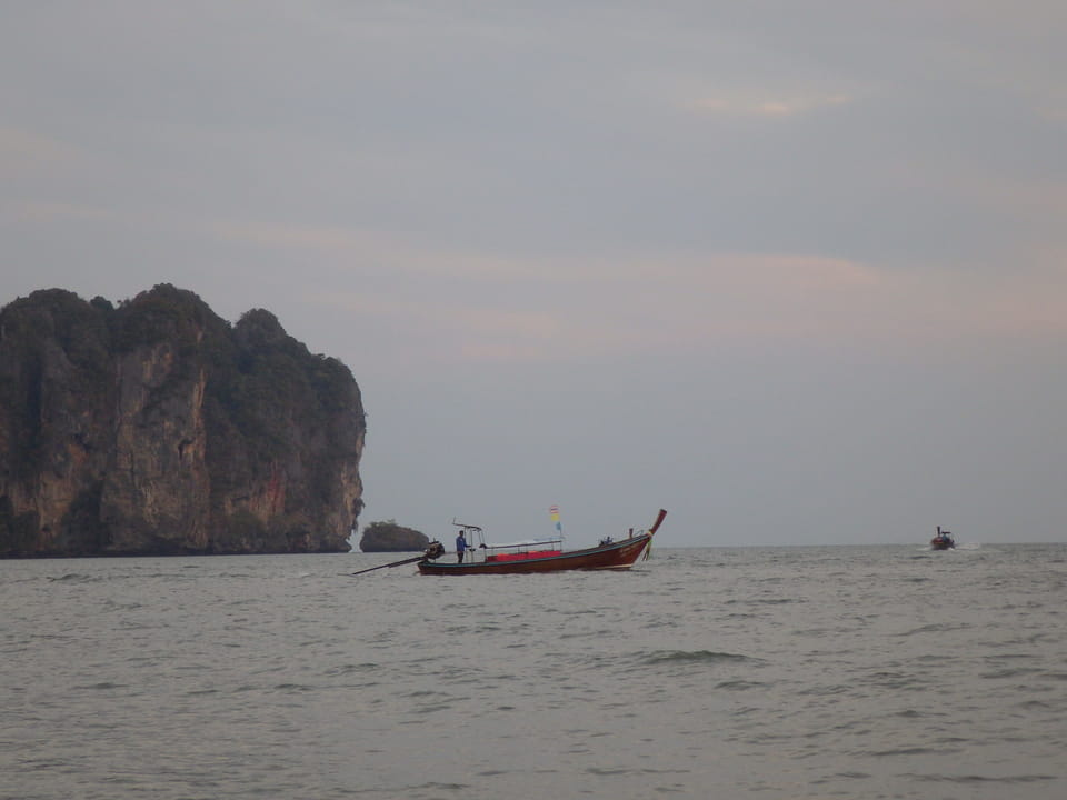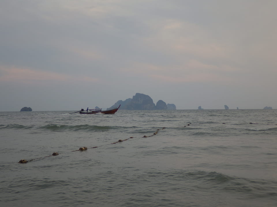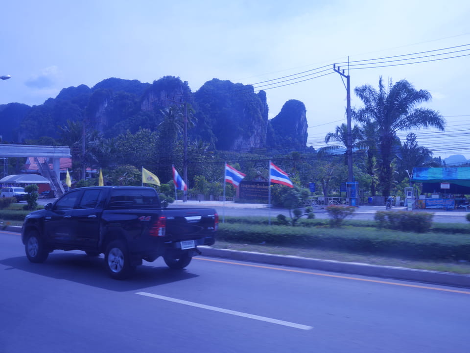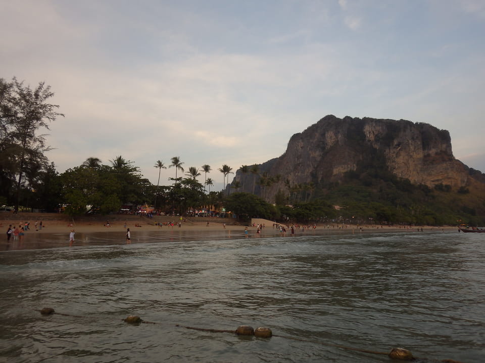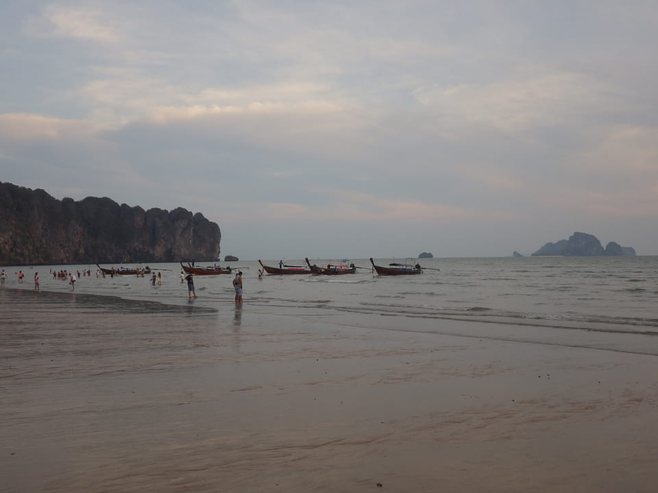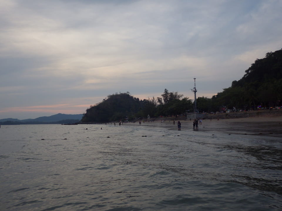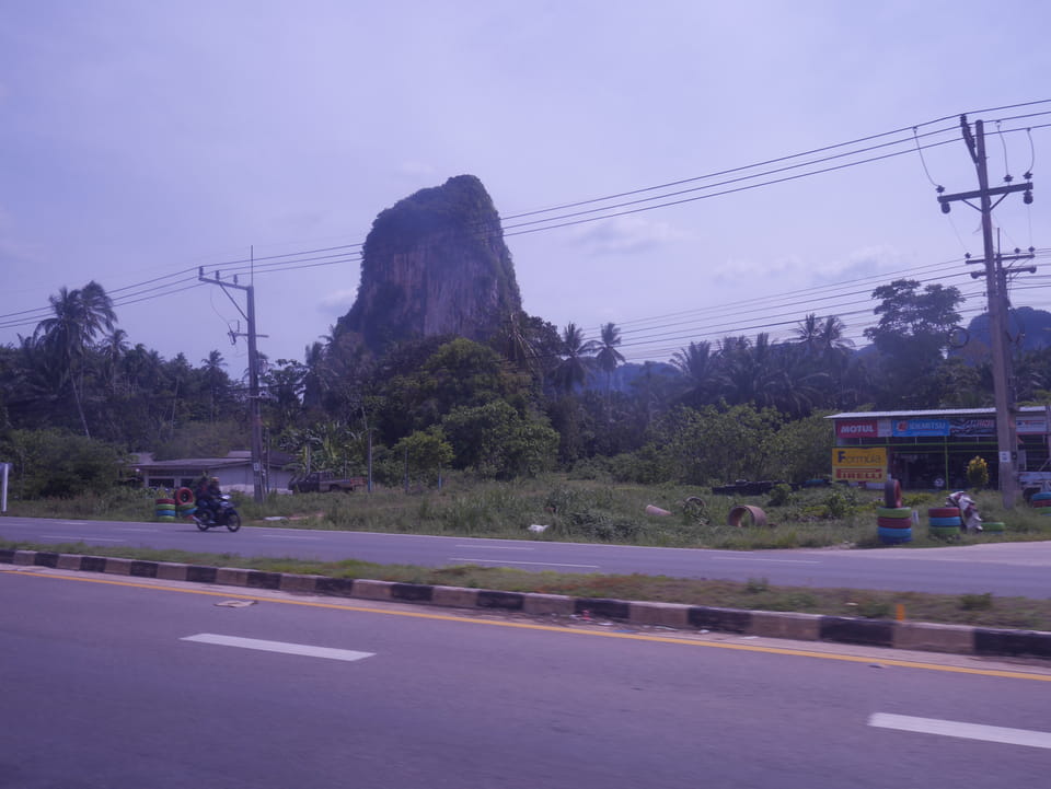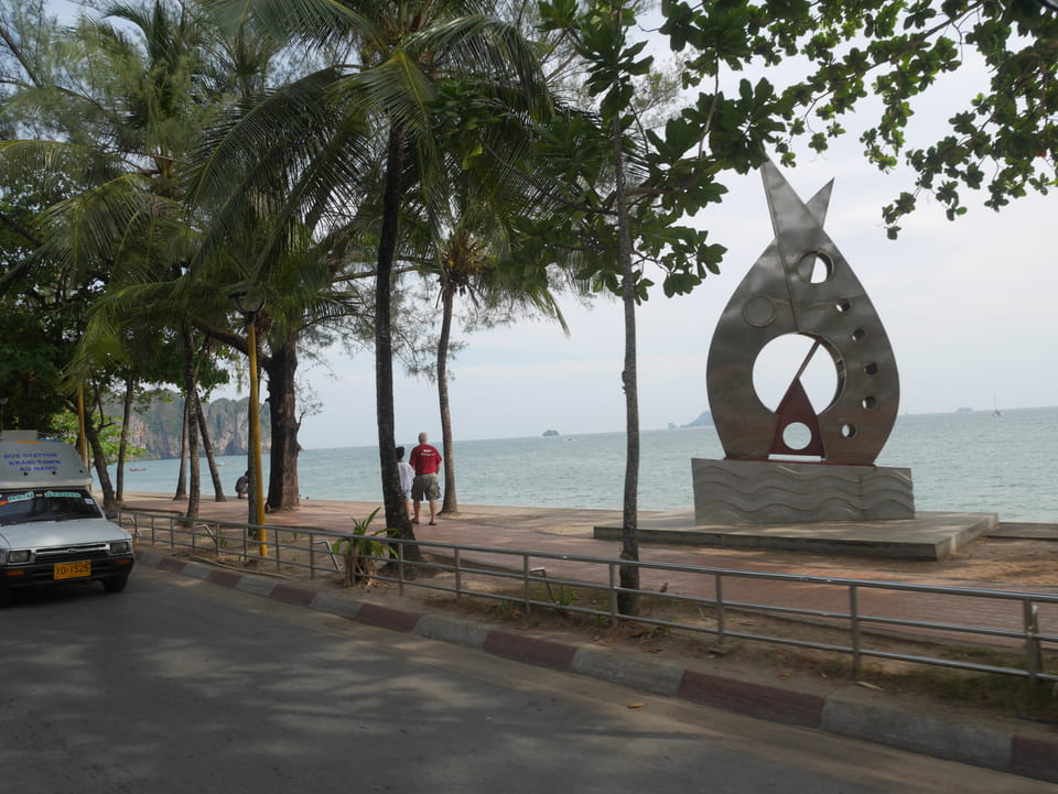 Im Van war ich wohl auch wieder der Einzige, der nach Ao Nang fuhr, denn außerhalb von Krabi Town wurde ich in einen Songthaew umgeladen. Der fuhr erst nach Krabi Town, wie ich es kannte und wartete da an einem 7-11, in dem ich vor Jahren auch mal einkaufte. Die Karre wurde volll. Erst, als auch die Trittbretter belegt waren ging’s los. Ein paar Spanier wollten zu einem Pier., der dann aber doch nicht der richtige für Railey Beach war. In Ao Nang gibt’s da mehr Zubringer. Ein paar Deutsche / Österreicher waren das erste Mal hier. Sie wollten den Strand sehen, der in Ao Nang zwar schmal ist aber durch die Länge selten überbelegt.