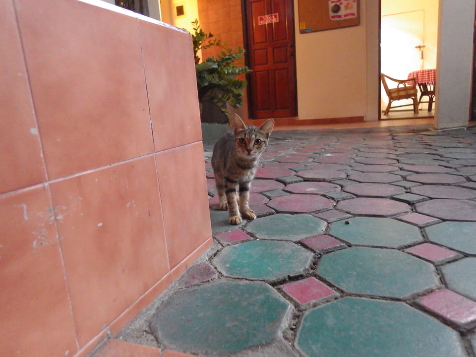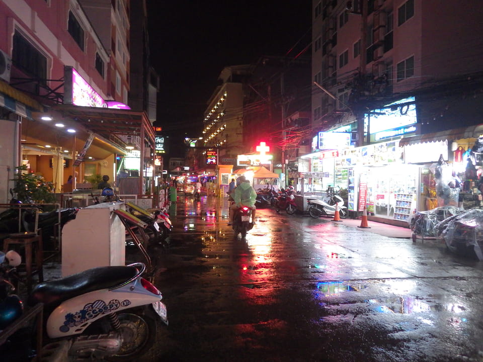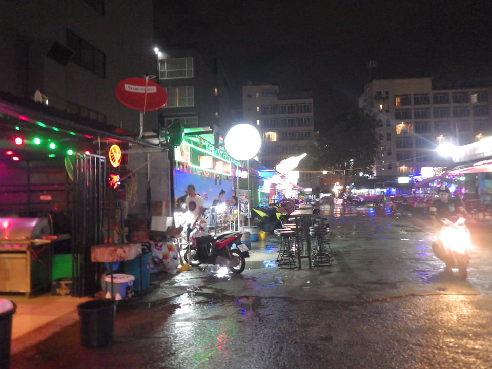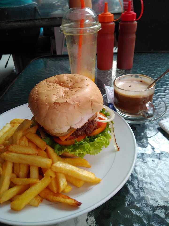 Nach einem weiteren Regenguss kam ich endlich vor die Tür und nicht so weit. Gleich im nächstbesten Restaurant holte ich mir etwas zu Essen. Erst ein Mango-Shake, während ich auf Burger und Cappuccino wartete. Der Burger war größer und besser als erwartet.
