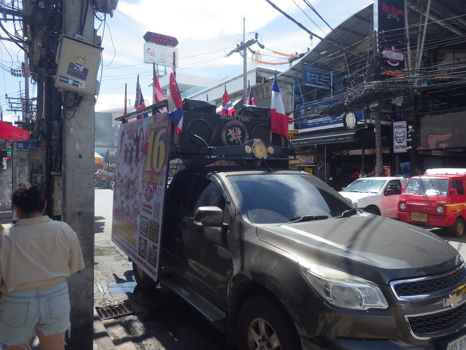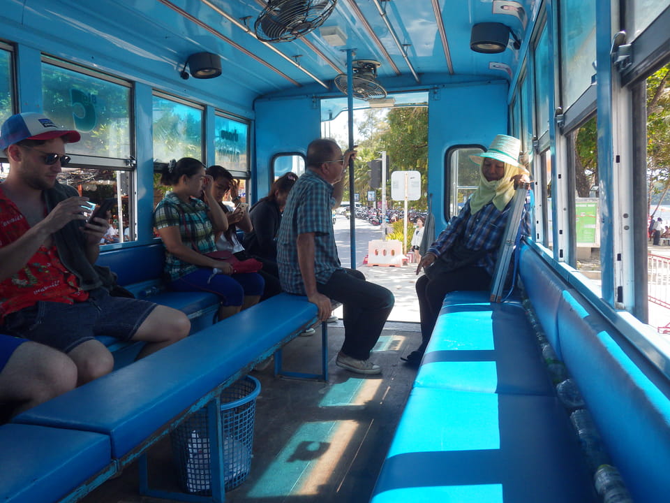Nach ein paar Stunden Herumsitzen und Verdauen war ich bereit für die Abreise. Ich sollte auf der Beach Road mit dem Bus nach Krabi Town fahren. In der Hitze mit dem Gepäck gab’s viele Kommentare vom Wegesrand neben den üblichen Zimmerangeboten. Ich schaffte es zum Strand und wartete nur kurz auf den Bus.