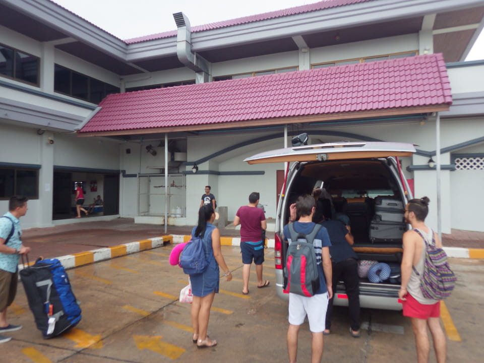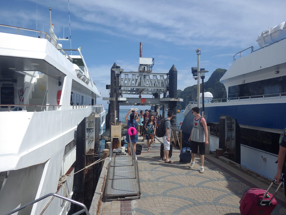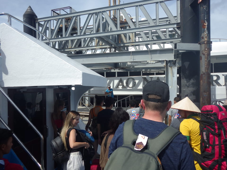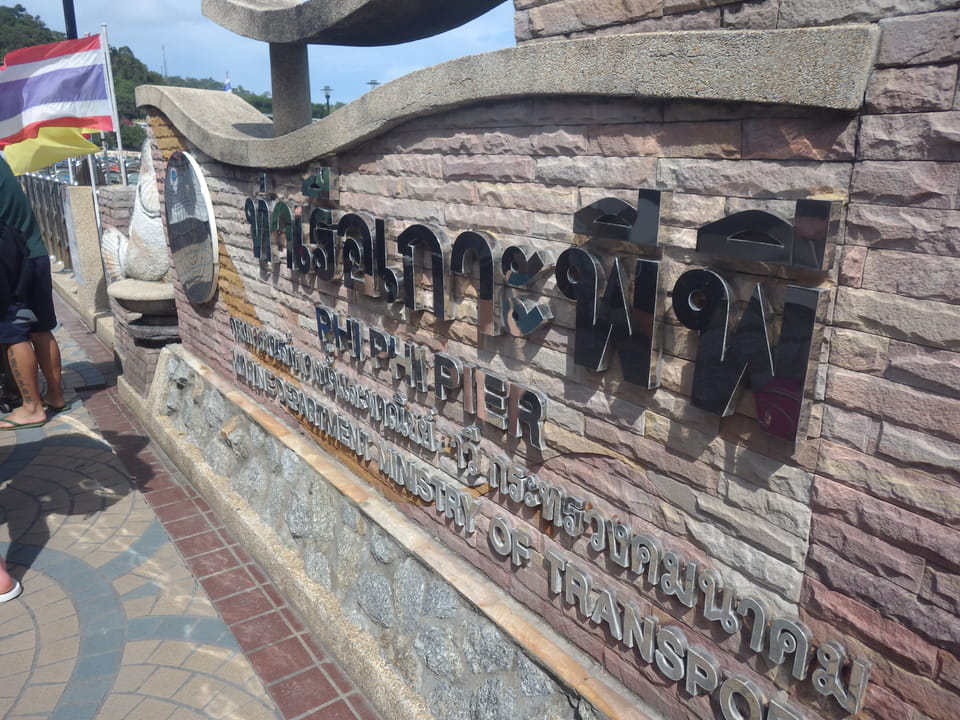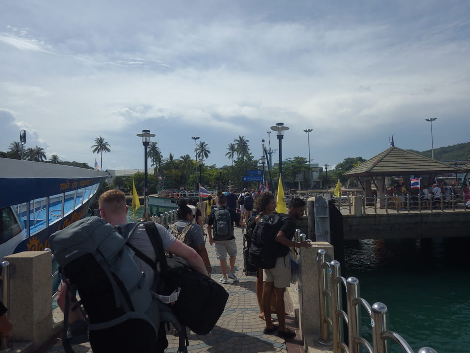 Dann ging’s los, ich erinnerte ihn an seine Zigarette. Mit dem Van zum Fährport (Rassada Pier). Der Van war voll, alle gaben ihre Voucher ab und bekamen einen Sticker. Außerdem gab’s dann noch Papiertickets und eine Plastik-Karte, die man in die Personenschleuse einwerfen musste.