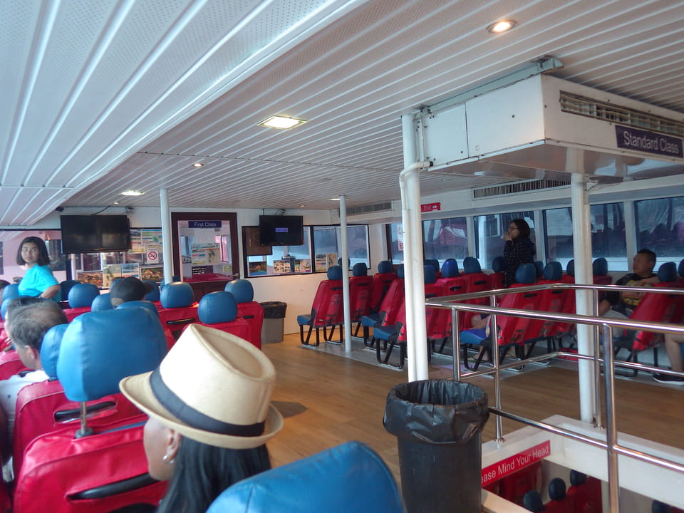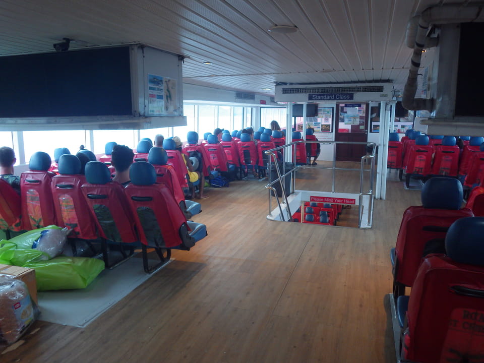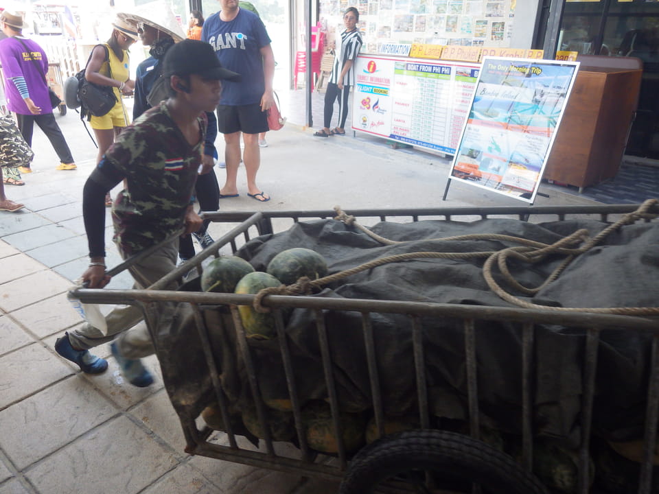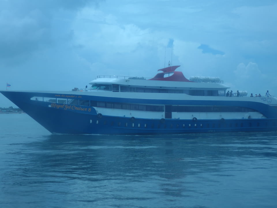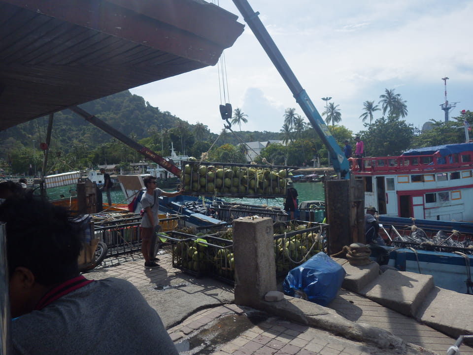 Dann ging’s los, ich erinnerte ihn an seine Zigarette. Mit dem Van zum Fährport (Rassada Pier). Der Van war voll, alle gaben ihre Voucher ab und bekamen einen Sticker. Außerdem gab’s dann noch Papiertickets und eine Plastik-Karte, die man in die Personenschleuse einwerfen musste.