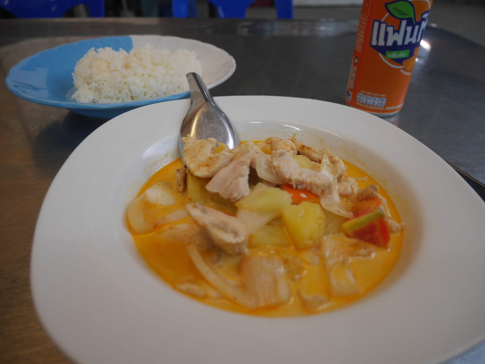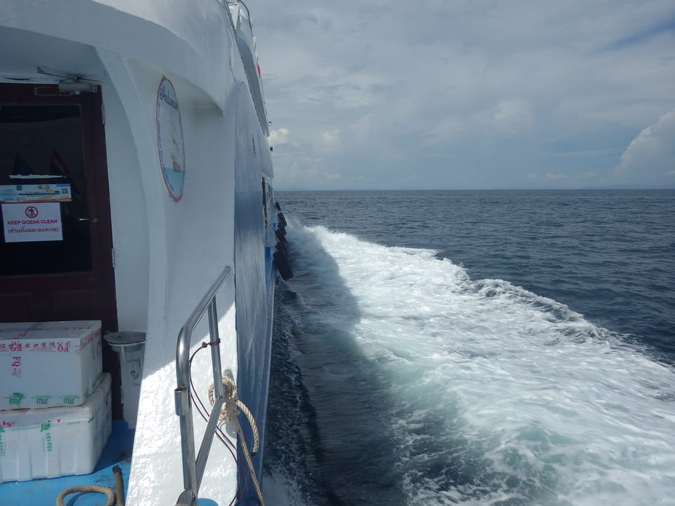 Ich hatte einen gute Sitzplatz und Hunger. Eine Weile lagen wir noch an, dann gegen 12:45 endlich ging’s los. Ich holte mir eine Instant-Suppe (50 THB) und döste danach bissel herum, solange es noch Handynetz gab.