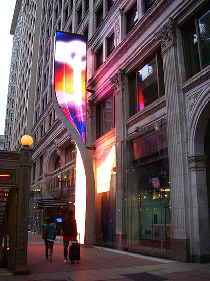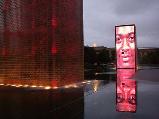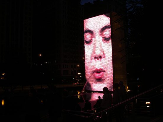 Riesige Videoziegel waren mit einem Brunnen verbunden. Da machten die Videogesichter den Mund auf und echtes Wasser sprudelte hervor. Alles sehr lustig.