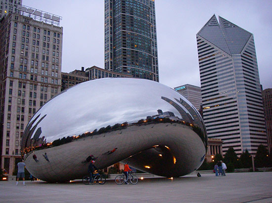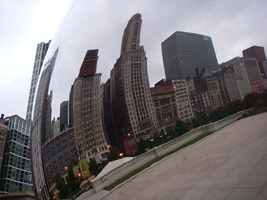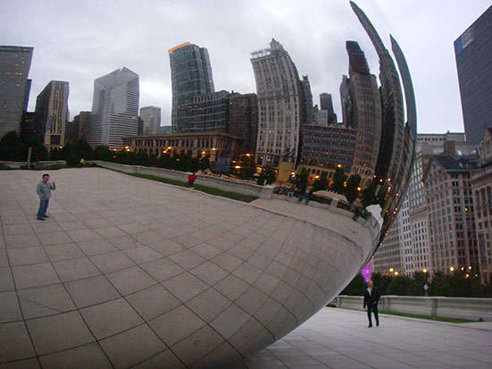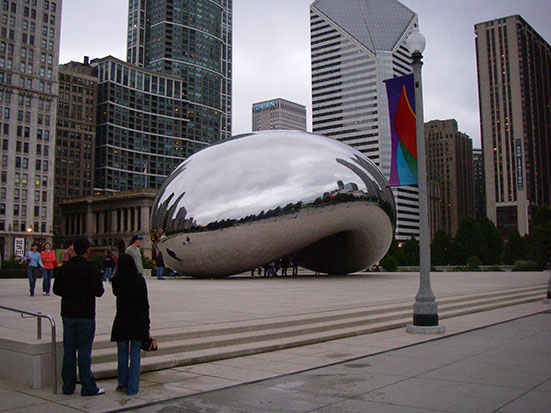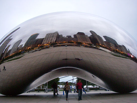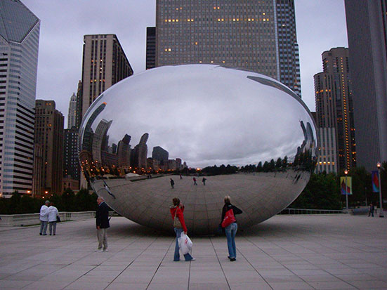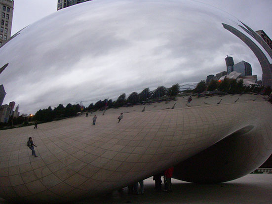 Im Millennium-Park bestaunte ich eine Edelstahl Skulptur. Auf Hochglanz poliert sieht man eigentlich nur die die Umgebung und sich selbst im verzerrten Spiegelbild. Das Teil ist abe so groß, dass man sogar unten durch laufen kann. Noch mehr Verzerrungen, Klasse.