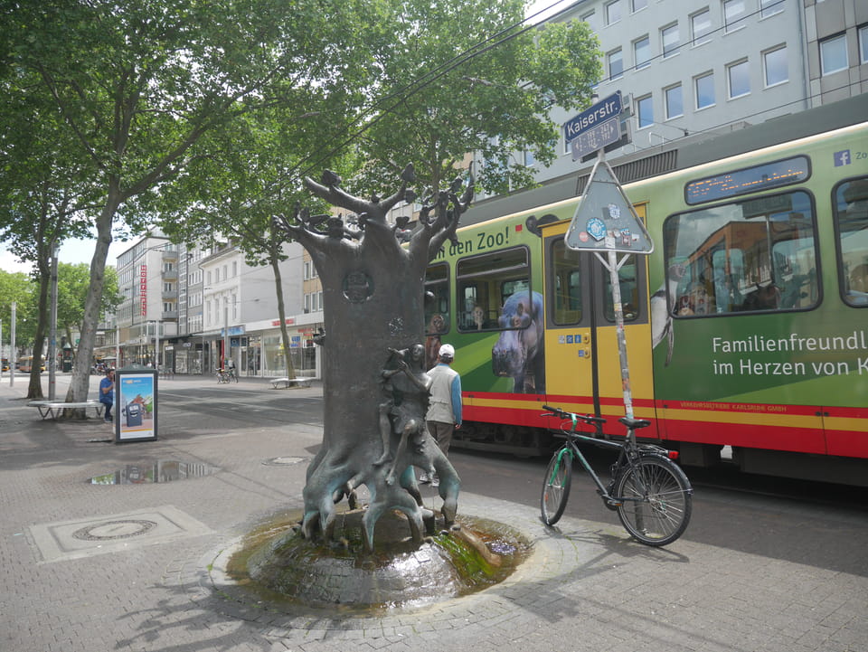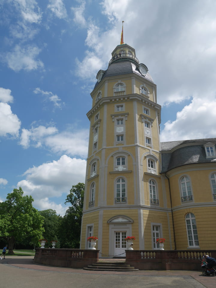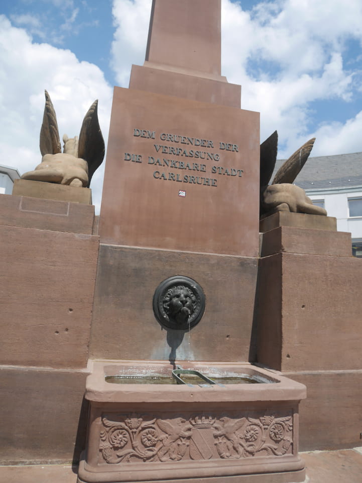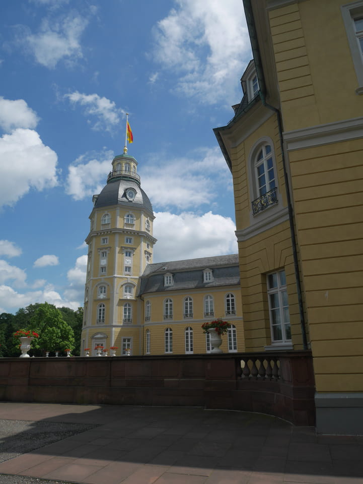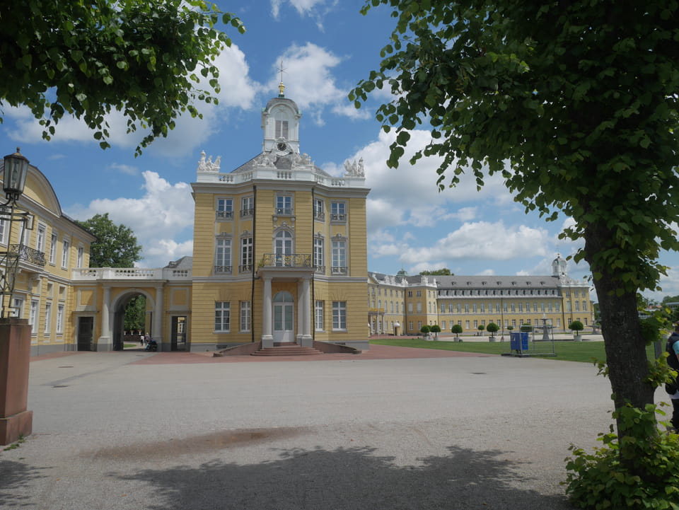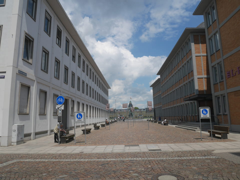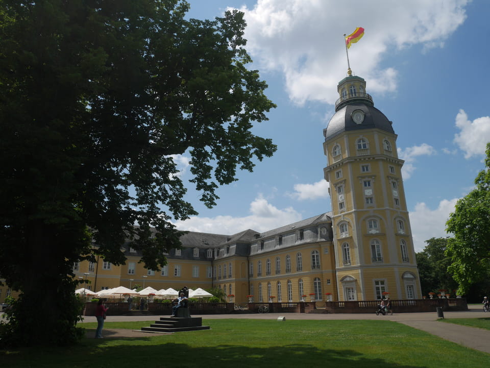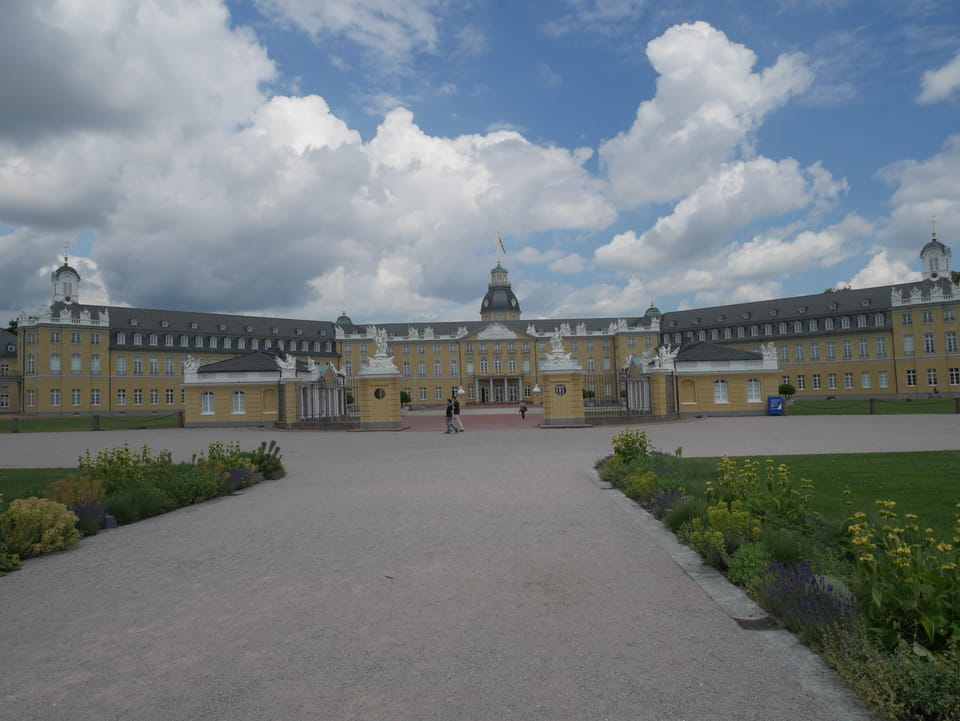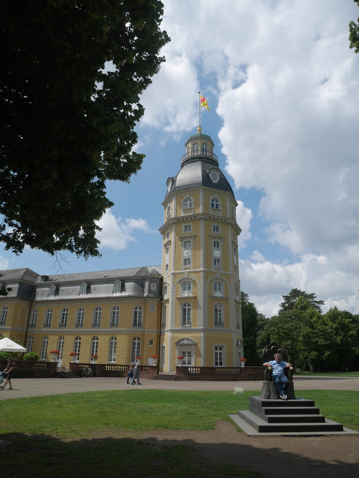Die Stadt liegt kaum auf der Touristenroute. Ich kannte Karlsruhe nur als Sitze des Budesverfassungsgerichts. Ich ging erst mal zur Gepäckannahme, doch der Automat da nahm nur €1 Münzen. Ich ging also zu McDonalds daneben, kaufte einen Cappuccino und lies mir den Rest des €20 Scheins in €1 auszahlen. Dann alles verstaut, startete ich das Video.