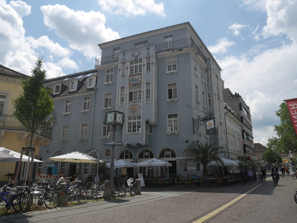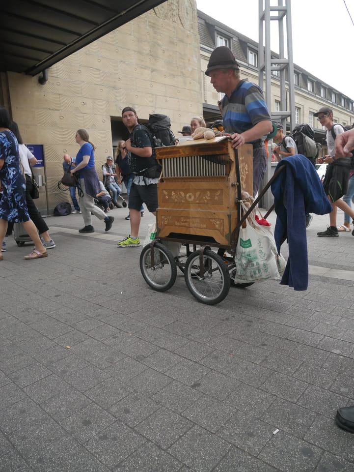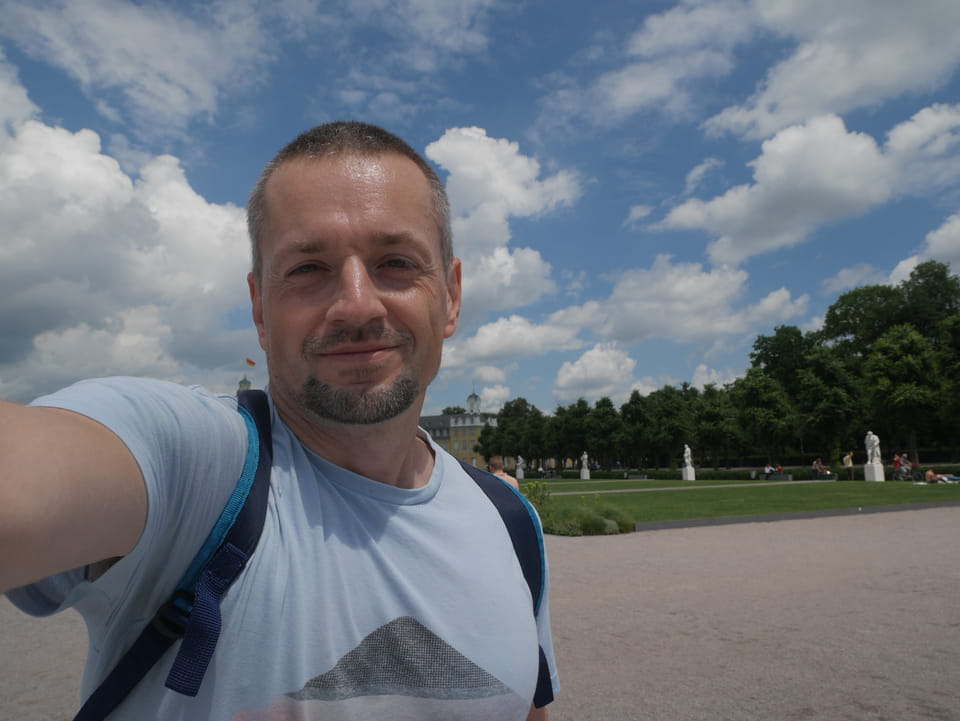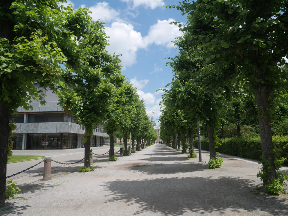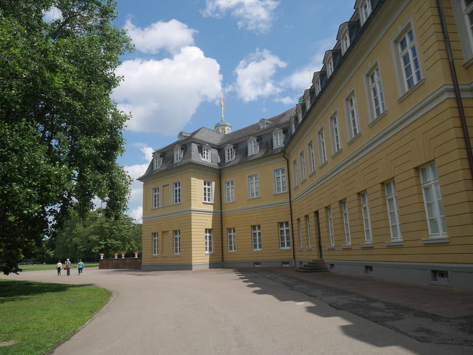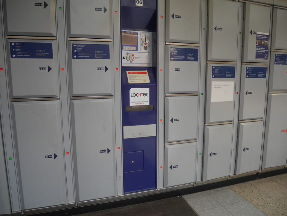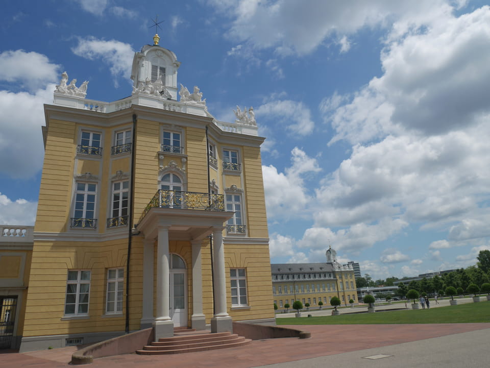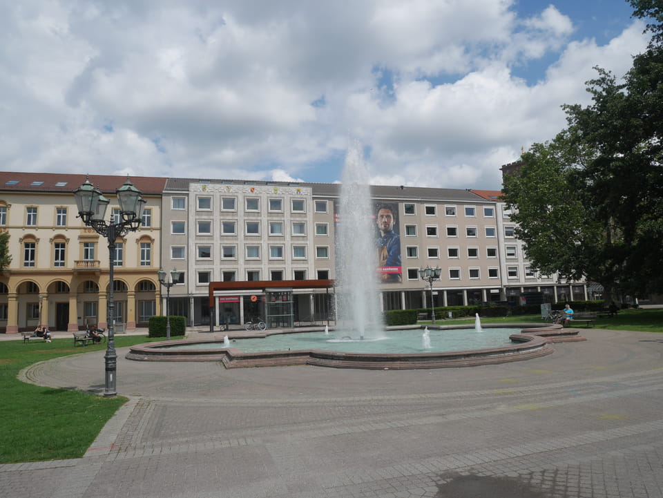 Die Stadt liegt kaum auf der Touristenroute. Ich kannte Karlsruhe nur als Sitze des Budesverfassungsgerichts. Ich ging erst mal zur Gepäckannahme, doch der Automat da nahm nur €1 Münzen. Ich ging also zu McDonalds daneben, kaufte einen Cappuccino und lies mir den Rest des €20 Scheins in €1 auszahlen. Dann alles verstaut, startete ich das Video.