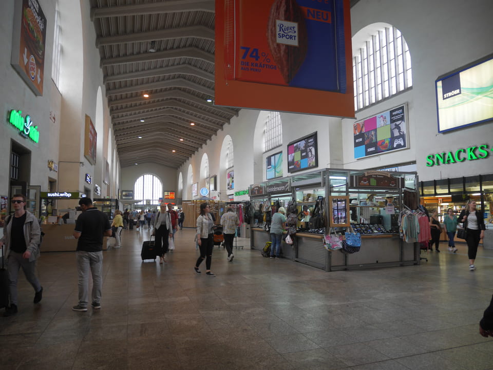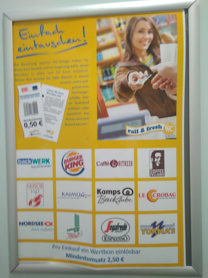 Toilette für €1 mit €0,50 Rabattmarke in einigen Bahnhofsläden. Naja, erst mal eine Runde.