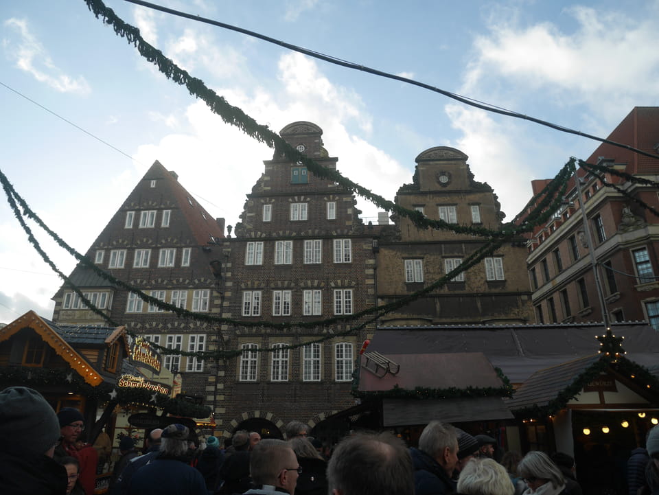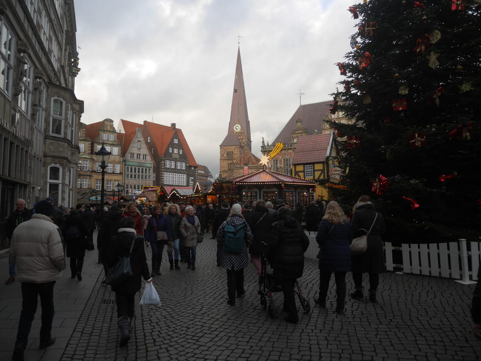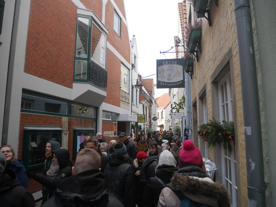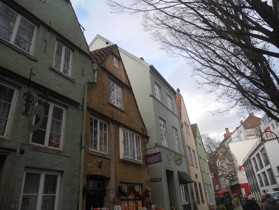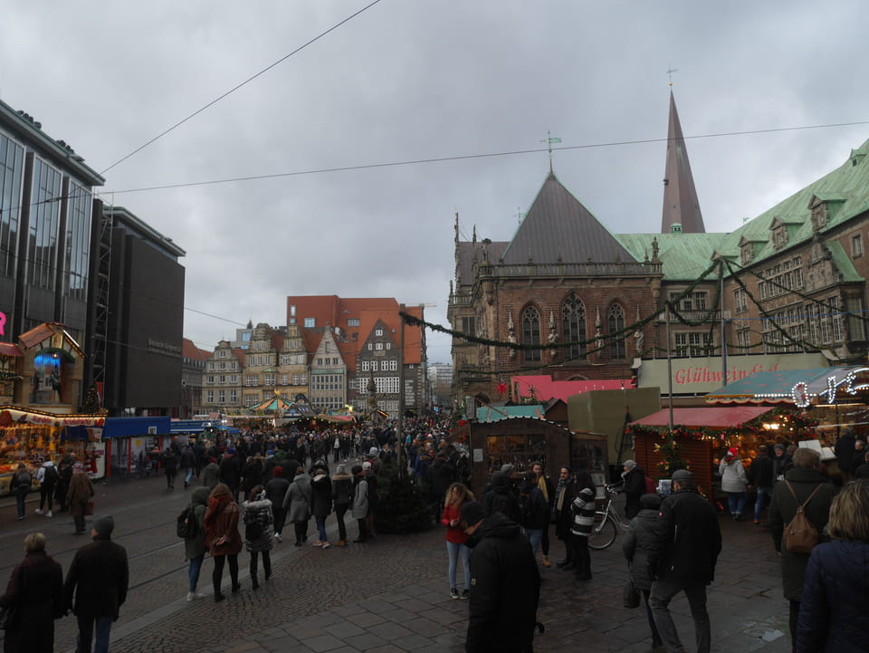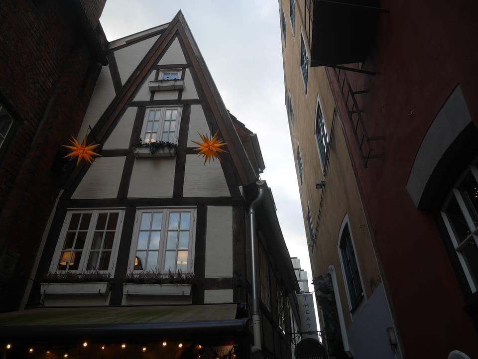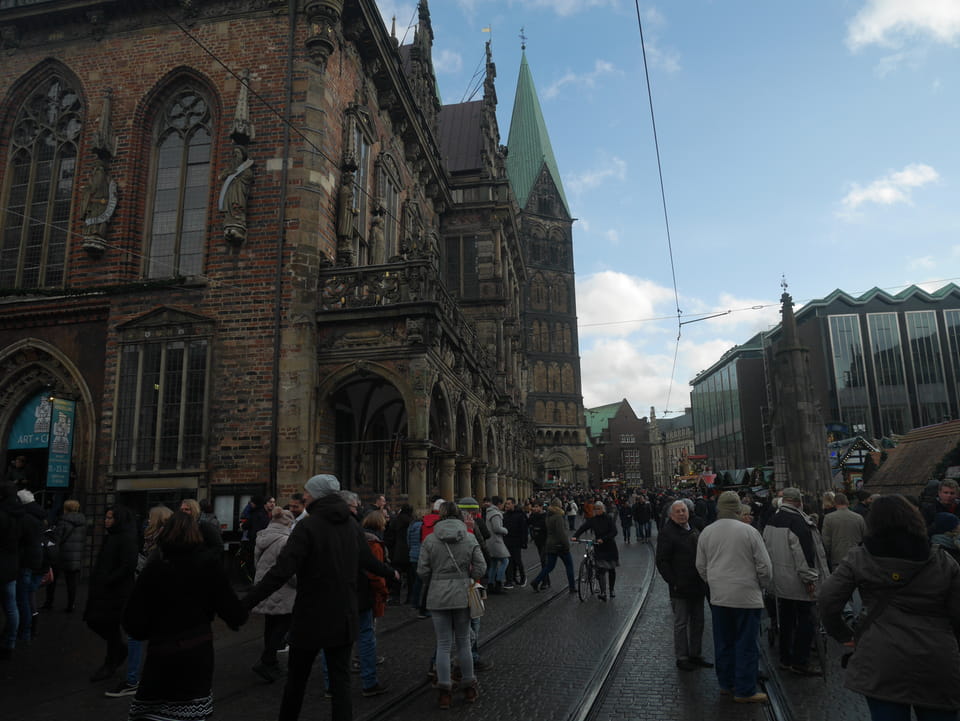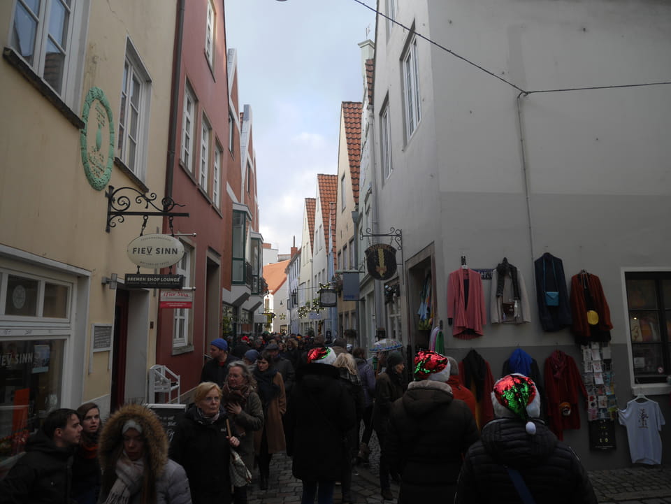 Selbst jetzt zum Mittag waren die Straßen voller Leute. Der große Weihnachtsmarkt war schwer zu filmen. Ich kam noch in den Dom und schaute mich dann auch außerhalb der Innenstadt um. Ich hatte ja keine Ahnung von Bremen oder stellte mir das ganz anders vor. Die Stadt schien aber echt nett. Das Schnoorviertel hatte etliche alte Häuser und extrem enge Gassen. Super war’s!