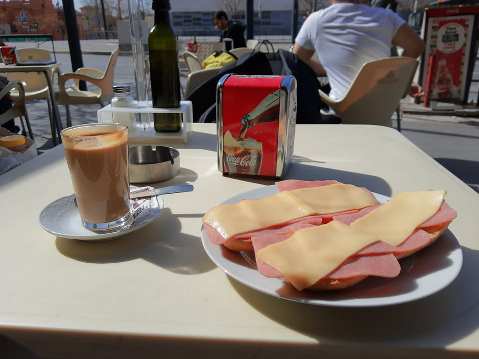 Wenig Schlaf aber rechtzeitig ausgecheckt. Mit dem Bus 22 fuhr ich zum Busbahnhof. Ich wusste, dass 12:45 ein Bus nach Malaga furh und hatte noch eine halbe Stunde Zeit. Also ein Frühstück mit Café con Leche und ‘nem Sandwich. Das Mixto schmeckte mir gar nicht. Lauwarmer Käse, kalte Wurst, nur das Brot war OK.